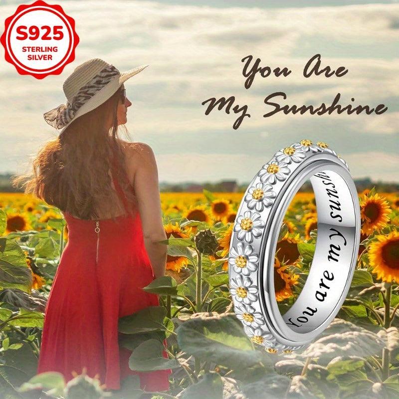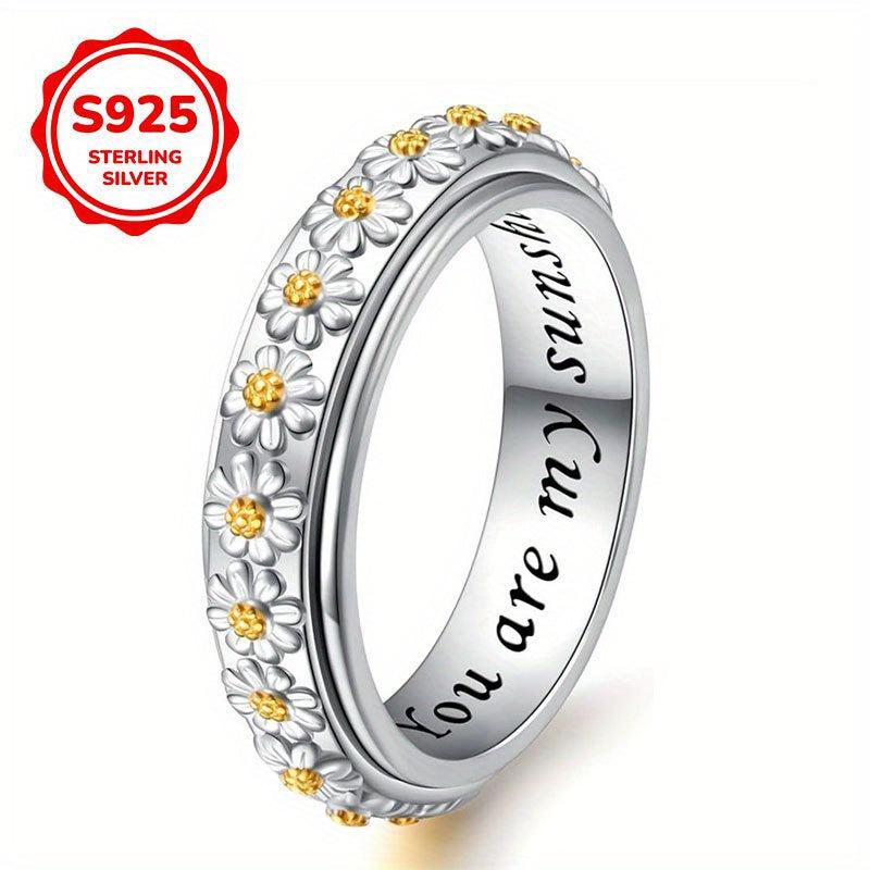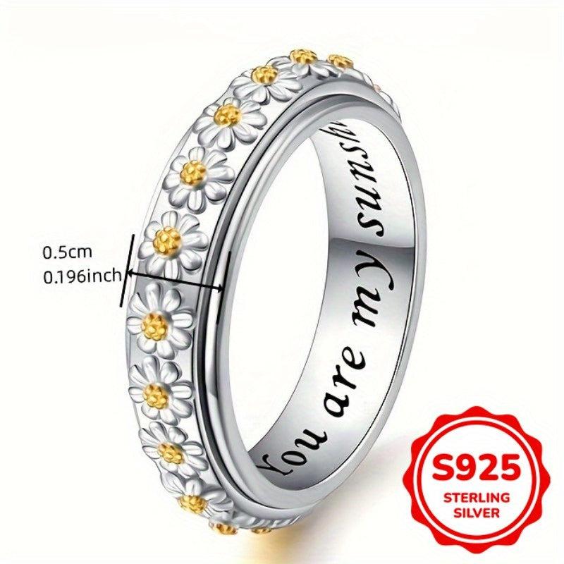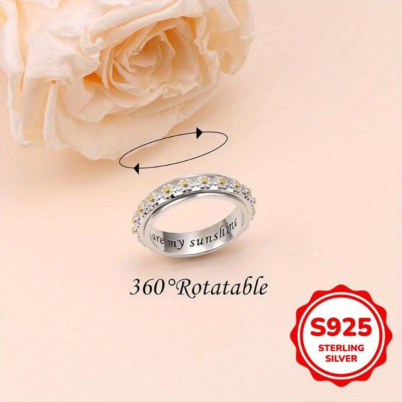 This rotatable anxiety ring features a two-tone design with a daisy flower accent. Made of 925 sterling silver, this casual holiday ring is perfect for everyday wear.