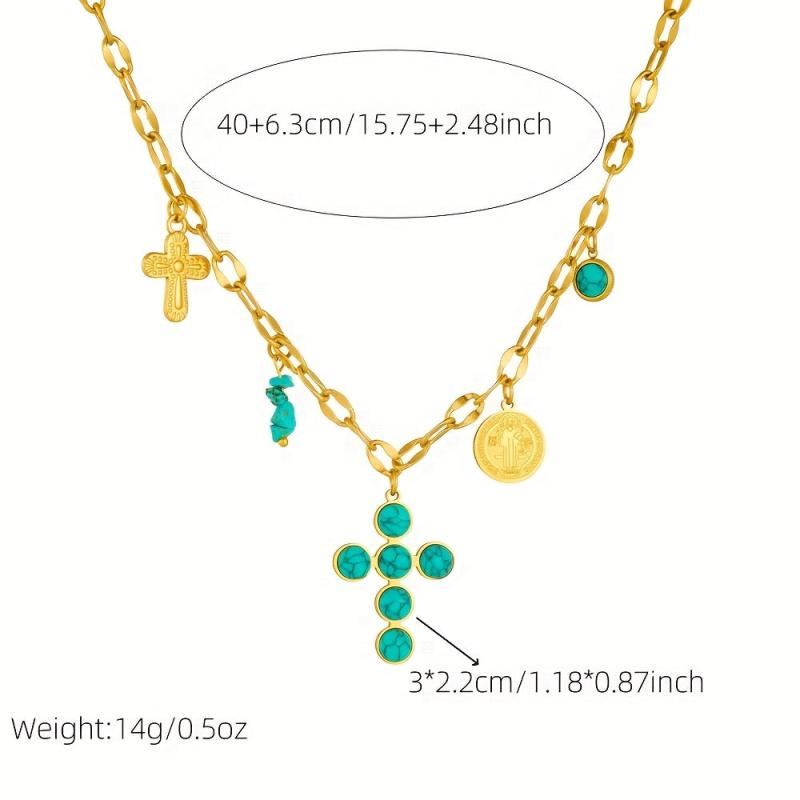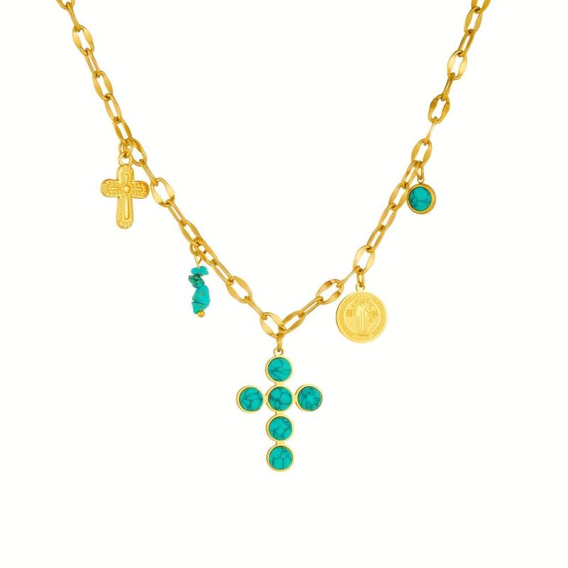 Elegant cross pendant necklace featuring a golden coin and turquoise bead design, crafted from durable stainless steel.