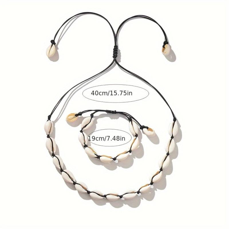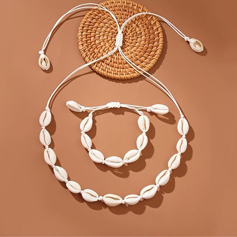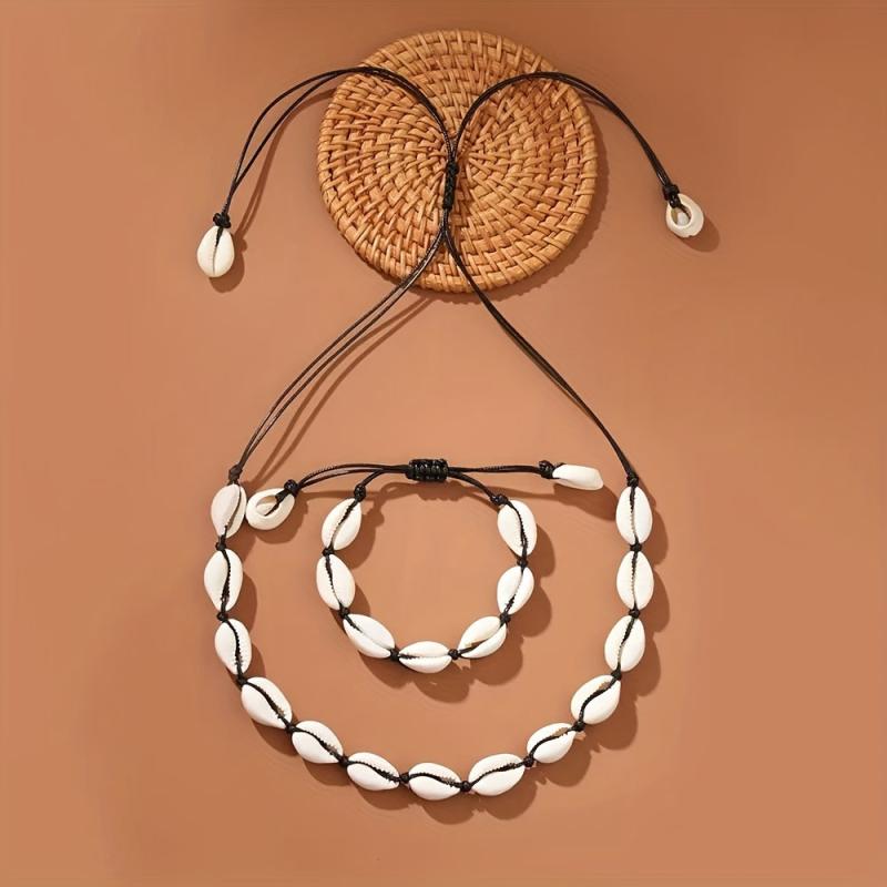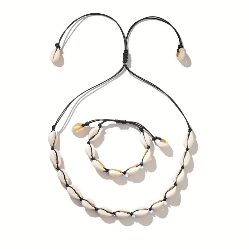 Complete your beach resort look with this versatile 2-piece set that includes a braided shell necklace and bracelet. Perfect for a bohemian style, this set is ideal for layering or wearing alone.