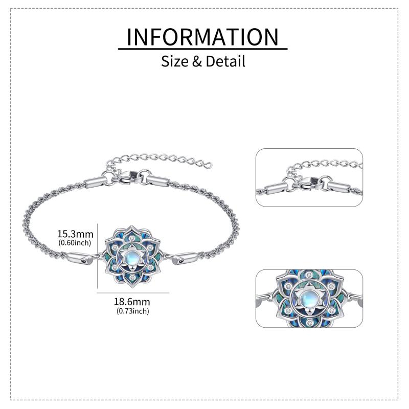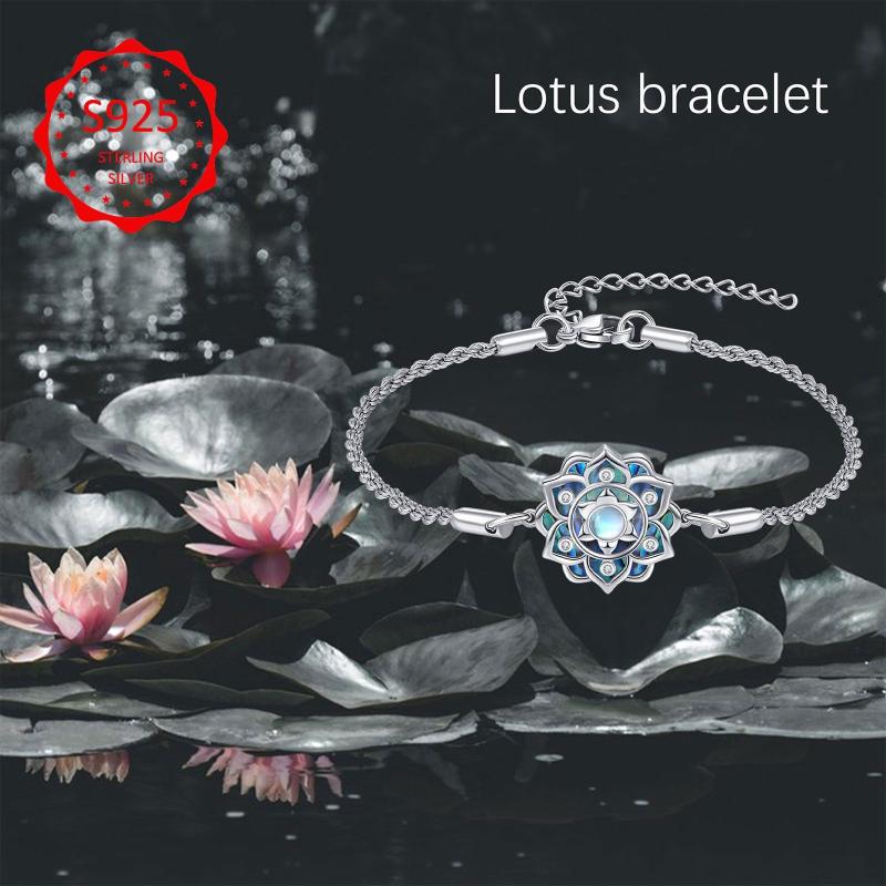 This stunning bracelet features synthetic moonstone beads and a lotus flower charm made of sterling silver with abalone shell accents. Perfect for yoga enthusiasts or anyone who loves unique and spiritual jewelry.