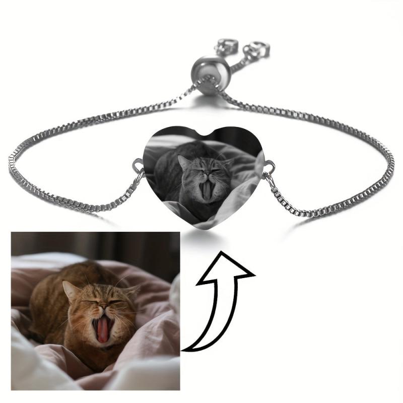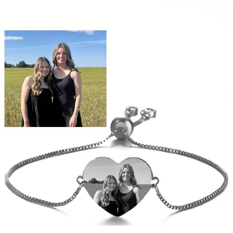 Create a one-of-a-kind look with this custom engraved photo bracelet featuring a heart chain design. Show off your personal style with this unique hip hop jewelry piece.