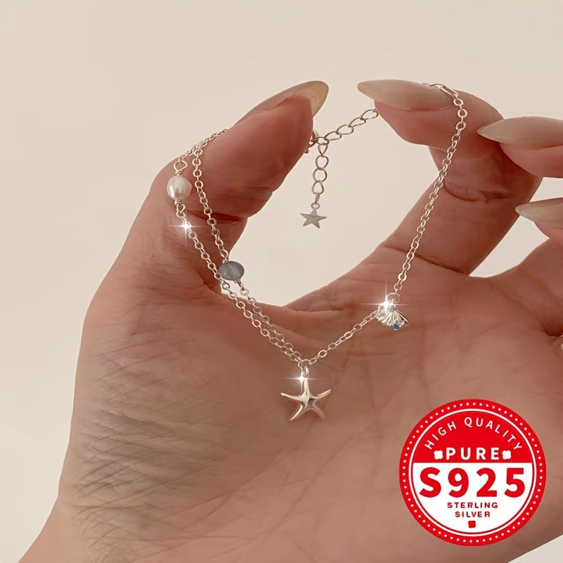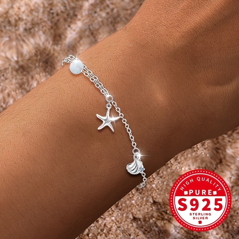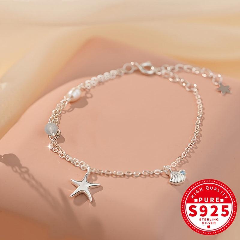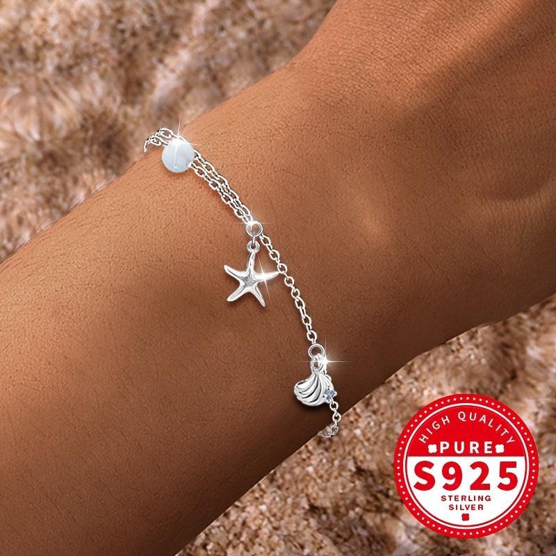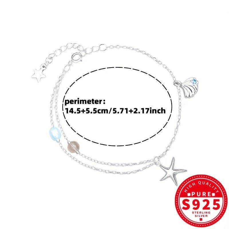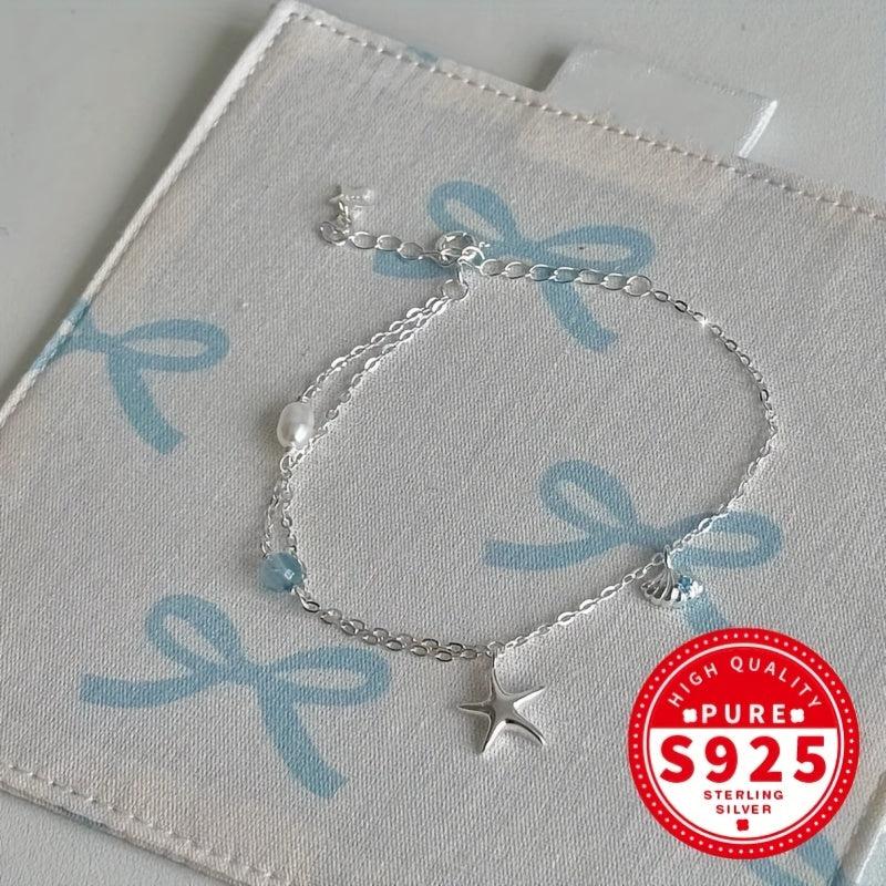 Adorn your wrist with this elegant S925 silvery bracelet featuring a starfish shell design, aquamarine and glass bead for a touch of ocean-inspired beauty. Perfect for the beach or everyday wear.
