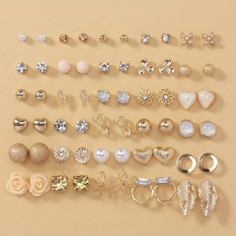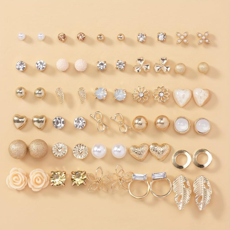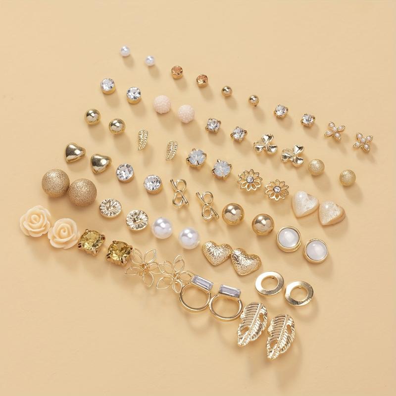 This set includes 30 pairs of stainless steel stud earrings featuring leaf, butterfly, heart, rhinestone, and flower designs. Perfect for everyday wear or special occasions.