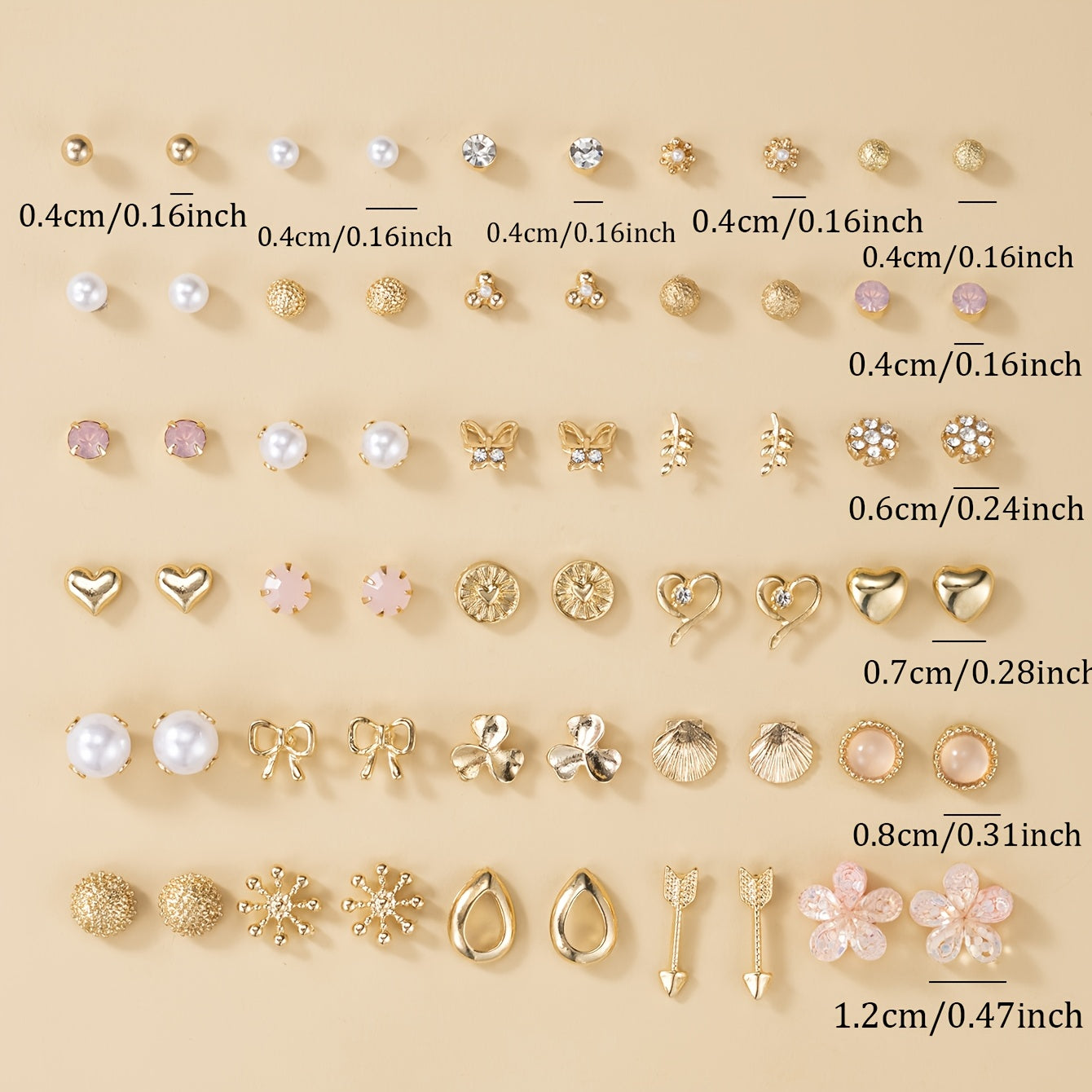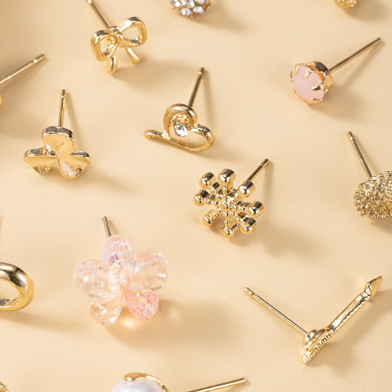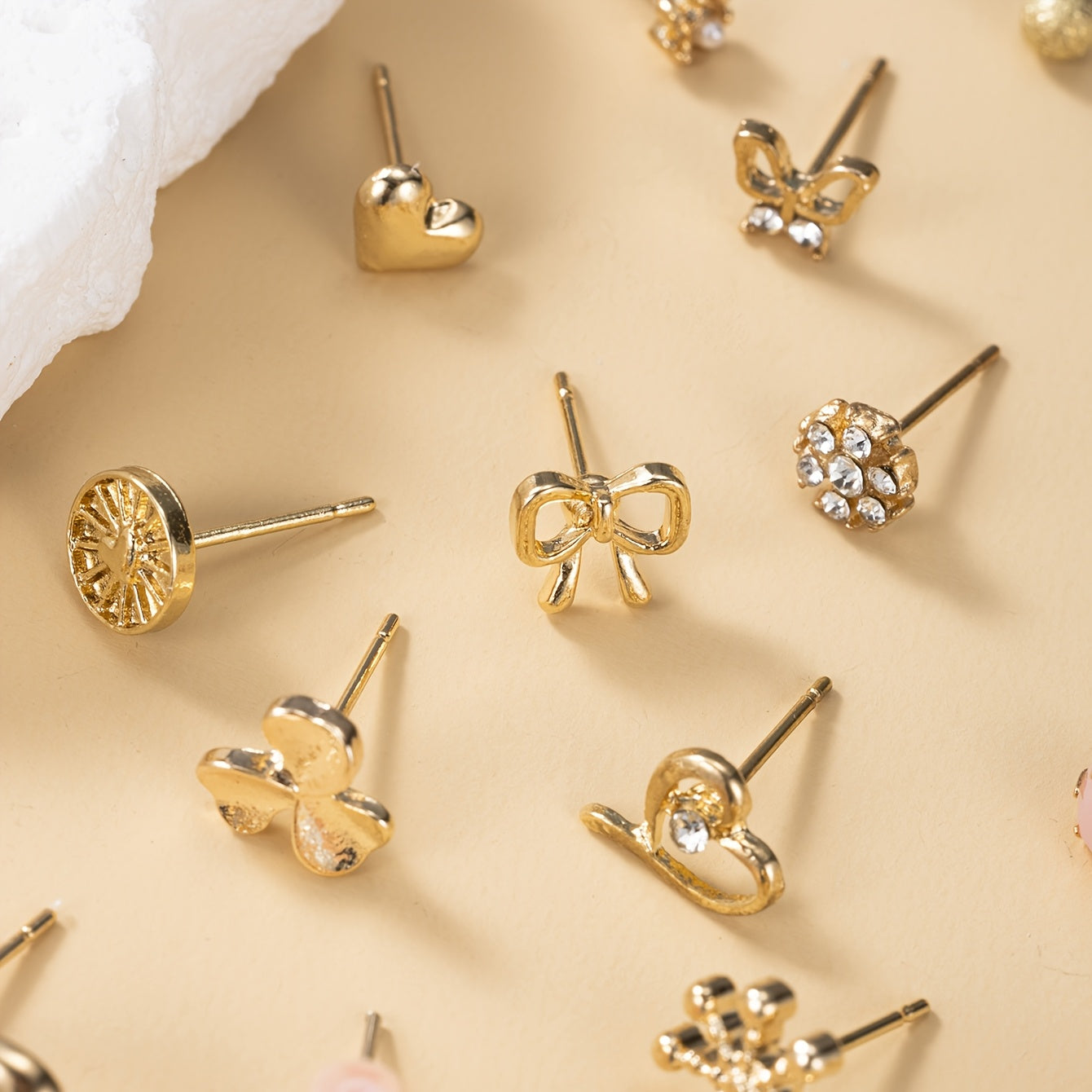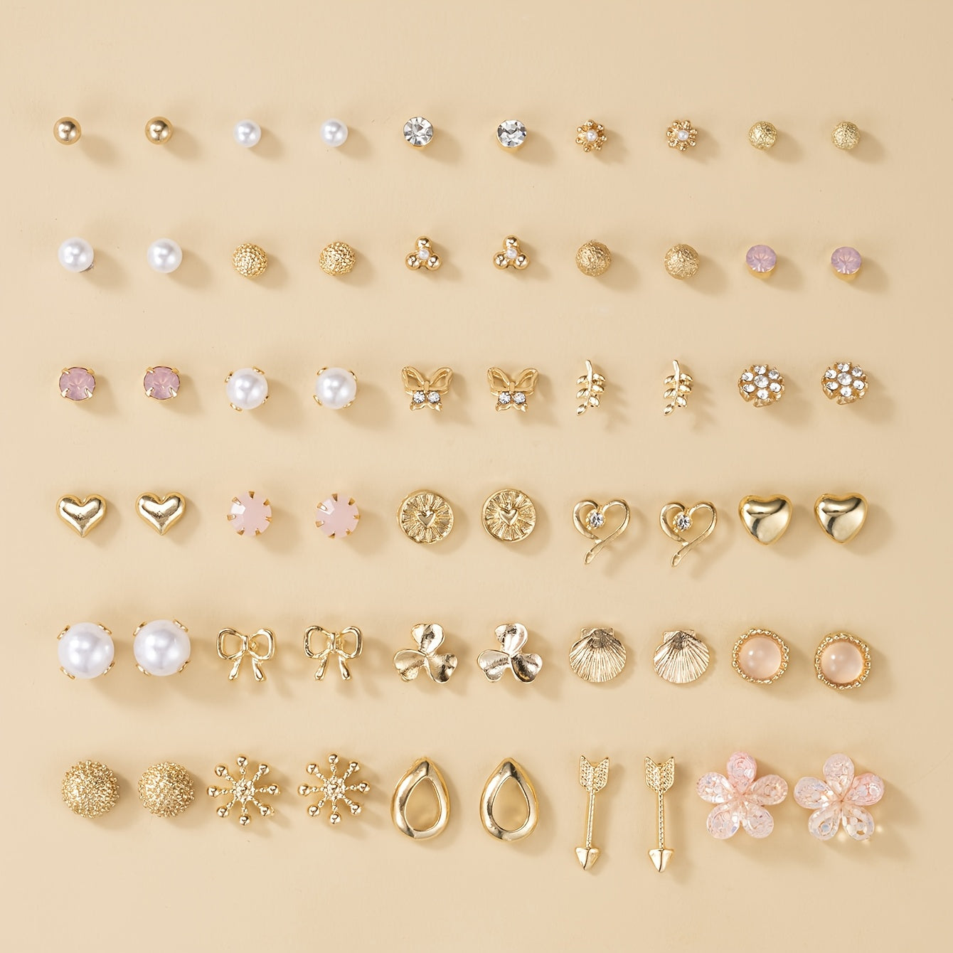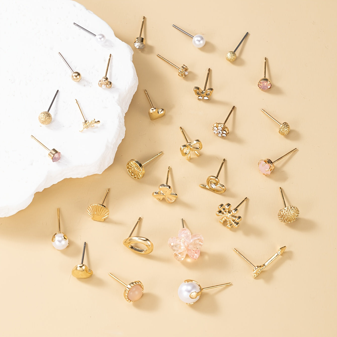 This set includes 30 pairs of metal earrings featuring small flower, three petal, rhinestone, heart-shaped, bow, and shell designs. Perfect for holiday wear.