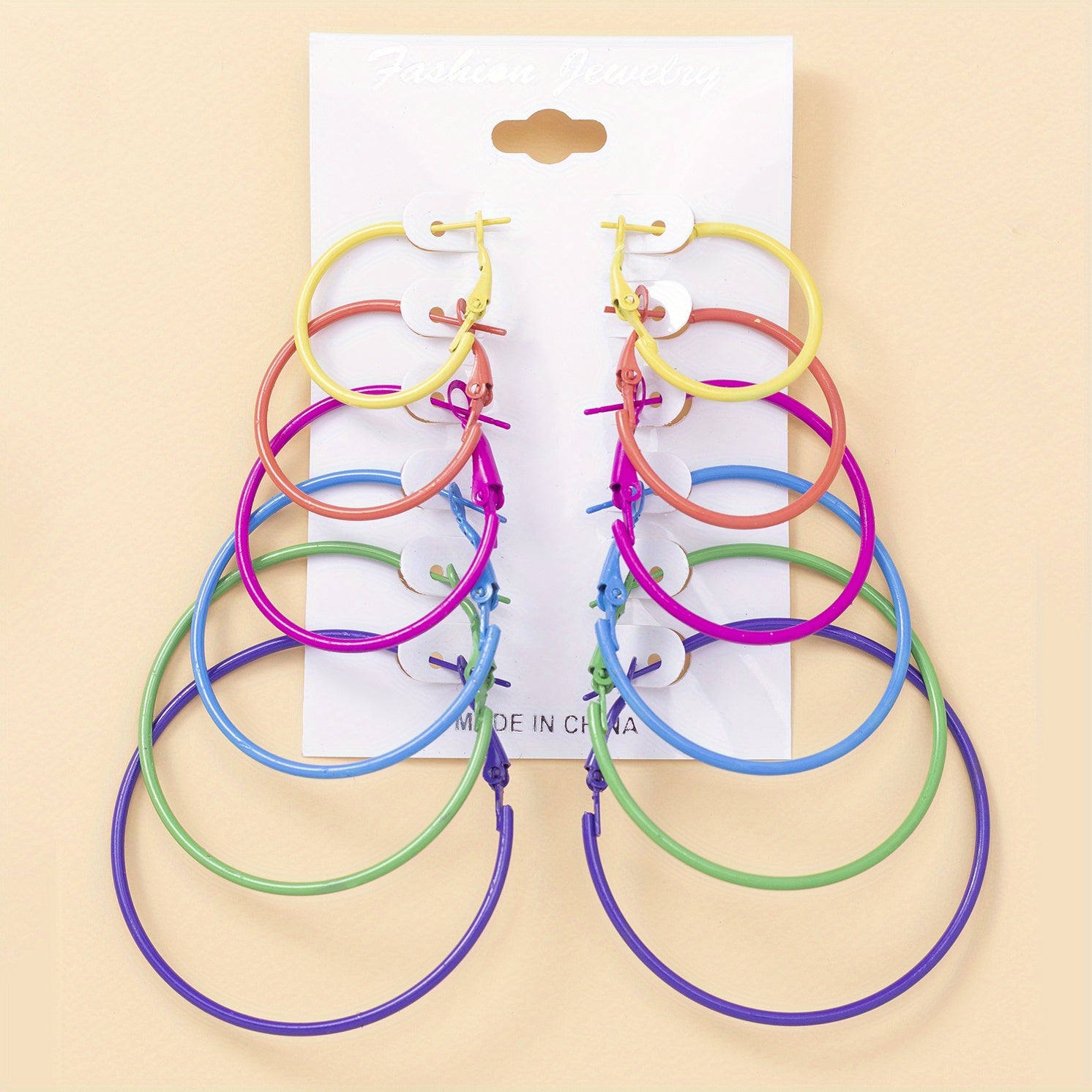 Add a touch of bohemian style to your look with this set of 6 pairs of colorful big circle hoop earrings. Made of durable stainless steel, these earrings are perfect for daily wear and make a great gift for any fashion-conscious female.