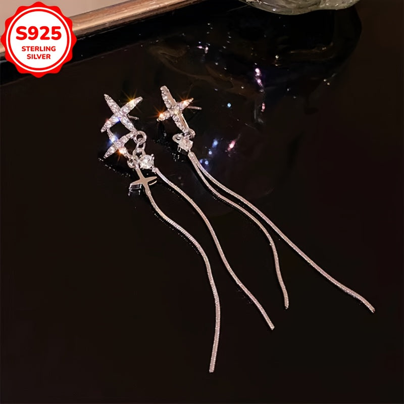 Beautiful pair of hypoallergenic earrings with irregular cross star design and tassel features. Anti-oxidation box included, perfect as a gift for women.