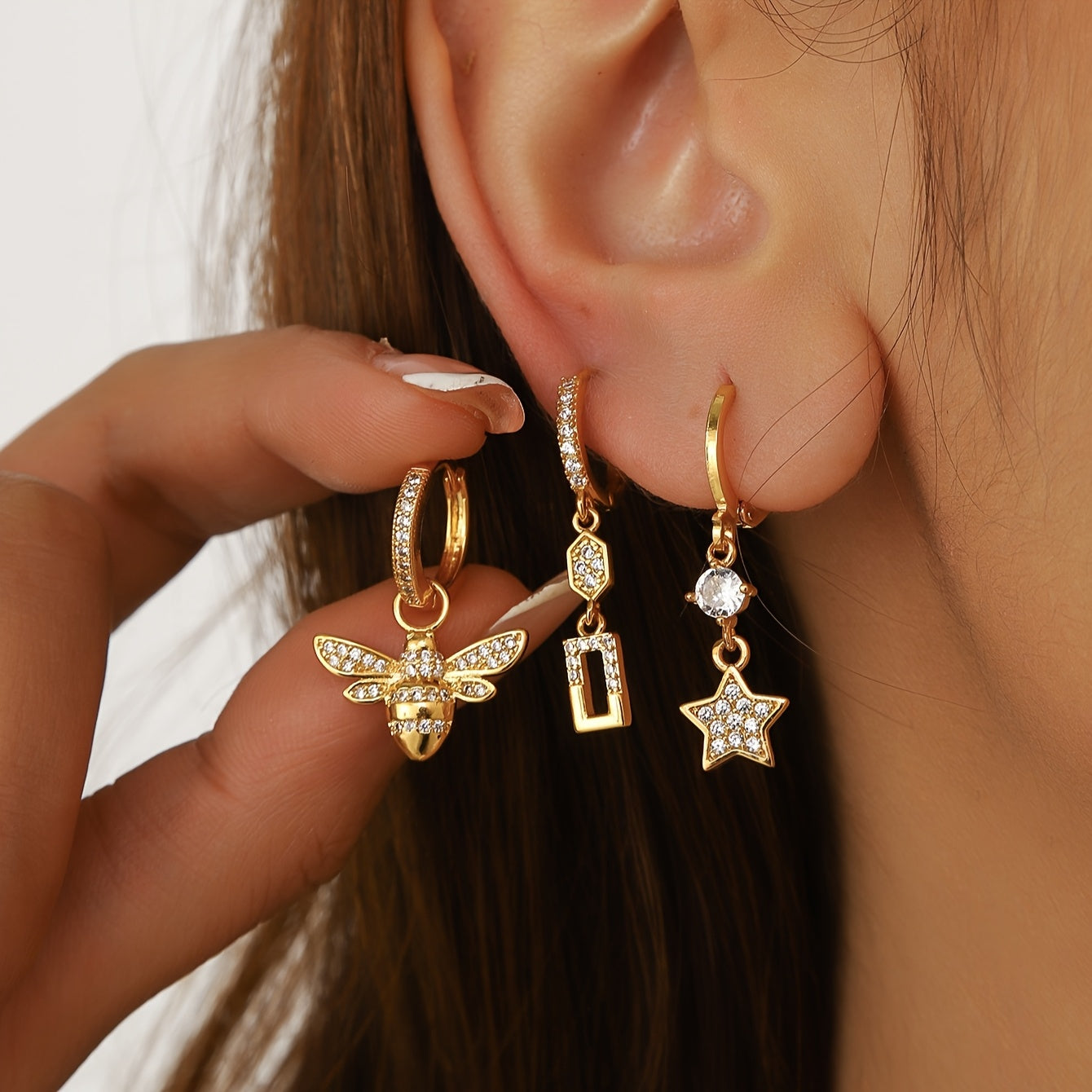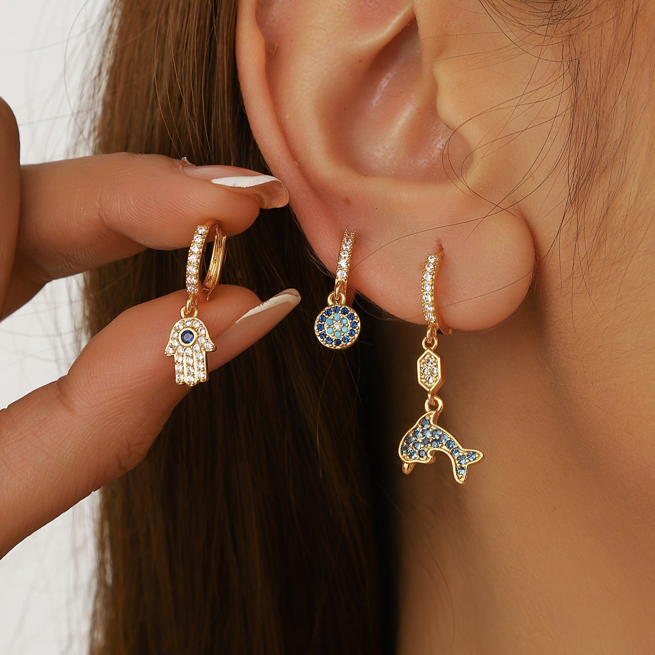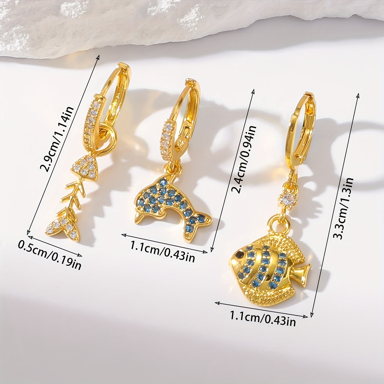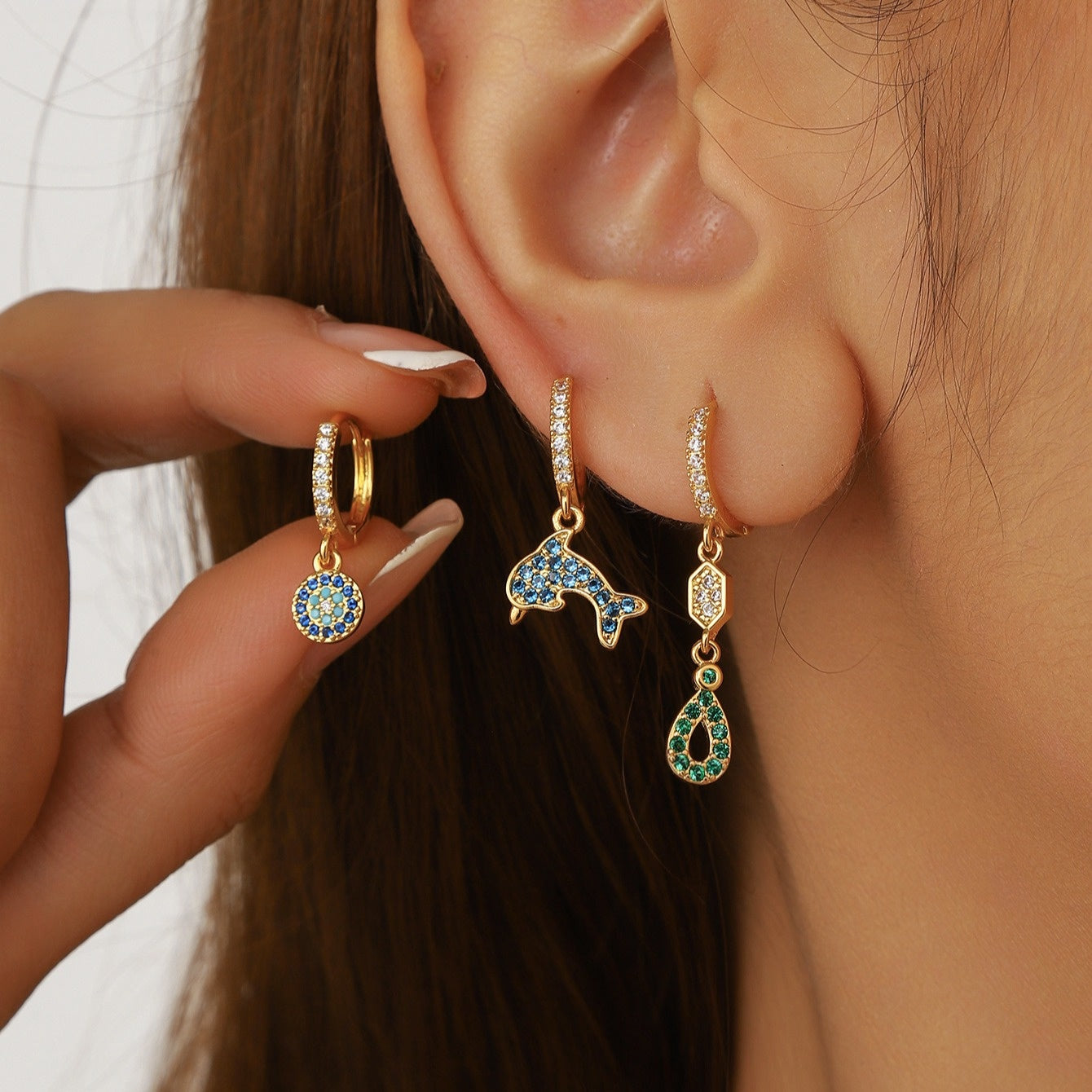 Elevate your look with this 3-piece boho earring set featuring butterfly, dolphin, and floral motifs with synthetic gemstone accents. Made of copper, the versatile mini triangle studs can be worn for casual or formal occasions.
