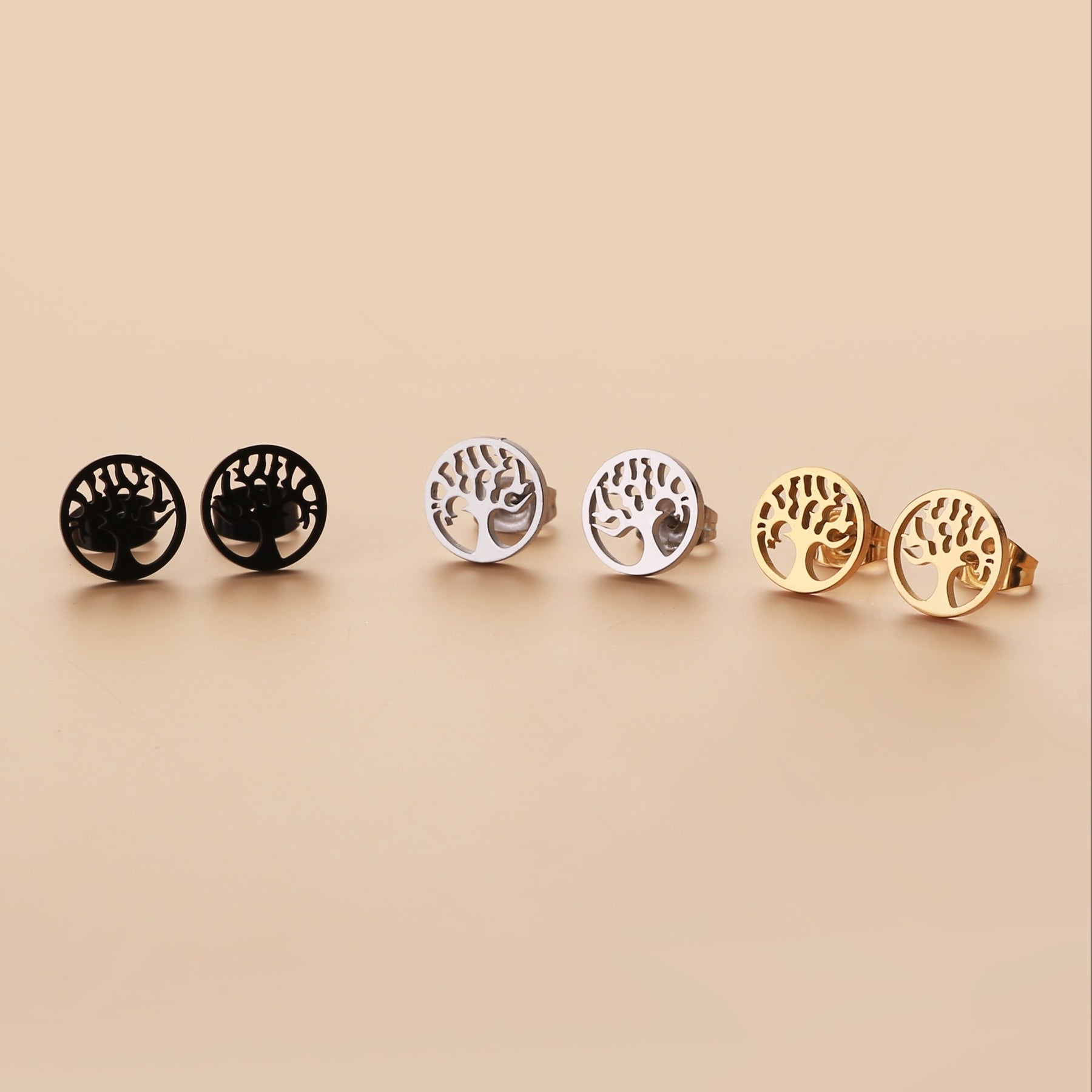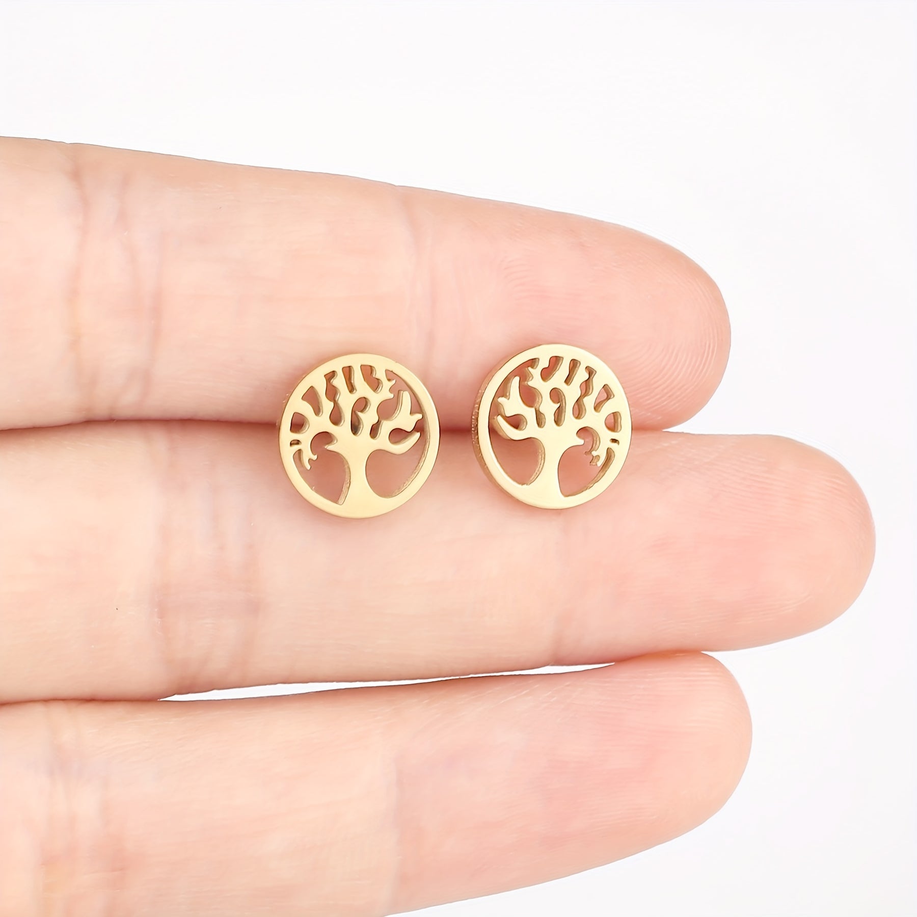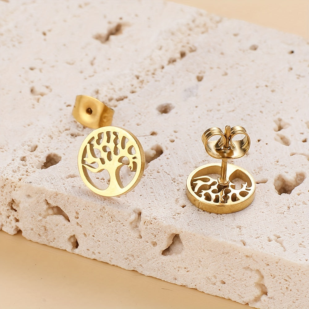 Elegant and stylish stud earrings featuring a life tree hollow circle design. Made of stainless steel with 18K gold plating, perfect for women and girls.