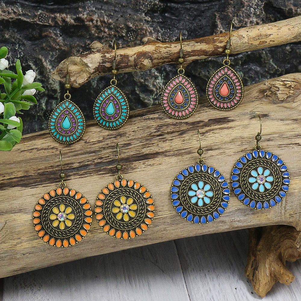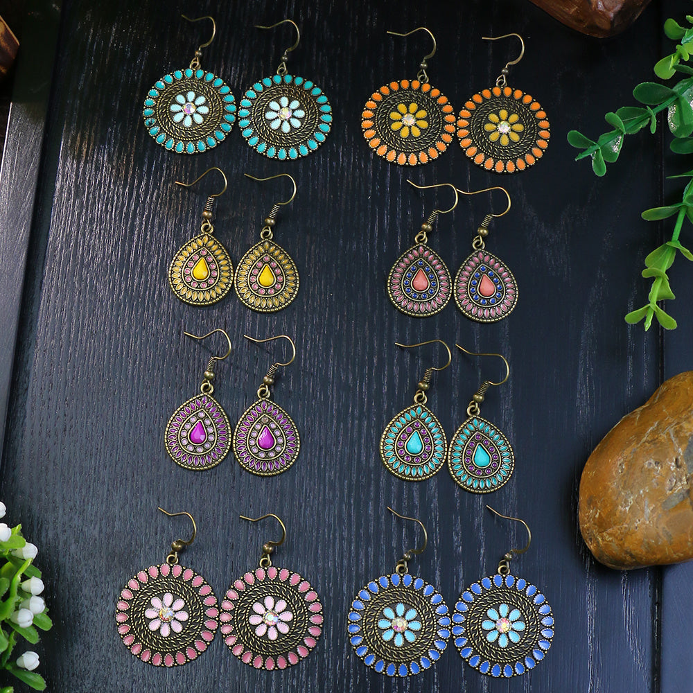 Elevate your style with this retro-inspired earrings set featuring round flower drop pendants in multicolor design. Each pair is adorned with rhinestone and turquoise embellishments for a chic look.