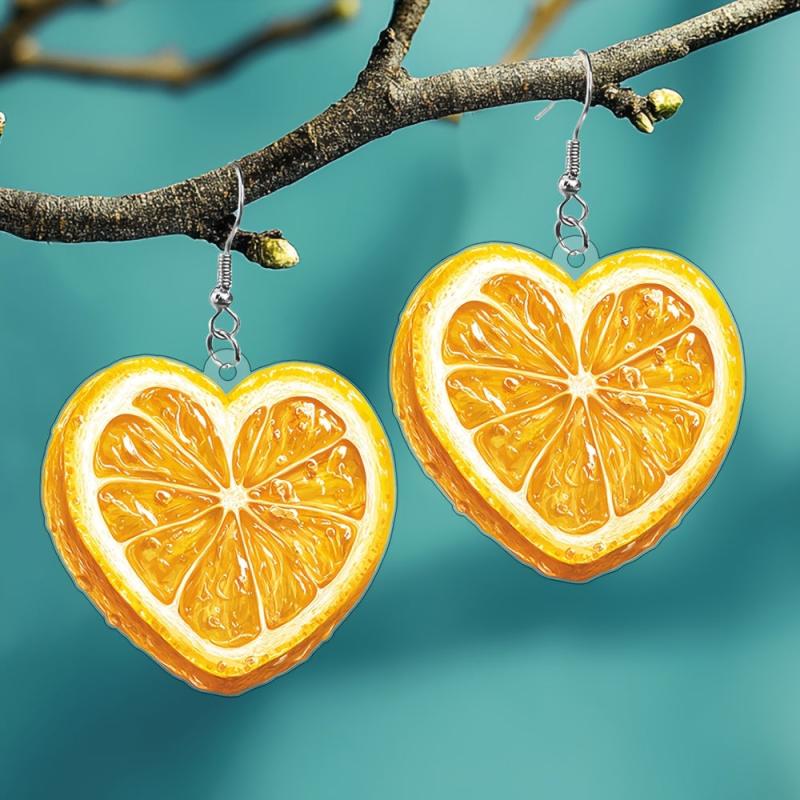 These heart-shaped orange slice earrings are perfect for adding a touch of summer fun to your look. Made of lightweight acrylic, they are ideal for beach parties or casual outings.
