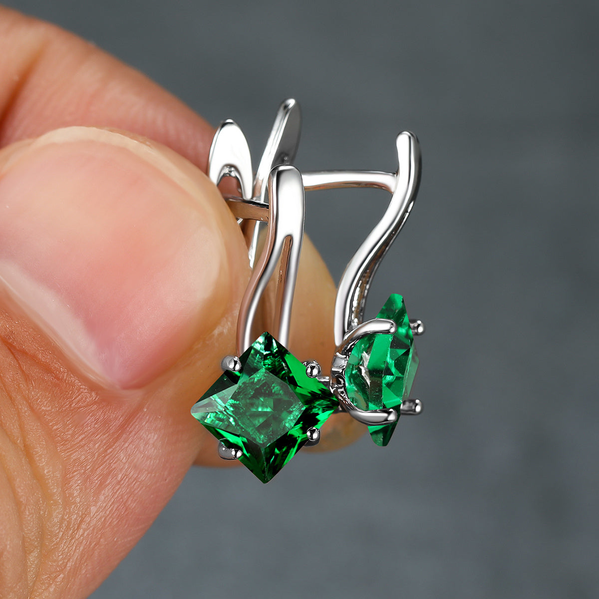 These stunning clip earrings feature princess cut green, red, and rainbow stones, perfect for brides or engagements.