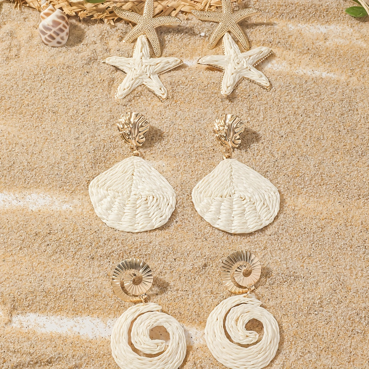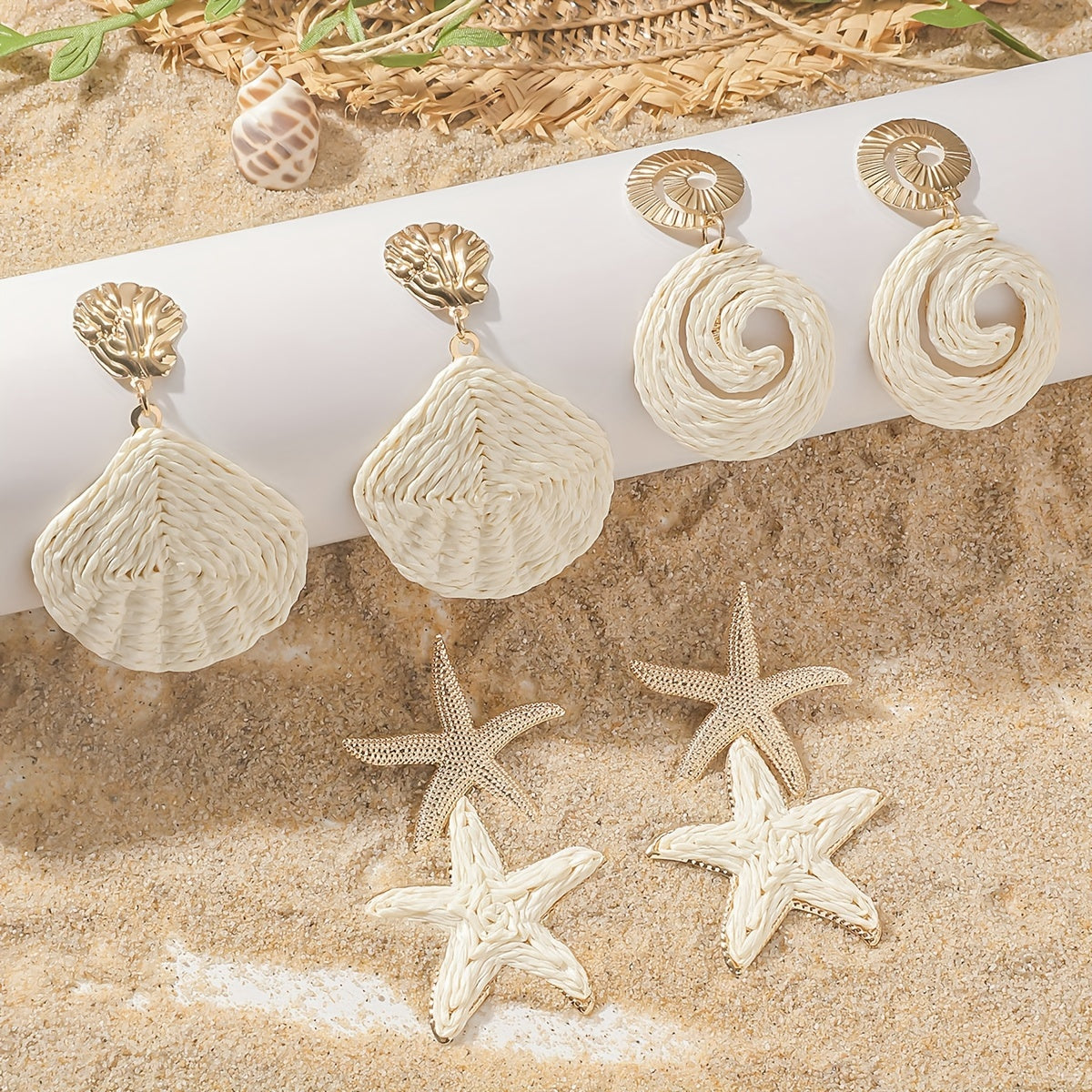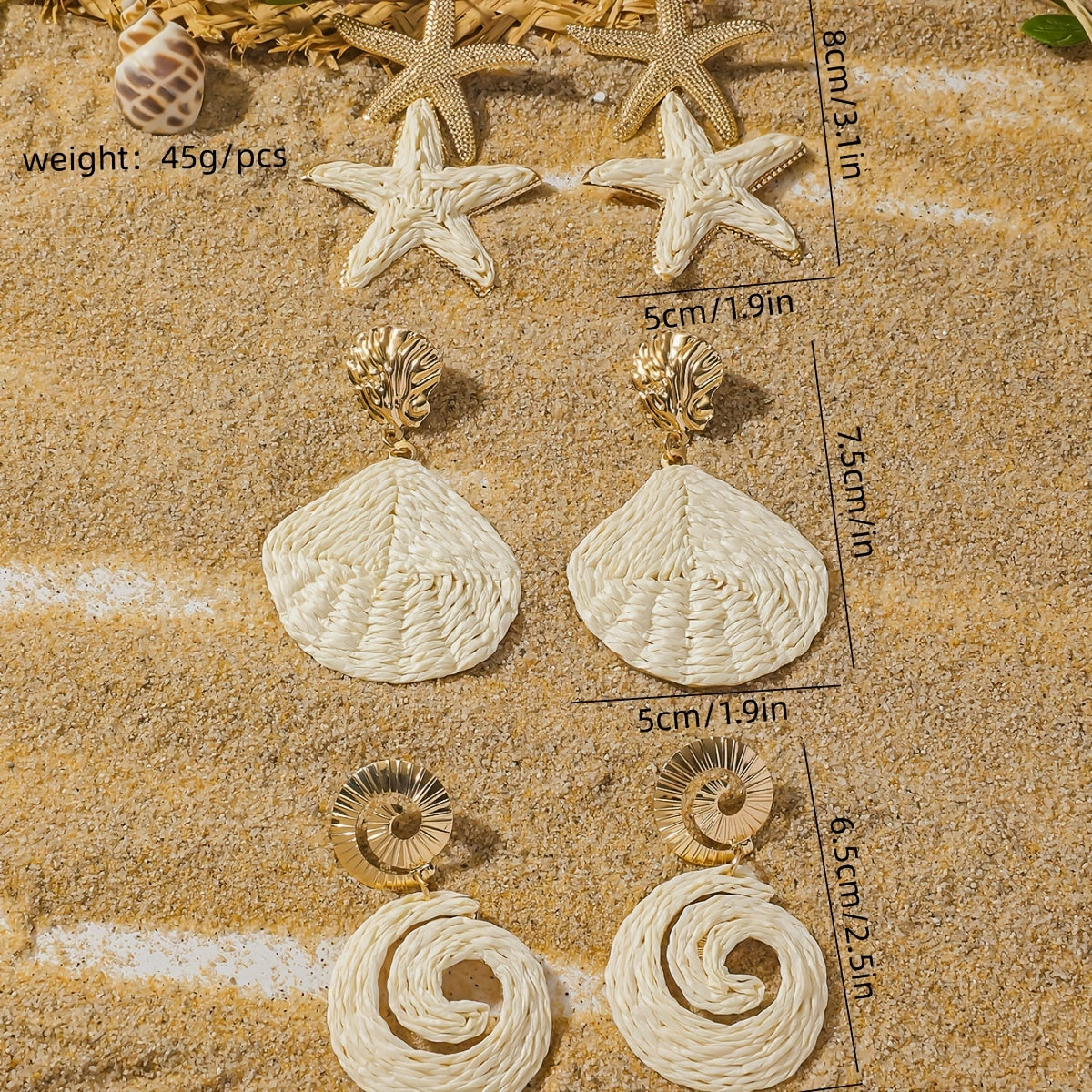 Embrace ocean vibes with this bohemian earring set featuring raffia starfish, shell, and conch elements. Perfect for beach lovers!