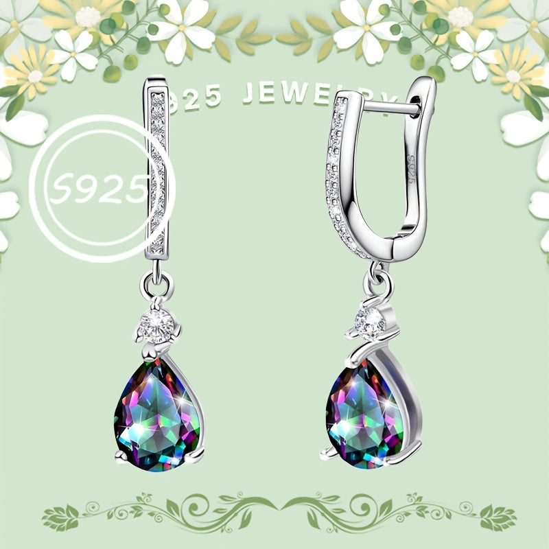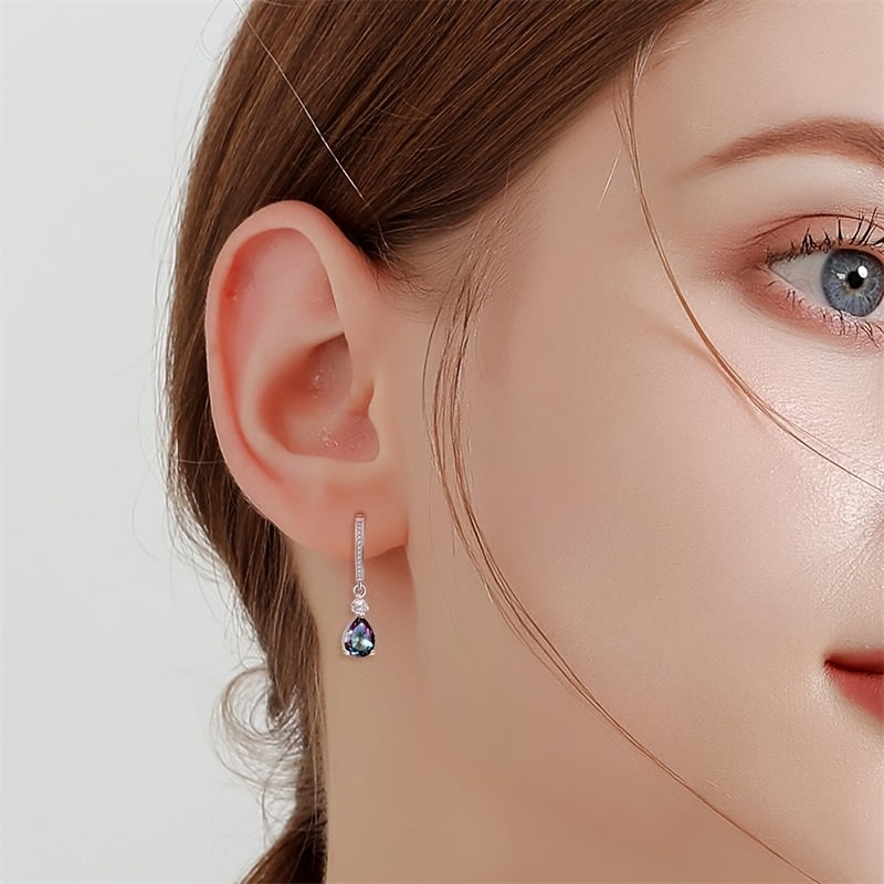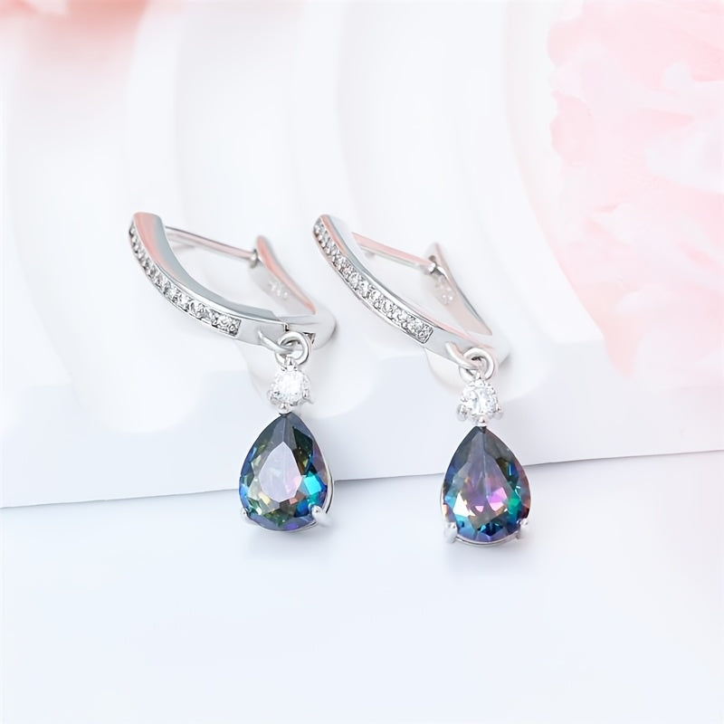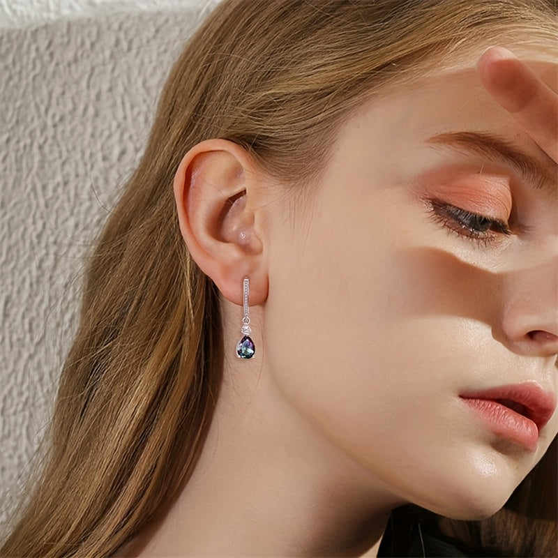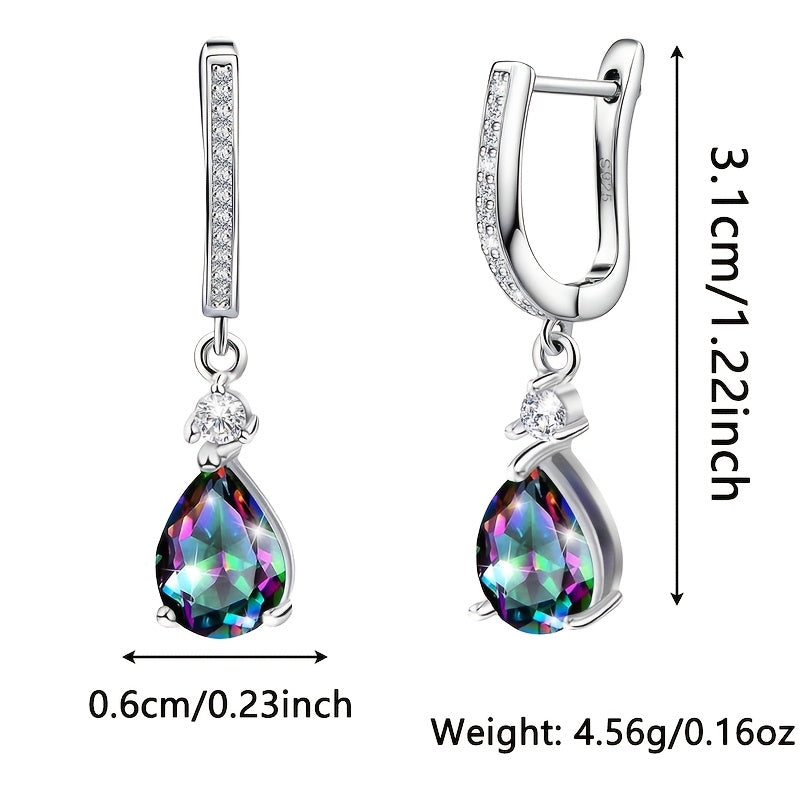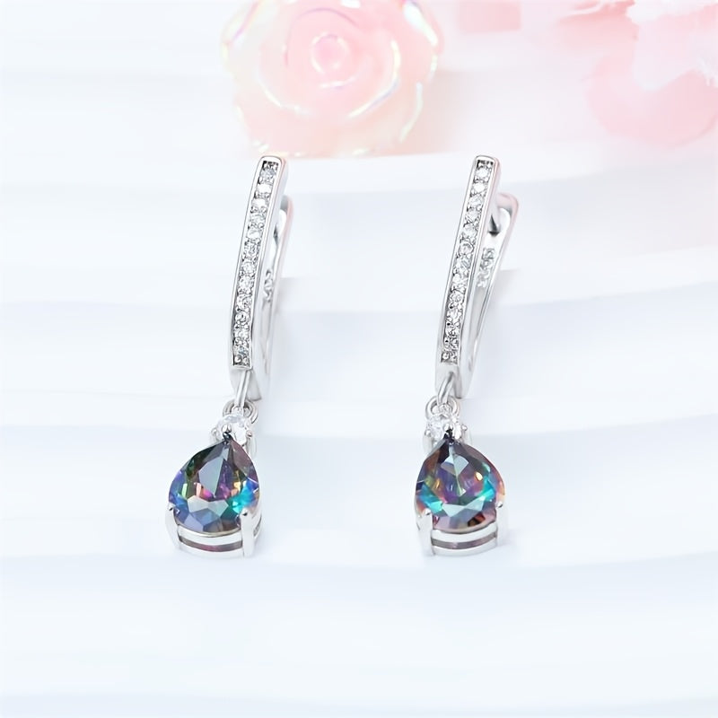 These stunning earrings feature multicolor CZ teardrop pear-shaped pendants that catch the light beautifully. Perfect for adding a touch of sparkle to your outfit.