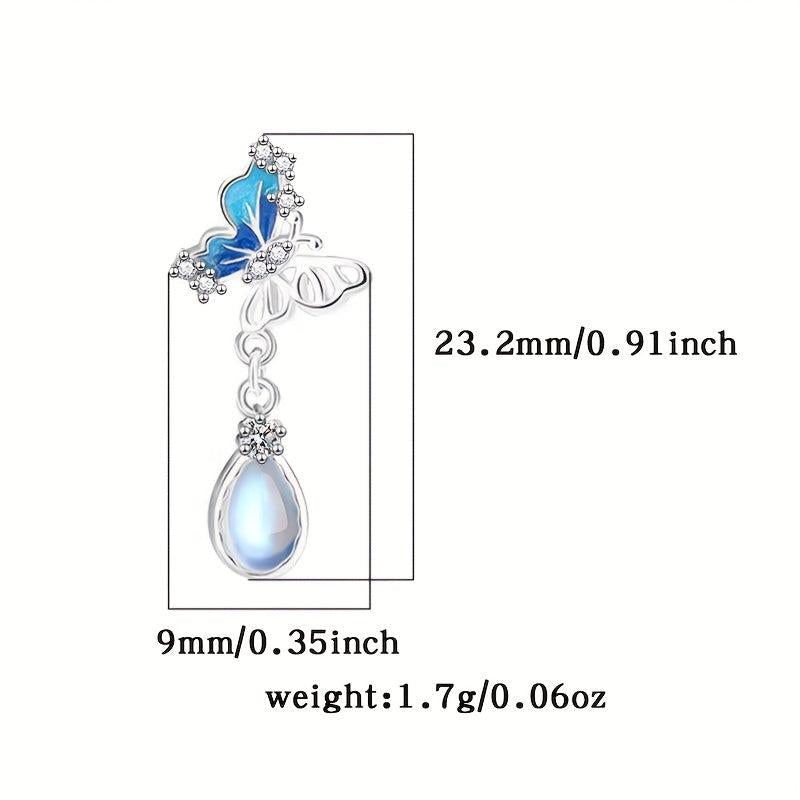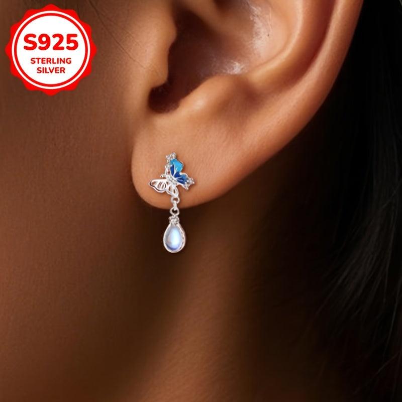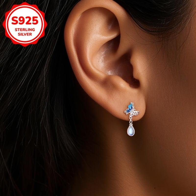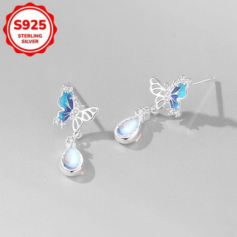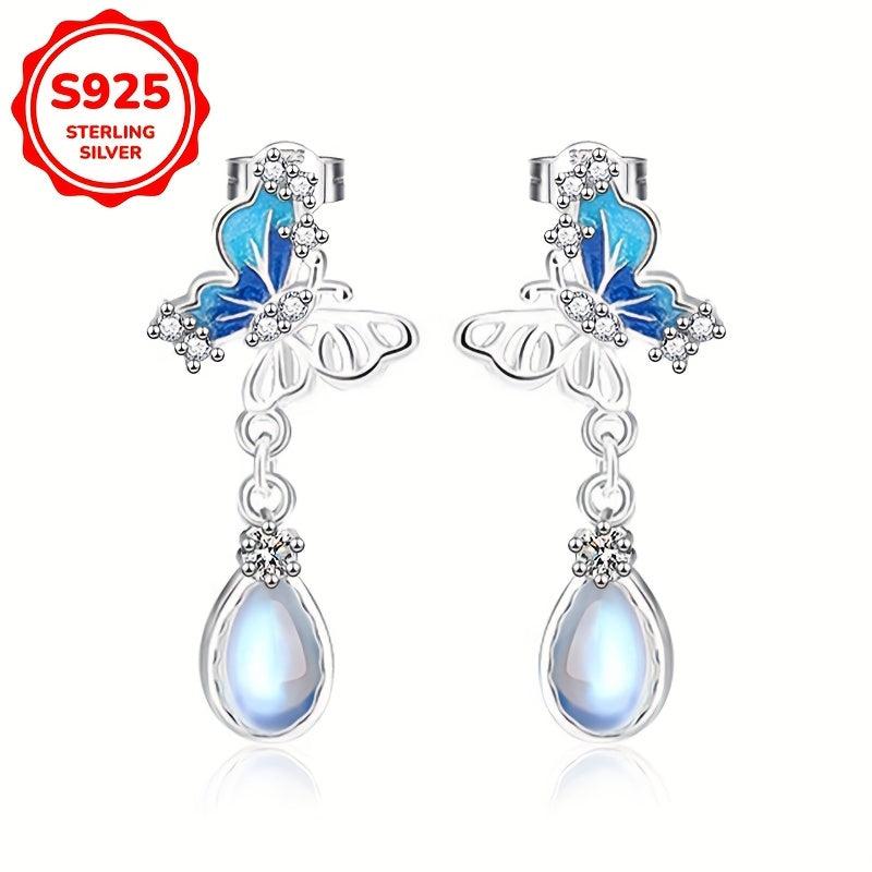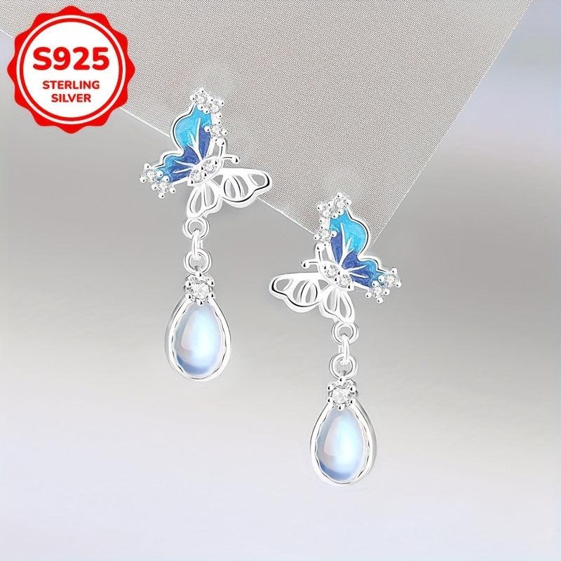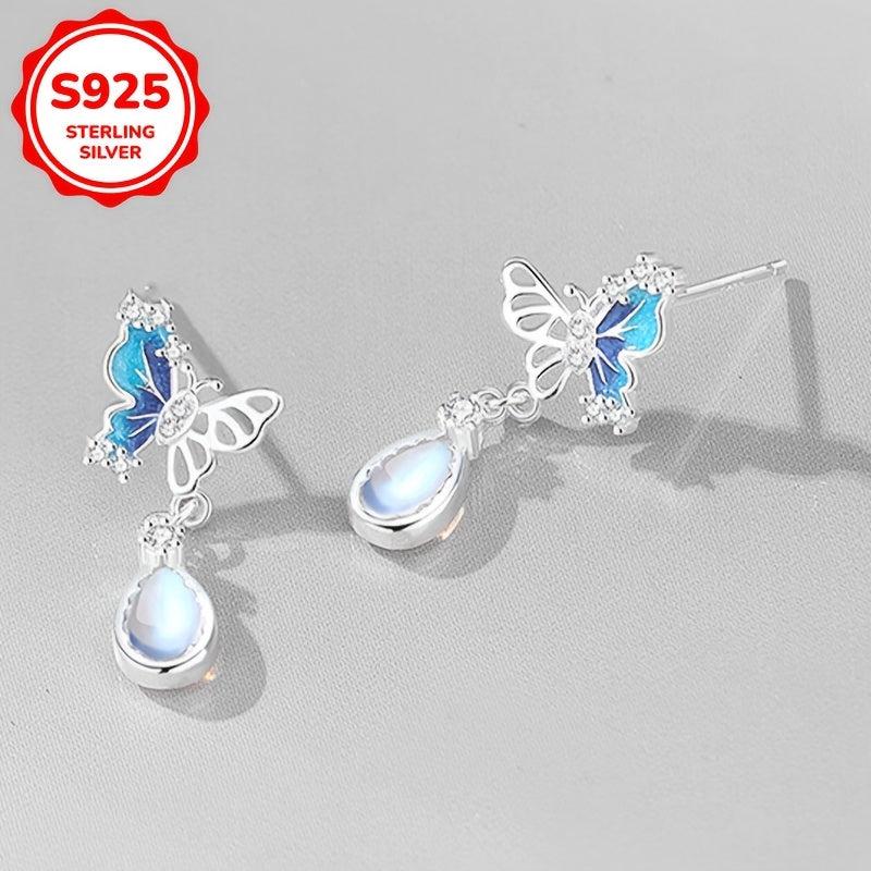 Elegant dangle earrings featuring zirconia butterfly pendants with teardrop moonstone accents, ideal for weddings, holidays, Valentine's, or Mother's Day.