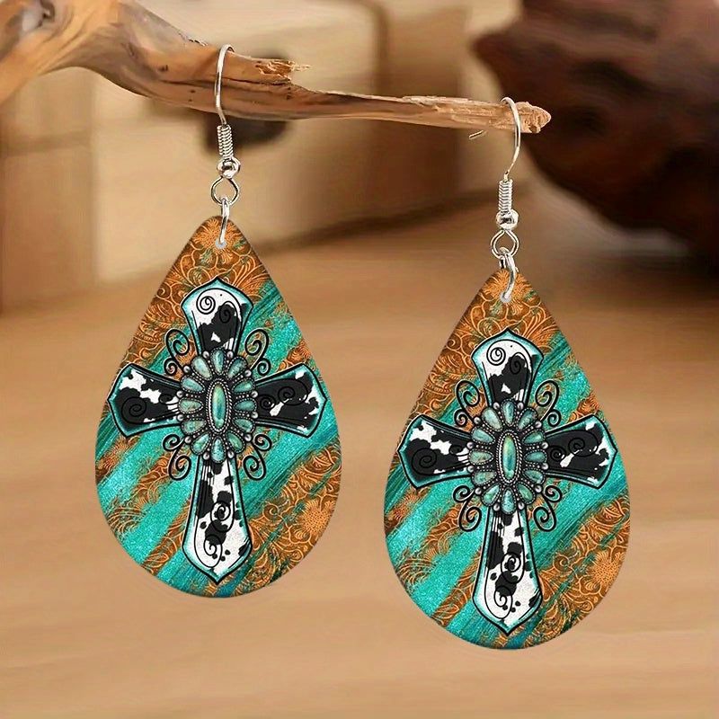 Add a touch of vintage charm with these wooden earrings featuring a teardrop shape and cross and flower pattern.