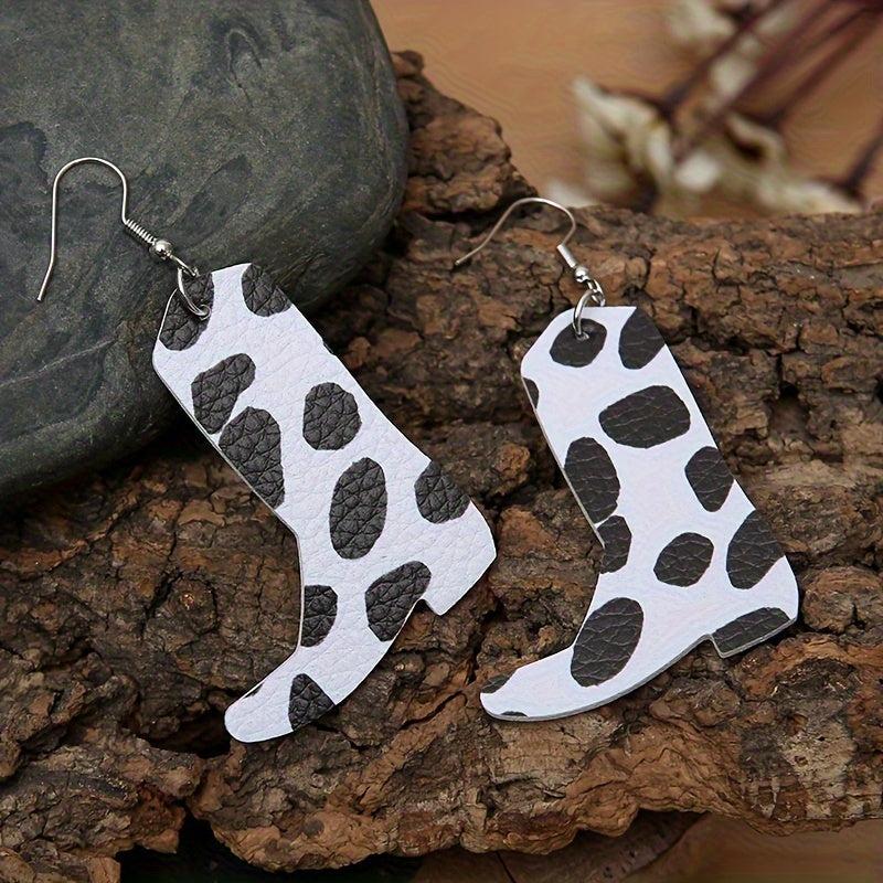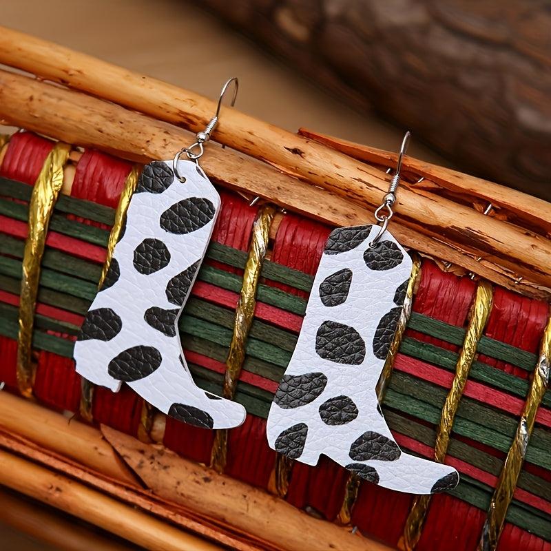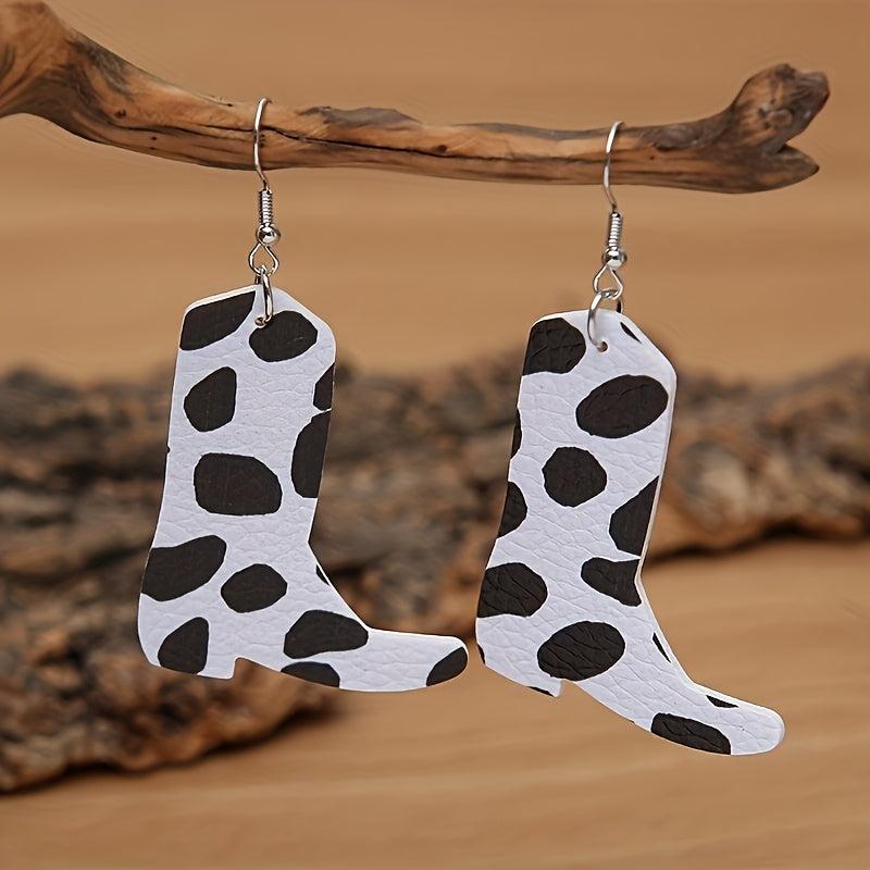 Get a trendy Western look with this set of cow pattern faux leather boots and creative earrings. Perfect for adding a touch of cowboy style to any outfit.