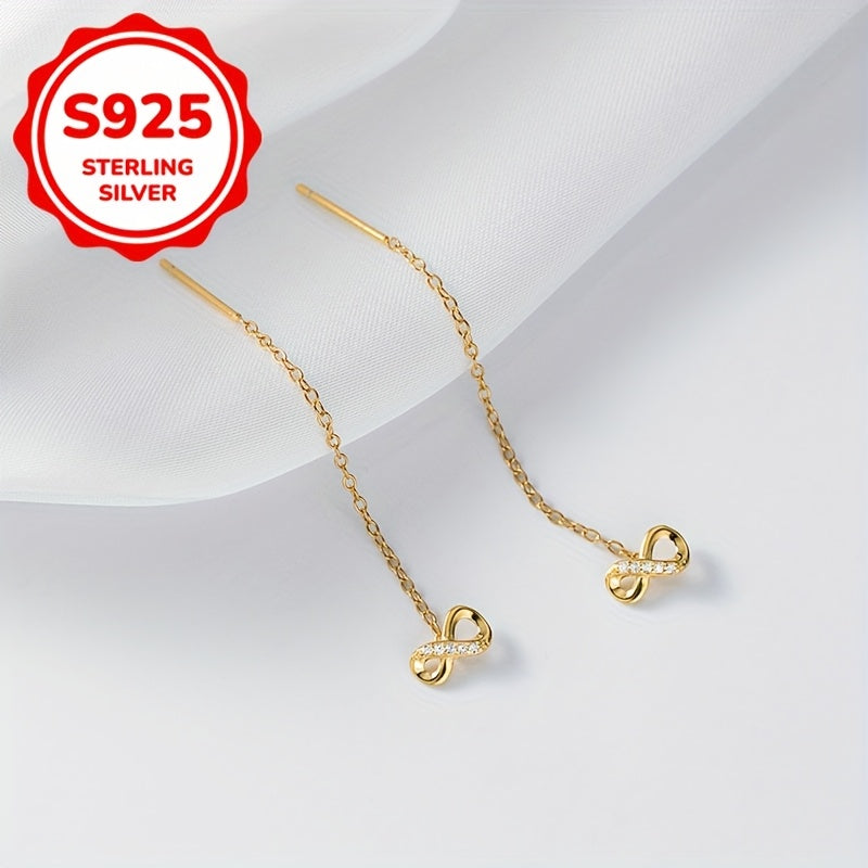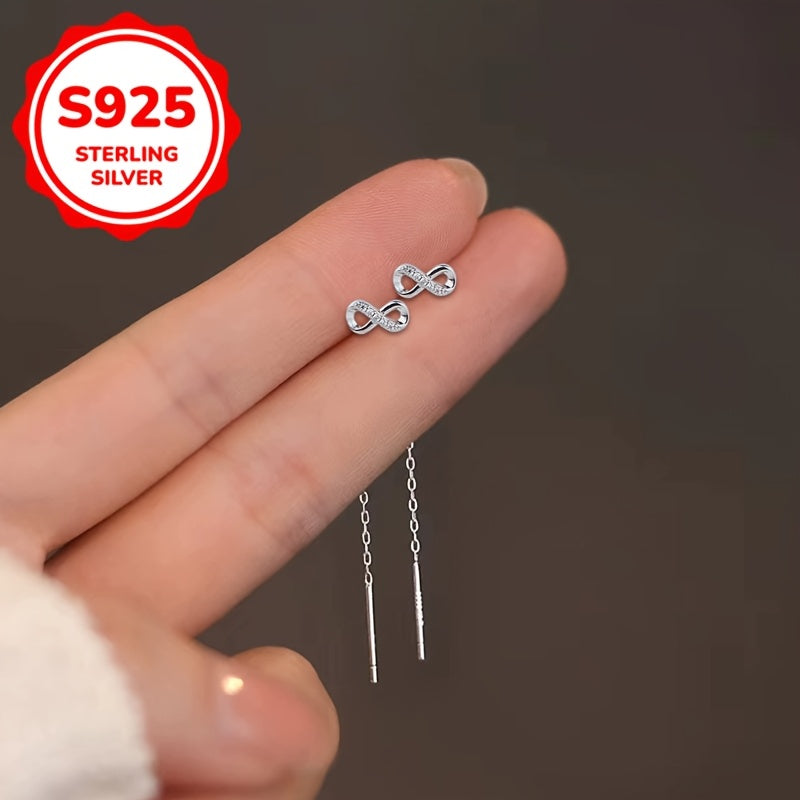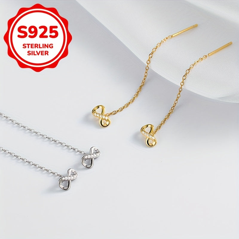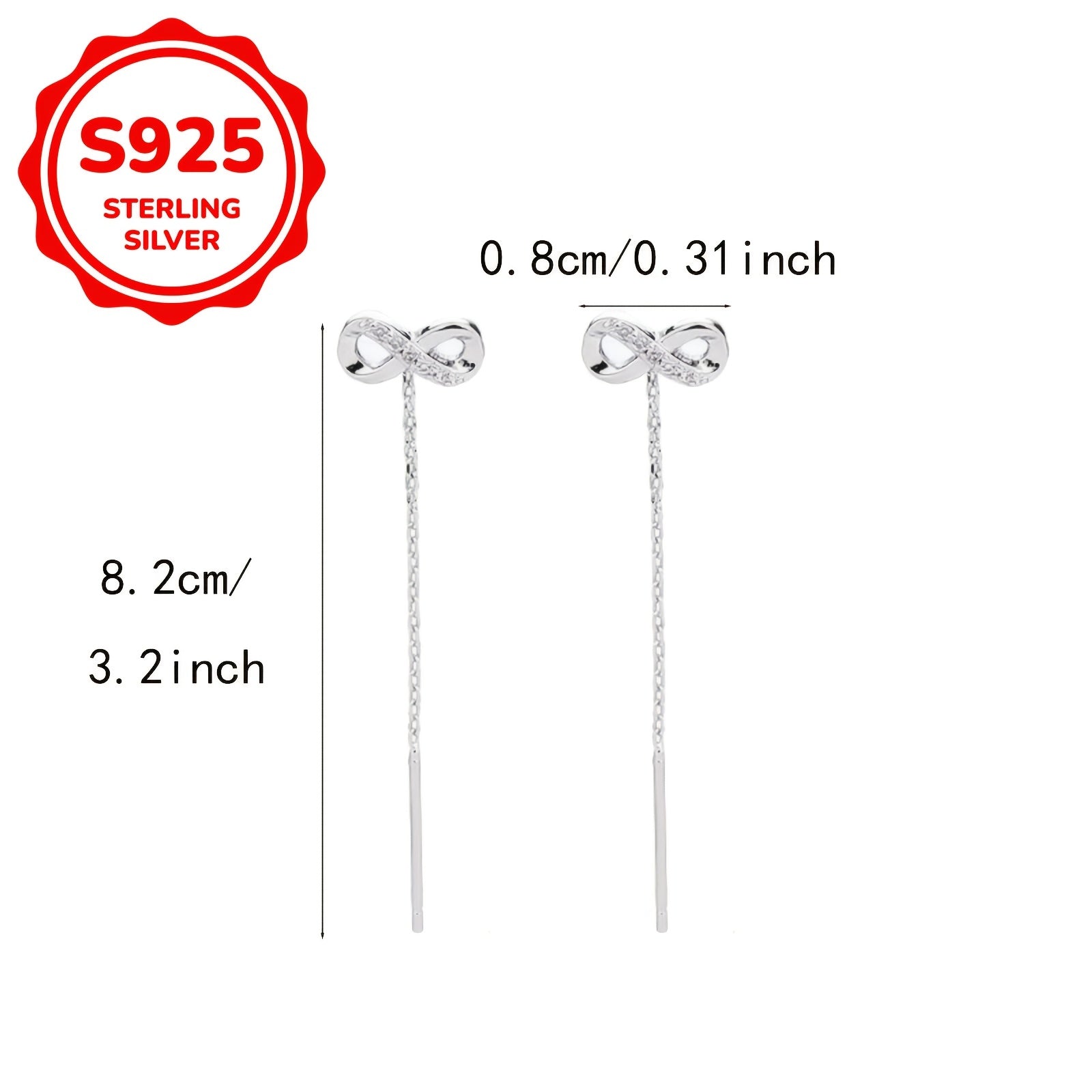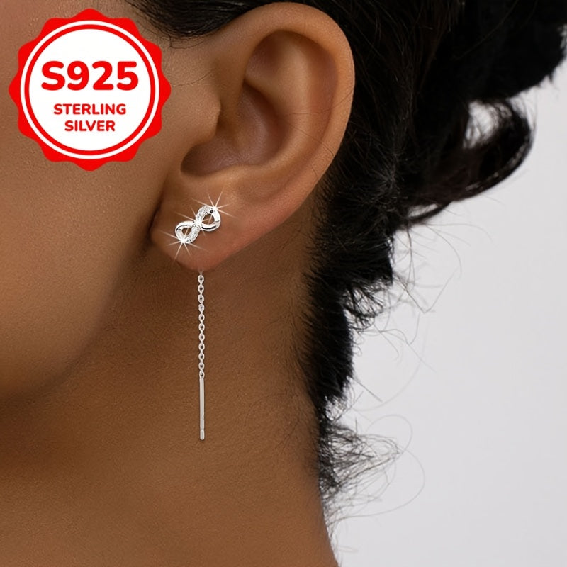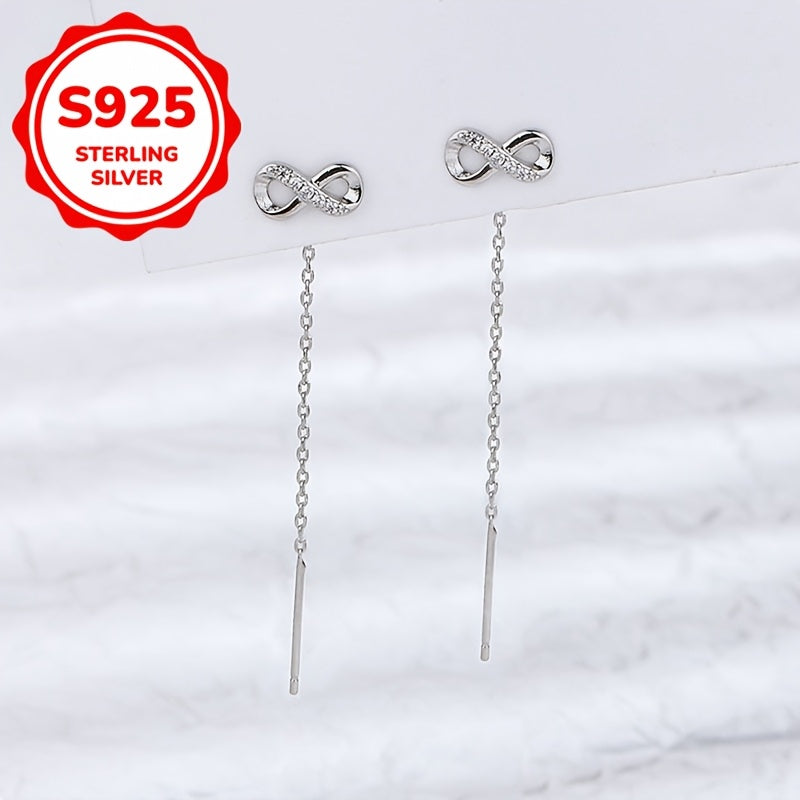 These elegant dangle earrings are crafted with S925 silver and feature a stunning infinity chain design with zirconia inlay. Perfect for those with sensitive ears.