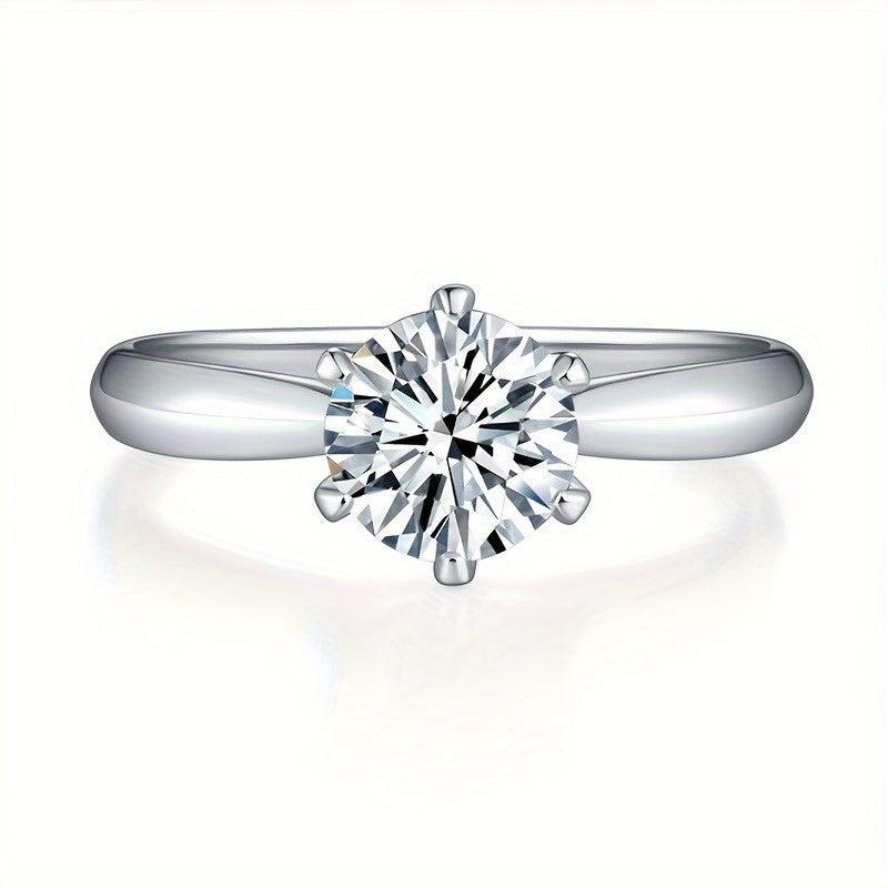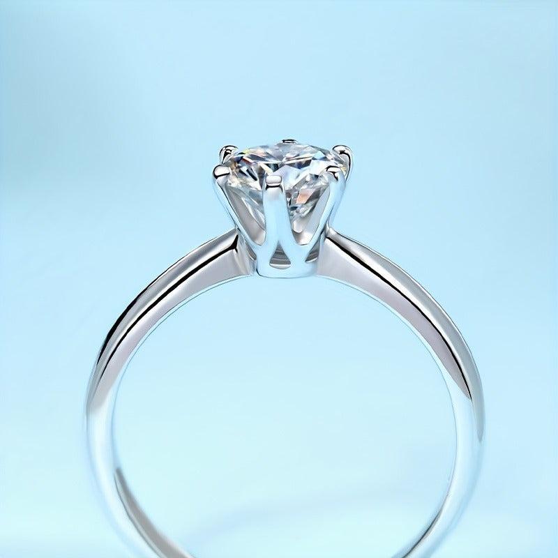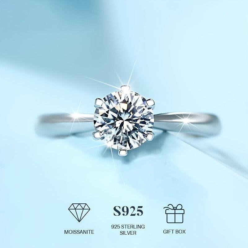 This stunning engagement ring features a 10 carat moissanite stone set in a 925 sterling silver band. Hypoallergenic and comfortable to wear for everyday use.