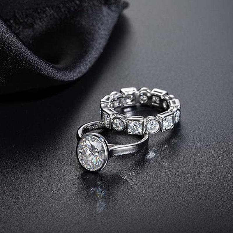 Make a promise of eternal love with this stunning wedding ring set featuring a 5 carat Moissanite stone set in 18K golden plating on S925 silver.