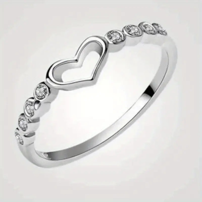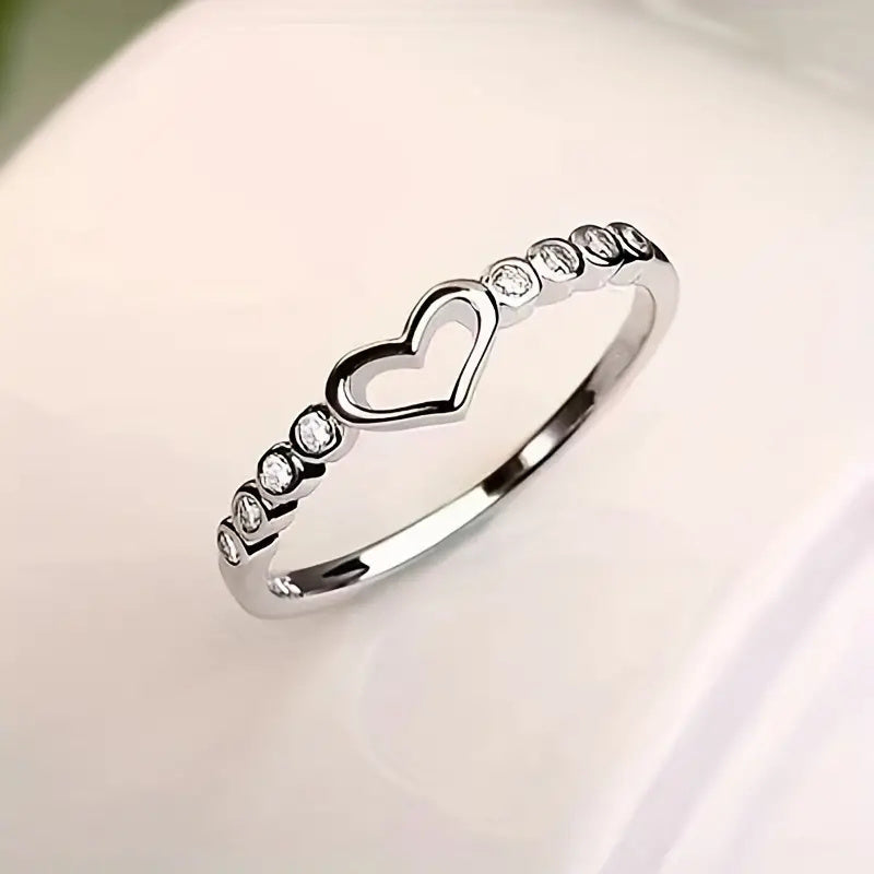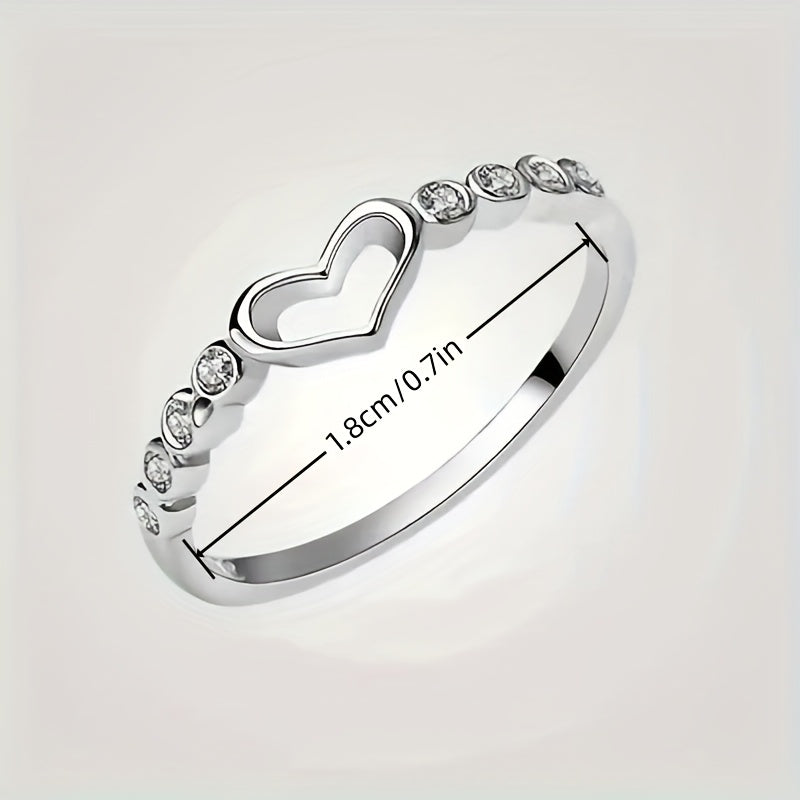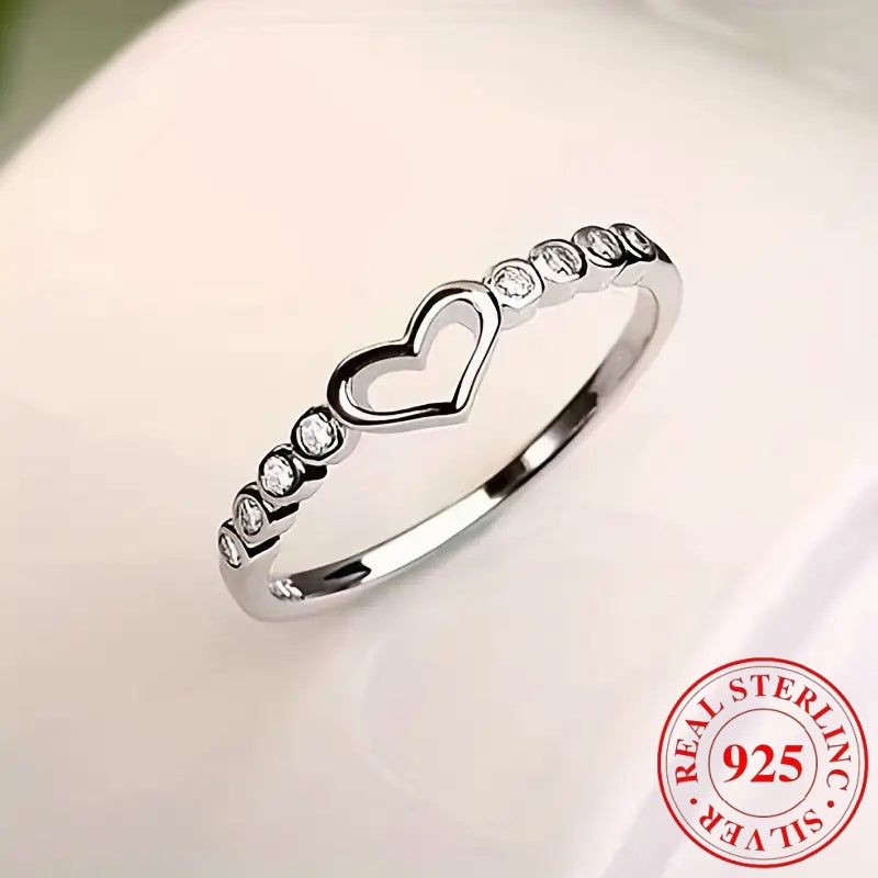 Elegant and minimalist hollow heart shaped ring crafted in 925 sterling silver with sparkling zirconia stones, ideal for weddings, engagements, anniversaries, or as a special gift.