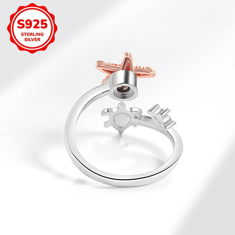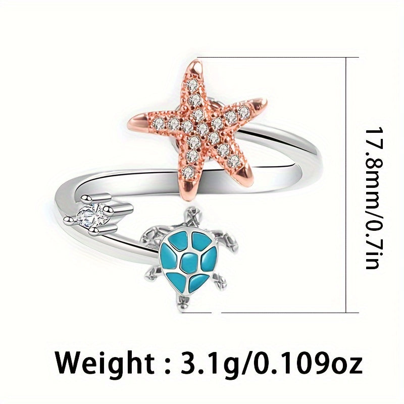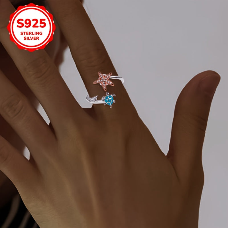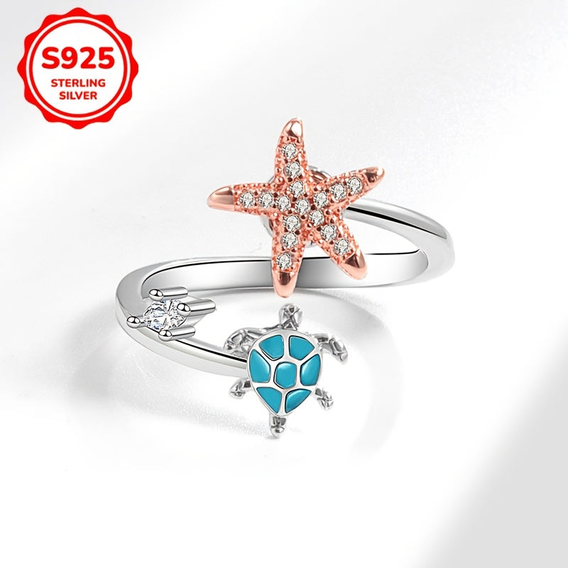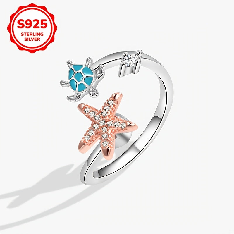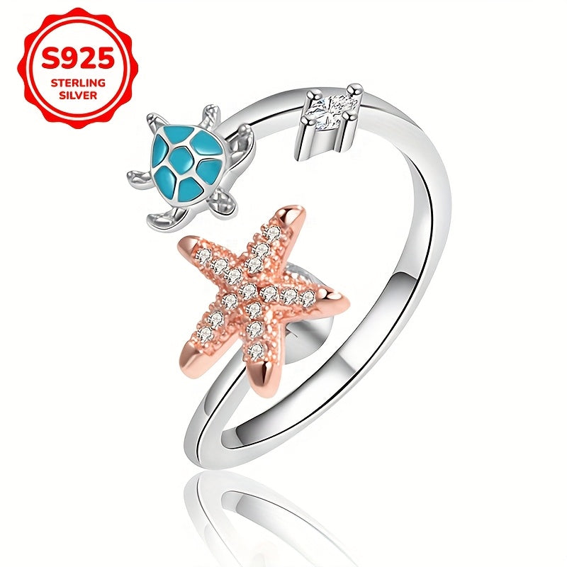 Embrace the summer vibes with this ocean-inspired rotating ring. Made of S925 silver with synthetic zirconia stones, this unique piece features a turtle and star design. Lightweight at 3.1g, it's perfect for beach outings.
