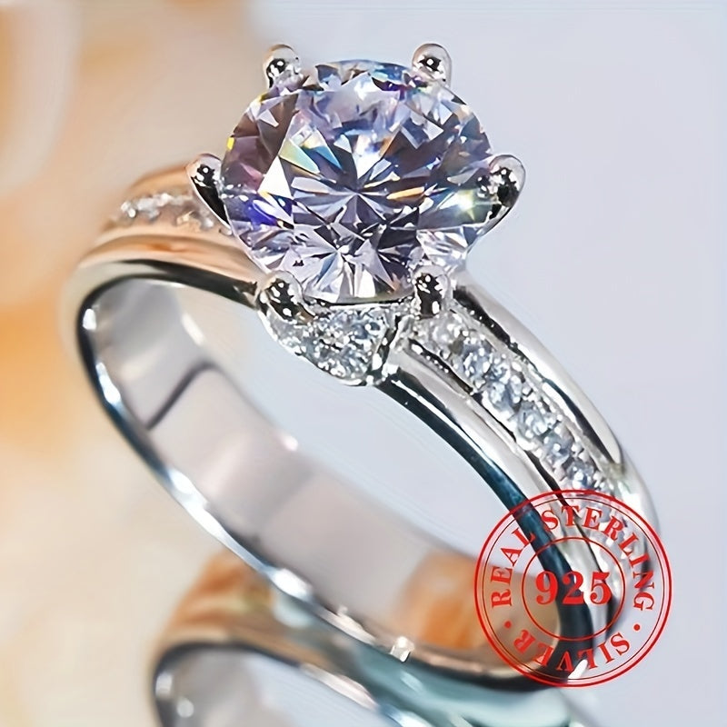 This classic ring features a synthetic zirconia stone set in a sterling silver 6-prong setting. Perfect for proposals, anniversaries, and special occasions.