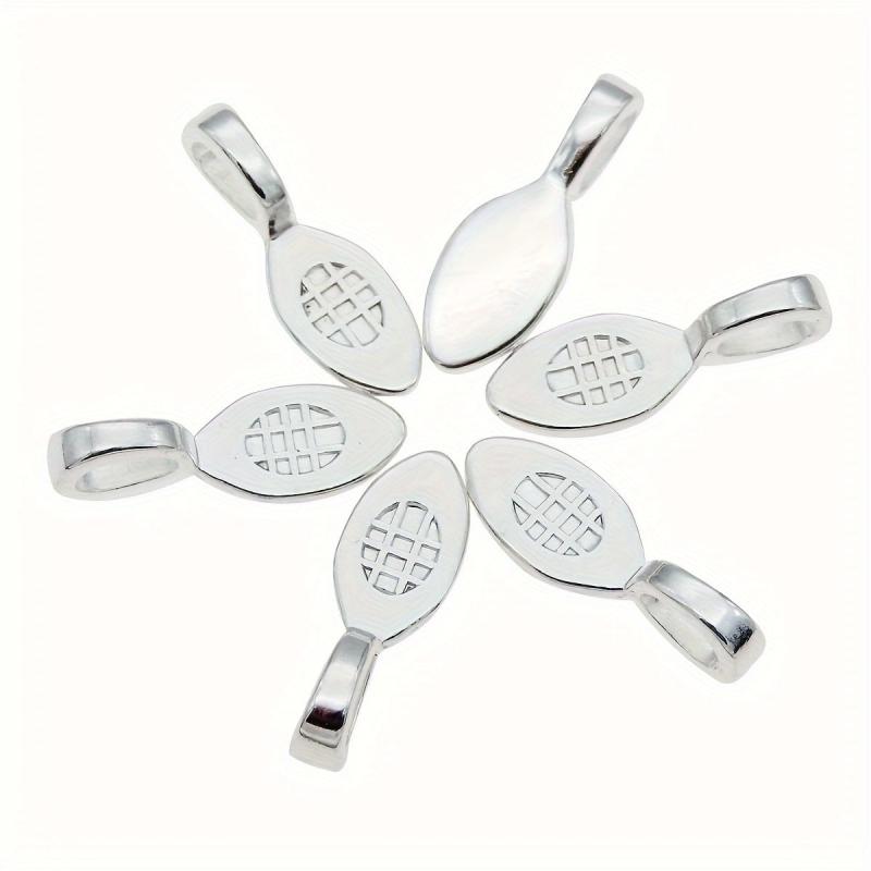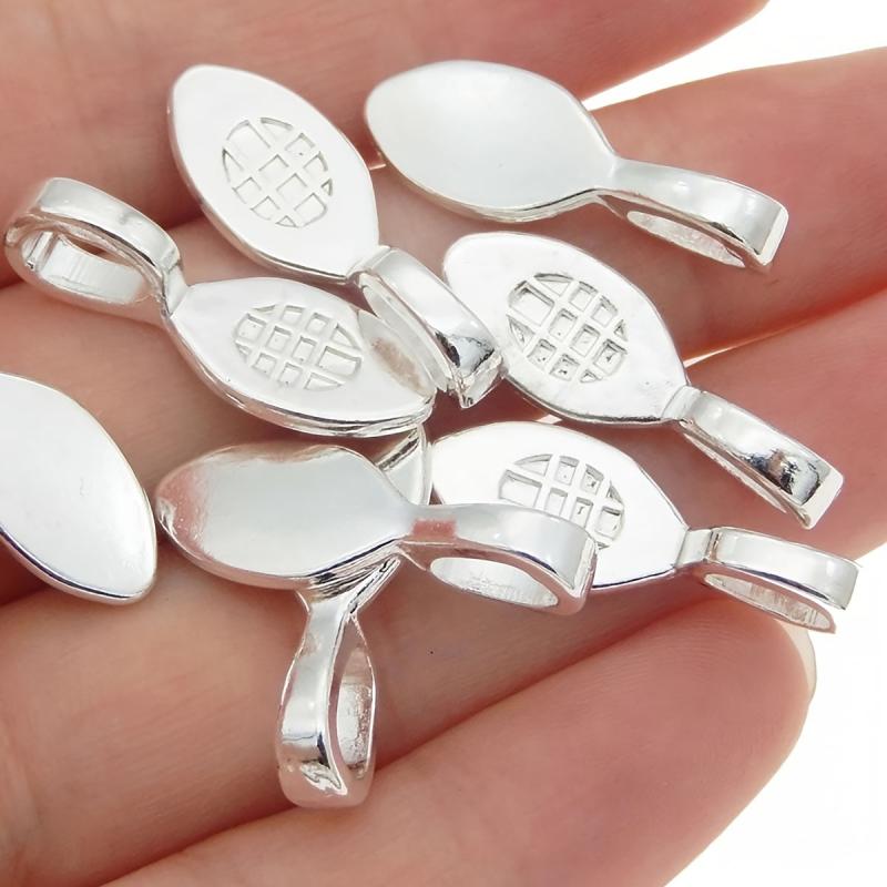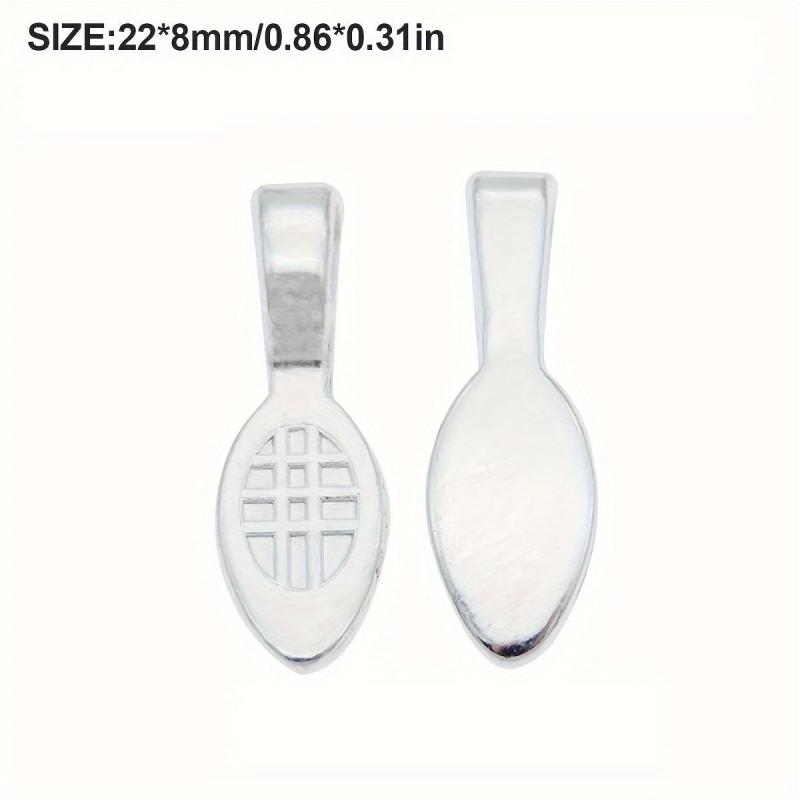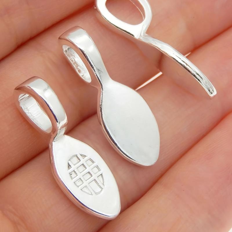 Get this set of 100 silvery zinc alloy spoon shaped bail charms to create personalized jewelry pieces. Perfect for themed necklaces, pendants, keychains, and other craft accessories.