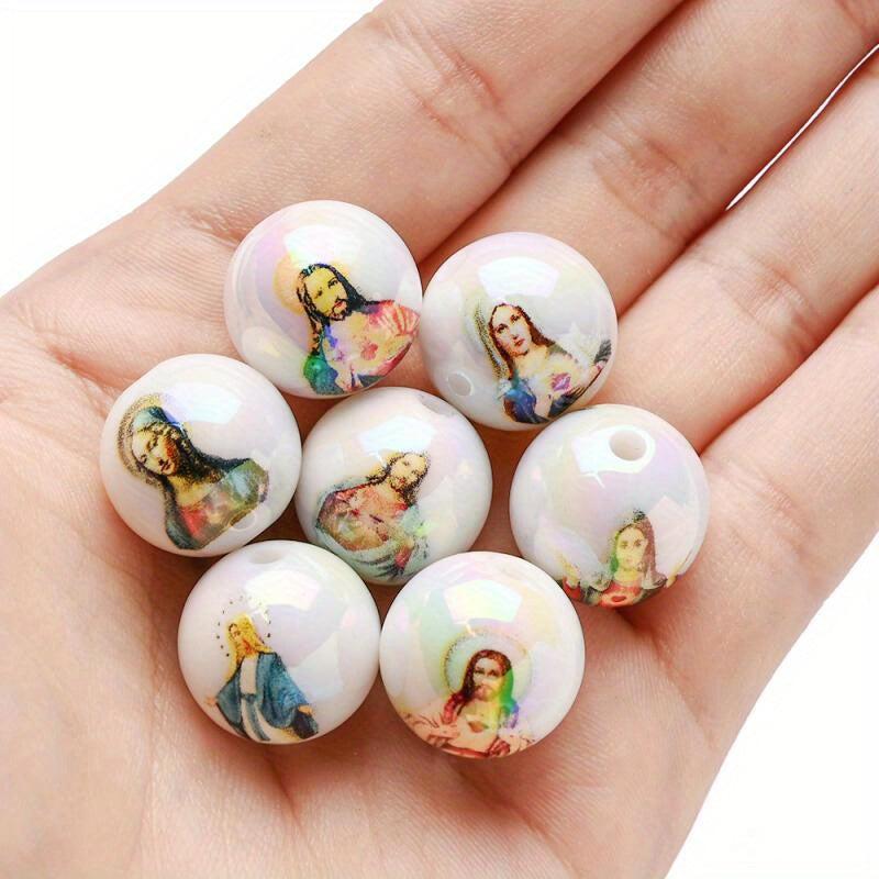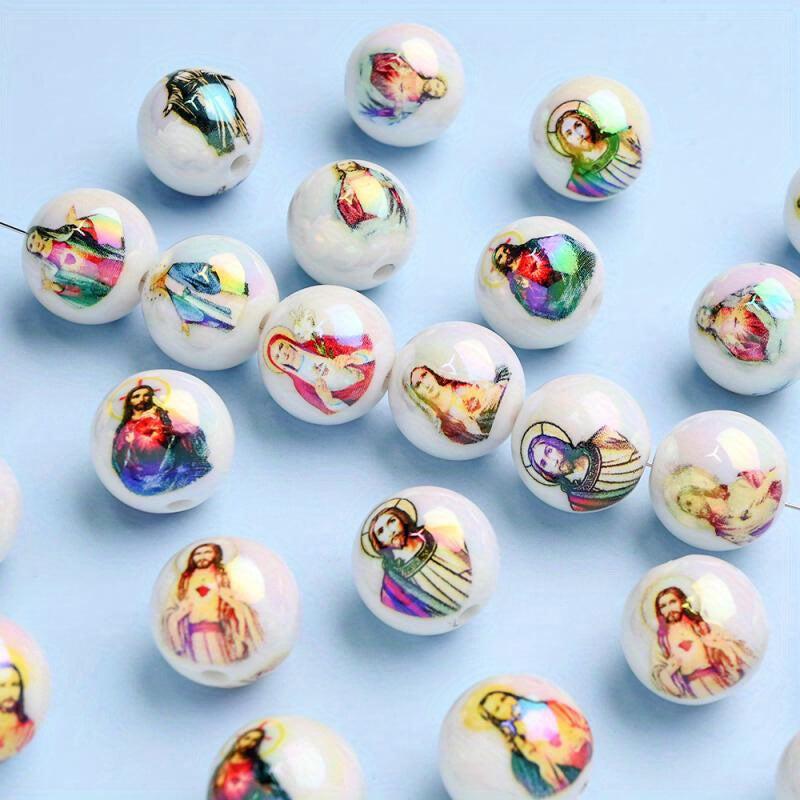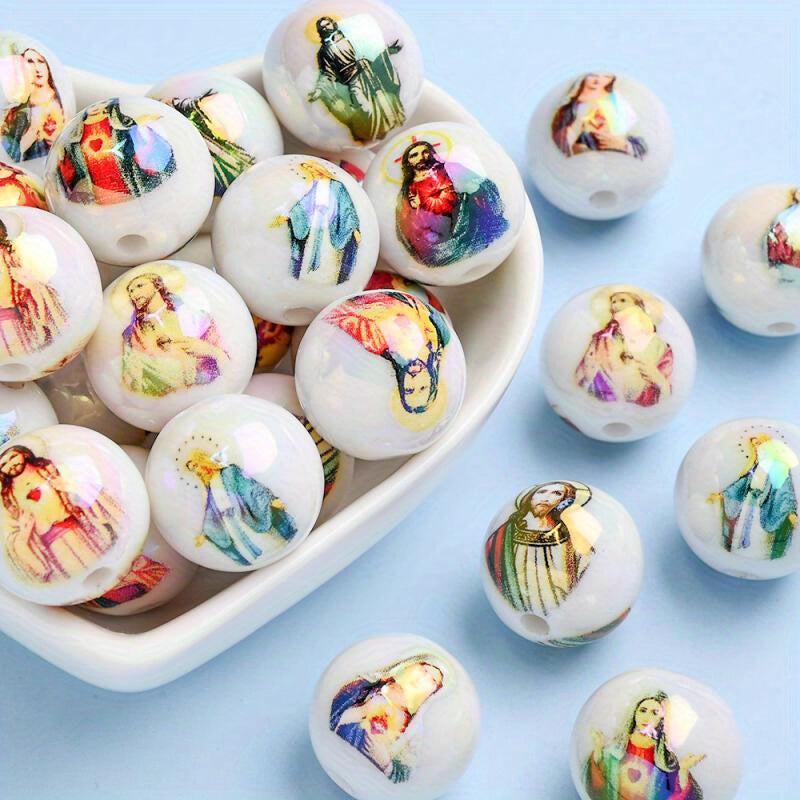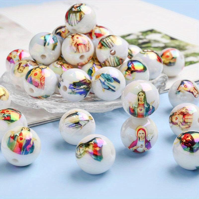 These 16mm acrylic beads feature various religious figures like saints and Virgin Mary with a glossy finish. Use them for crafting bracelets, keychains, phone charms, and other DIY projects.