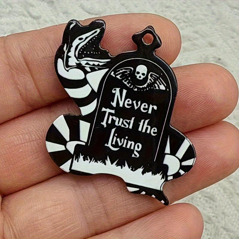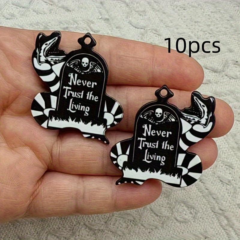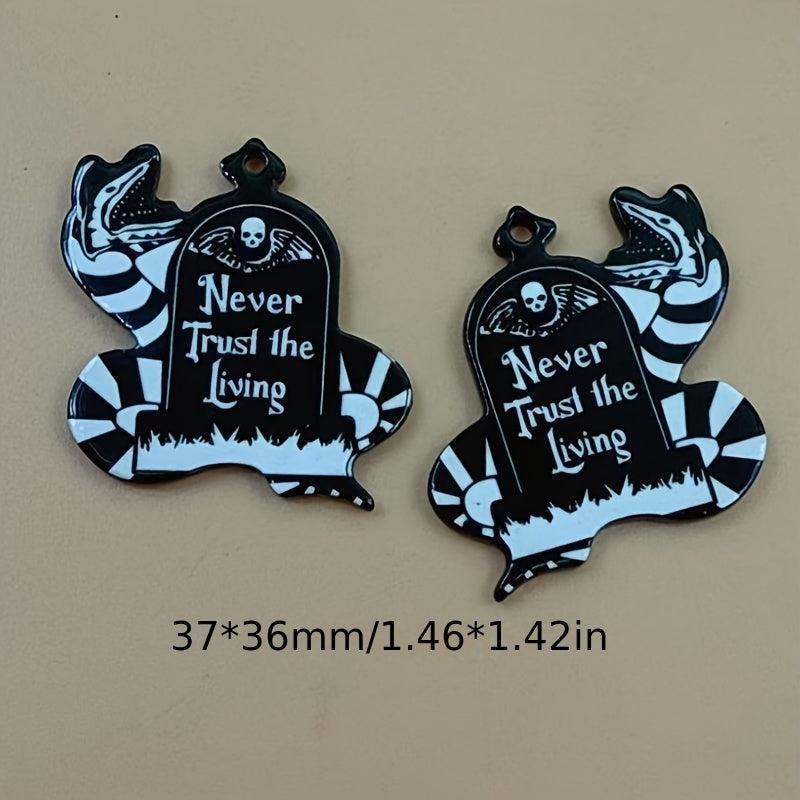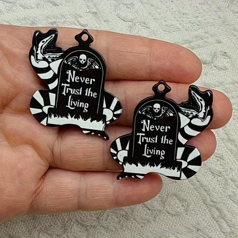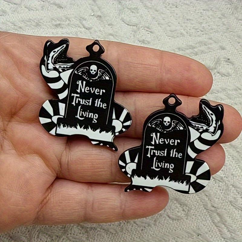 Get into the spooky spirit with these dark acrylic Halloween charms featuring a mix of skull and snake pendants. Each pendant comes with the message "Never Trust th" for added mystery and intrigue.