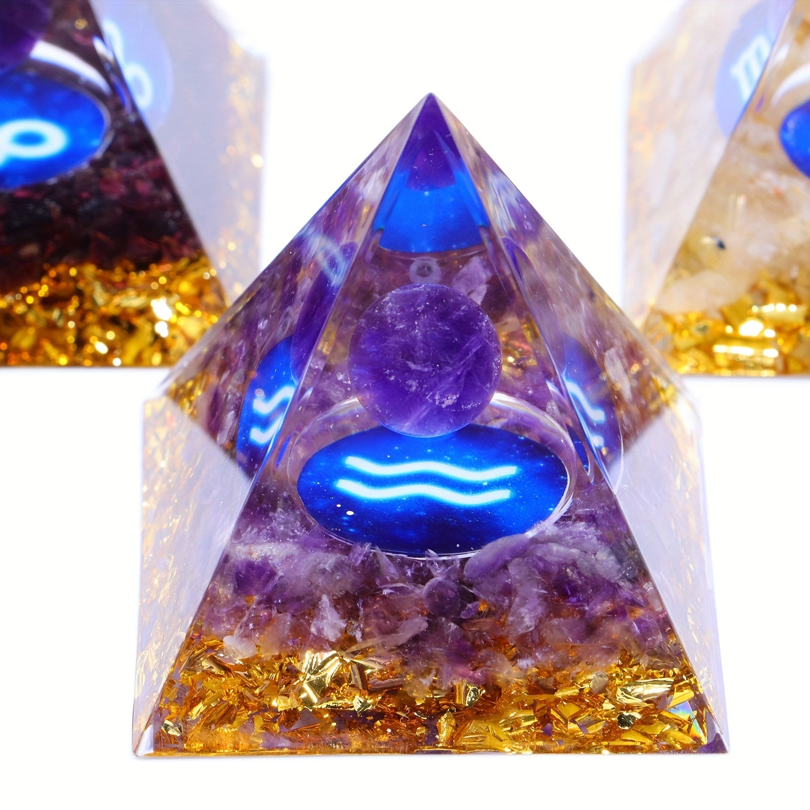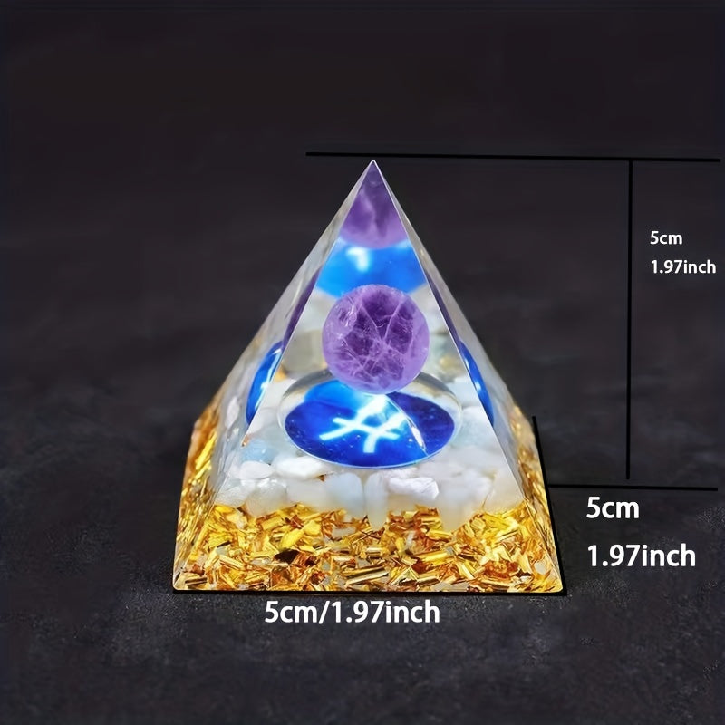 Bring balance and positive energy with this orgone pyramid featuring the twelve zodiac signs. Each pyramid is filled with amethyst and peridot crystals for healing benefits.
