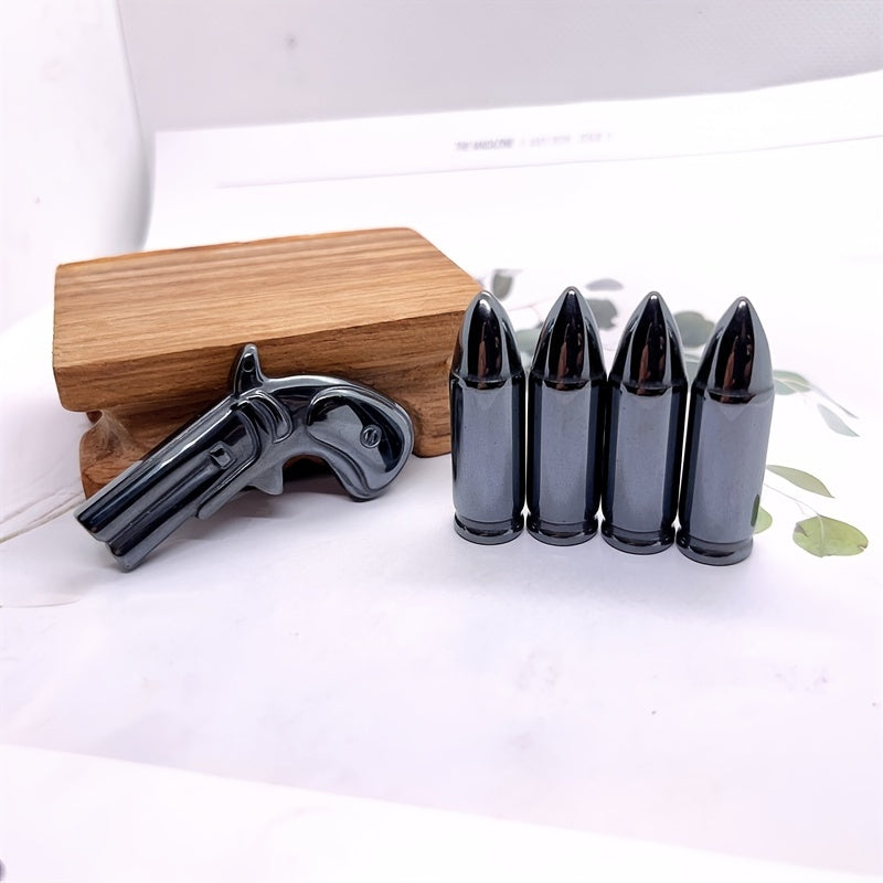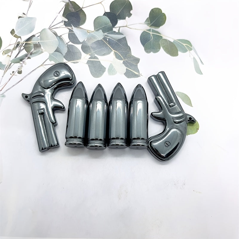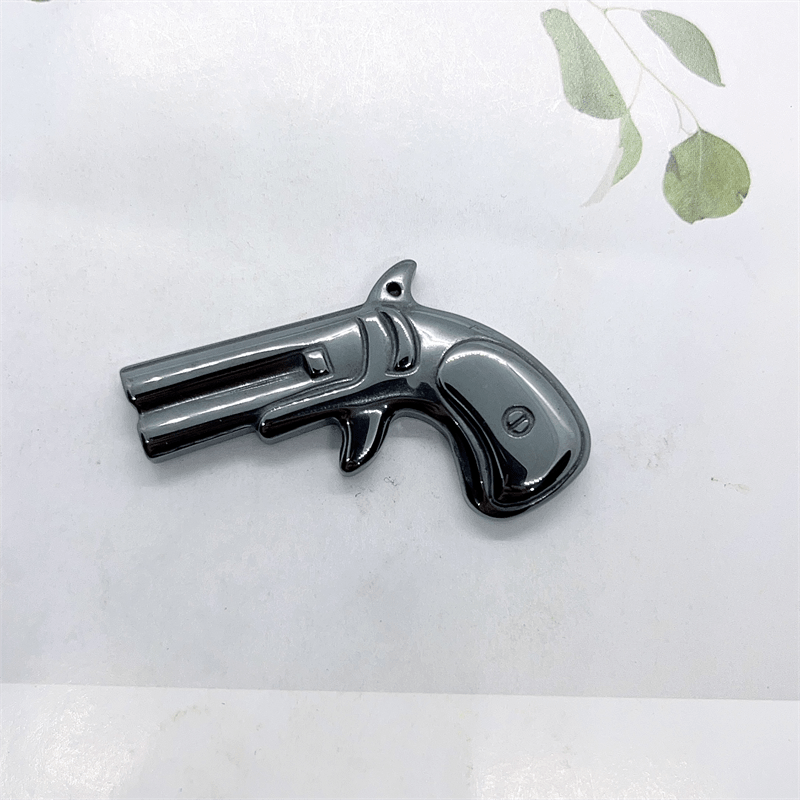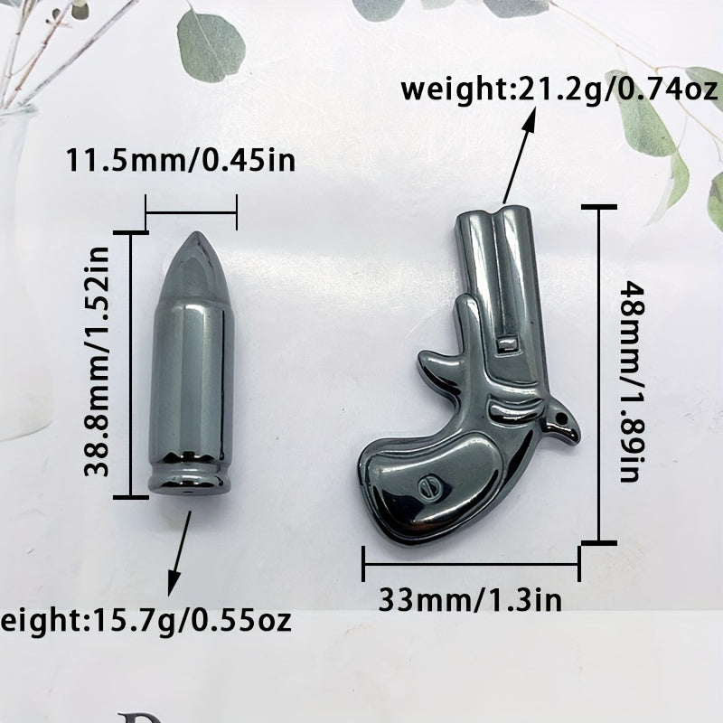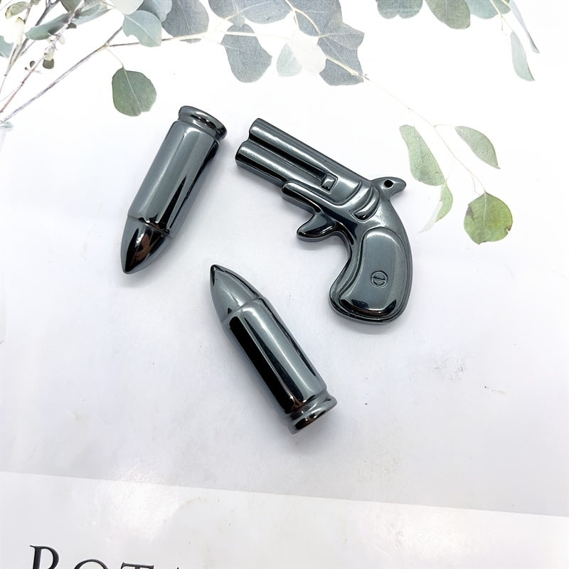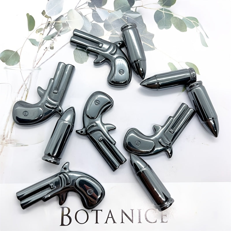 This Hematite Gun and Bullet Carving is perfect for kids DIY projects, decoration, healing stone practices, meditation, and crystal collections.