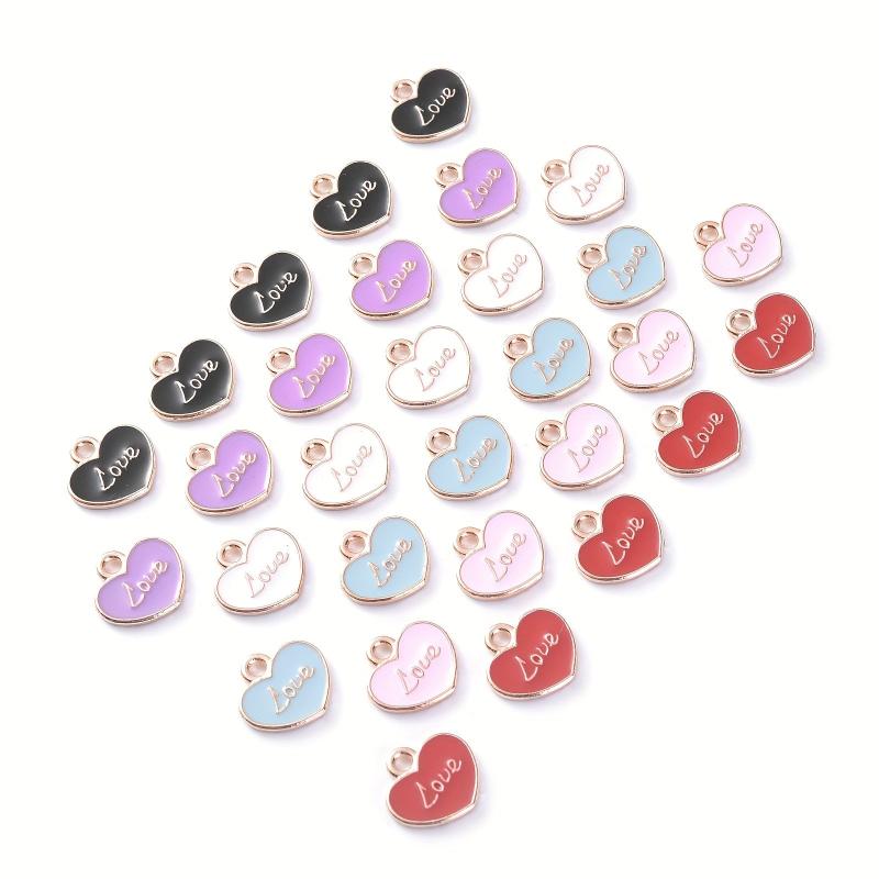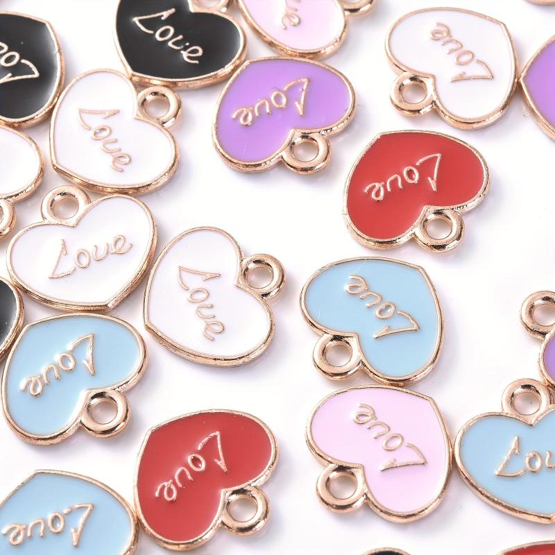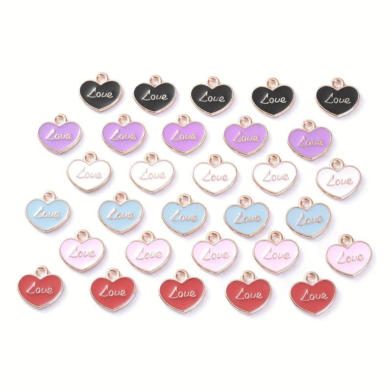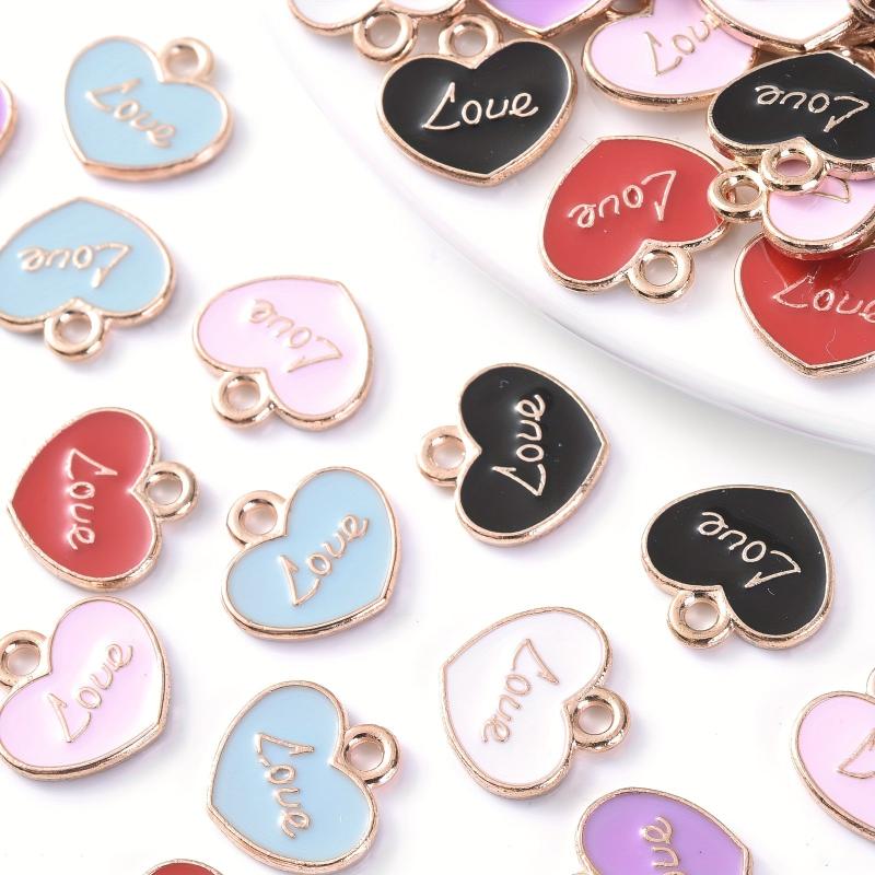 Create beautiful bracelets and necklaces with this set of heart-shaped alloy charms featuring LOVE inscription in assorted colors. Perfect for weddings and crafts.