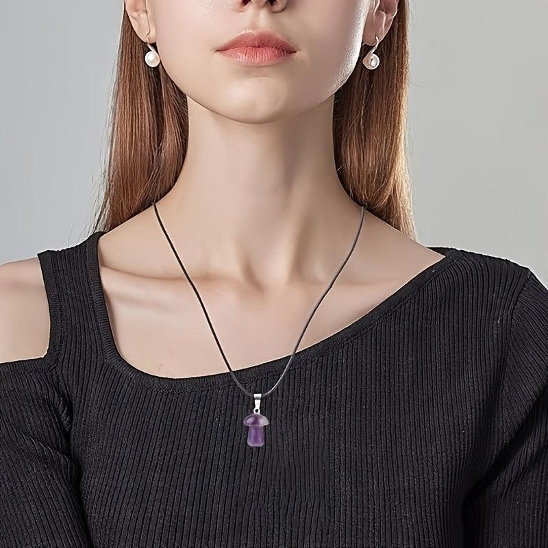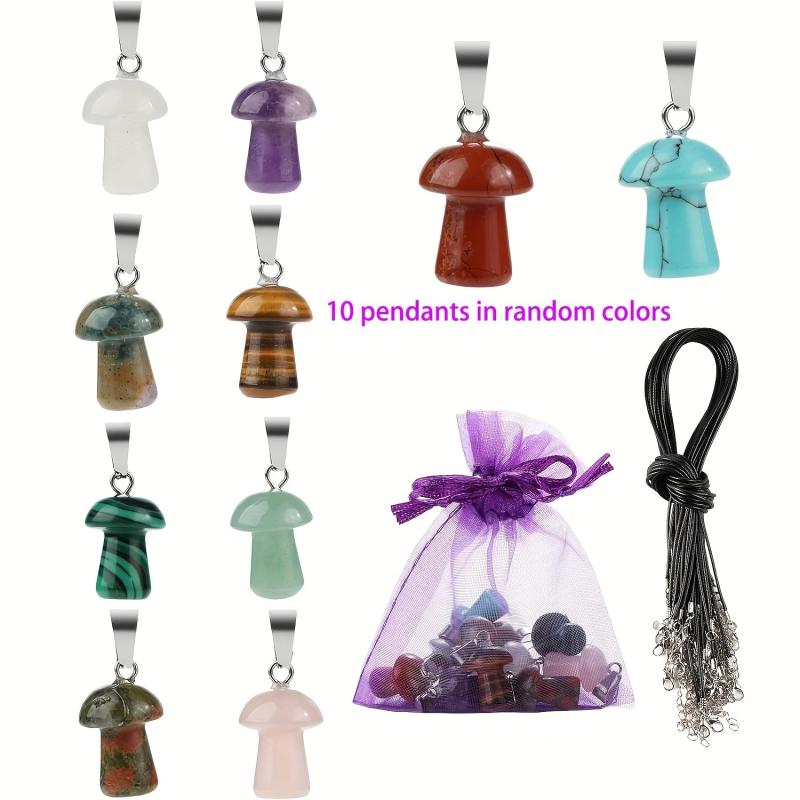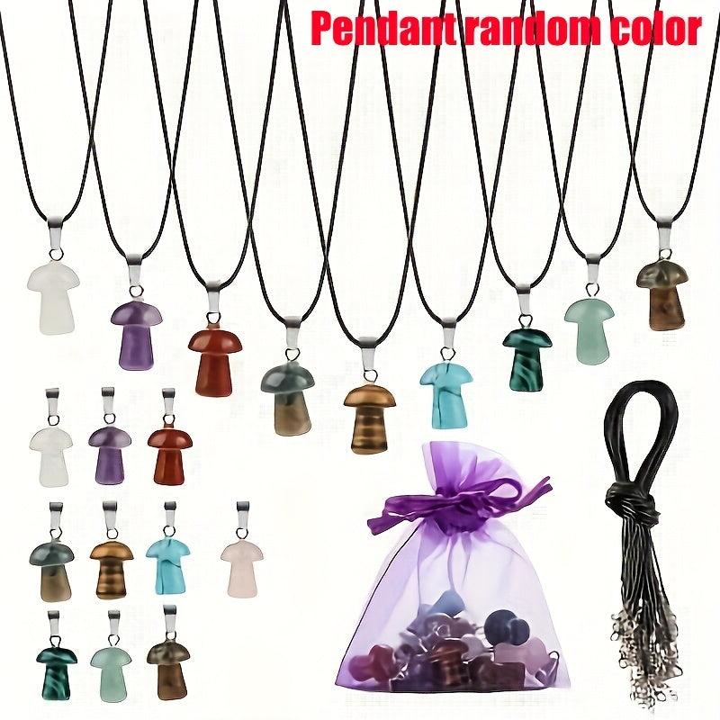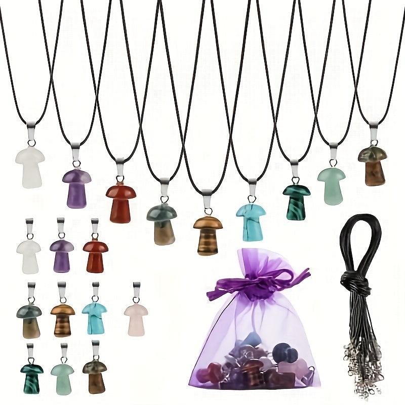 This set includes 20 unique mushroom crystal pendant necklaces with assorted gemstone charms. Each necklace is made with a leather cord for a stylish and elegant look.