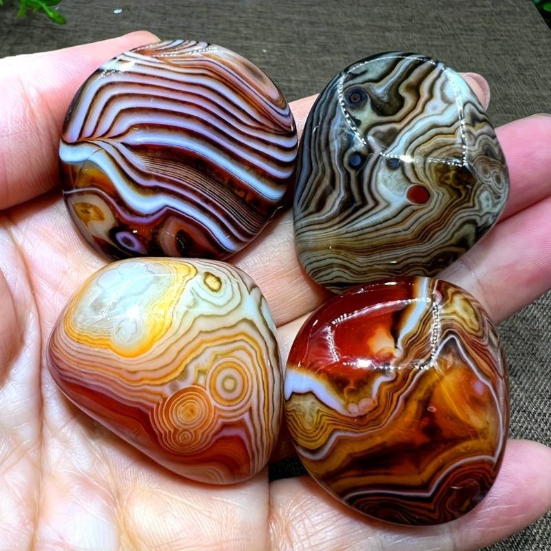 Enhance your crystal collection with this set of 4 natural silk agate palmstones. Each piece features unique stripe patterns and colors, making them a striking addition to any display.