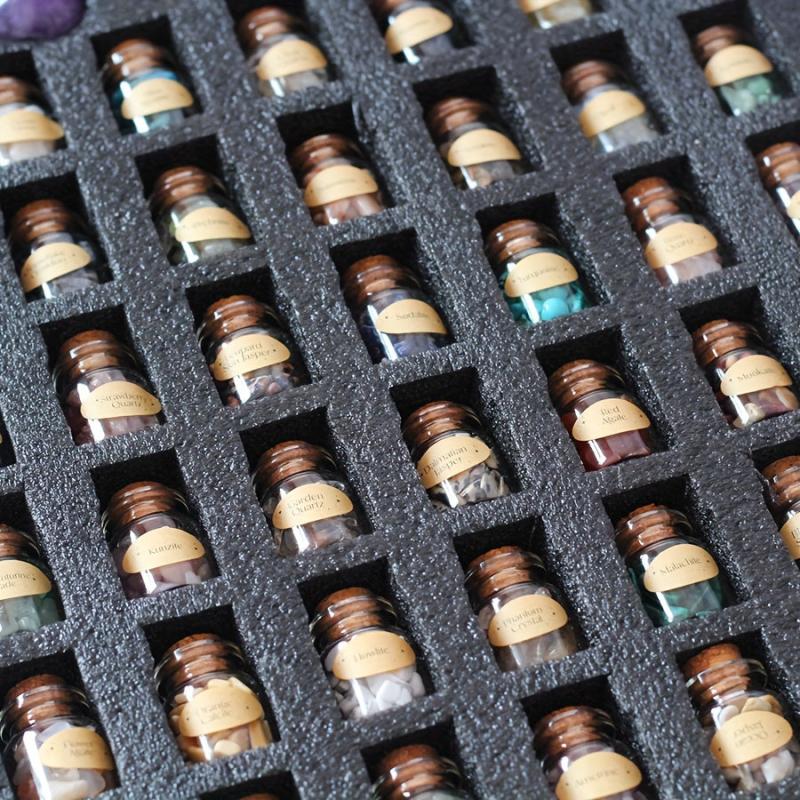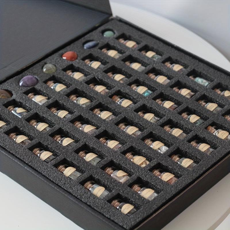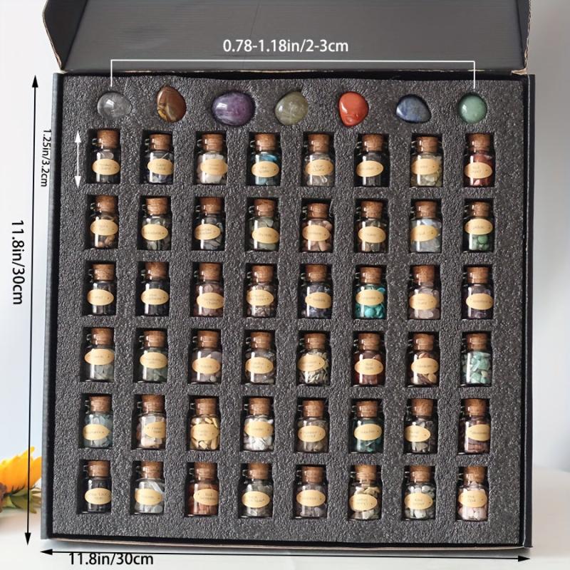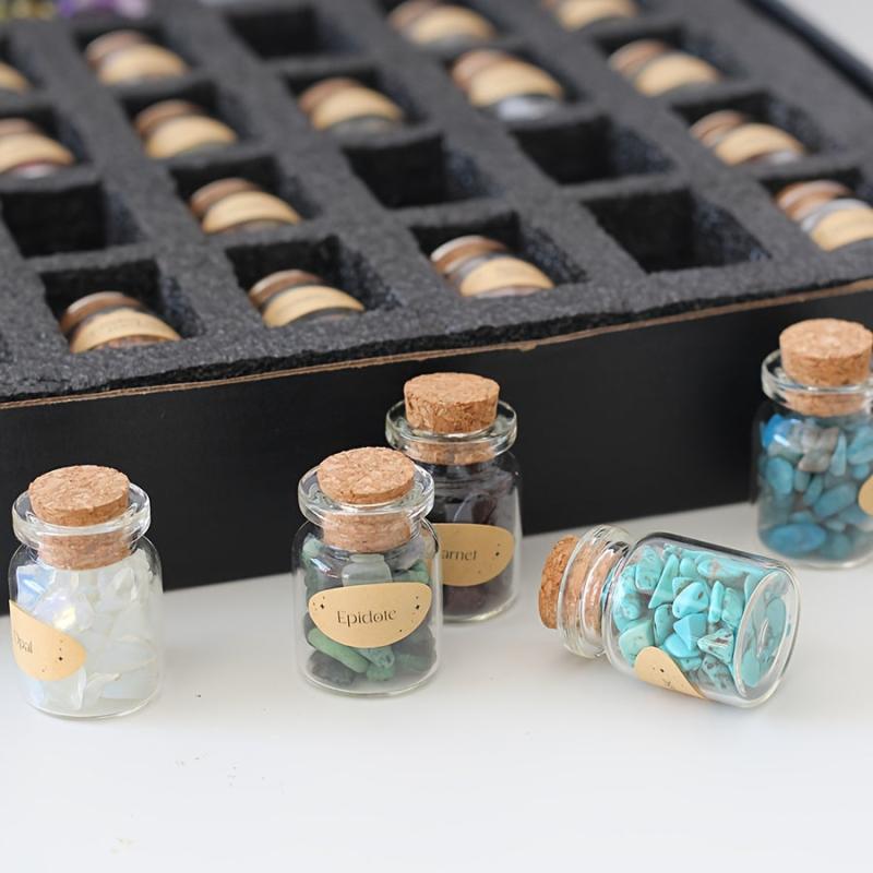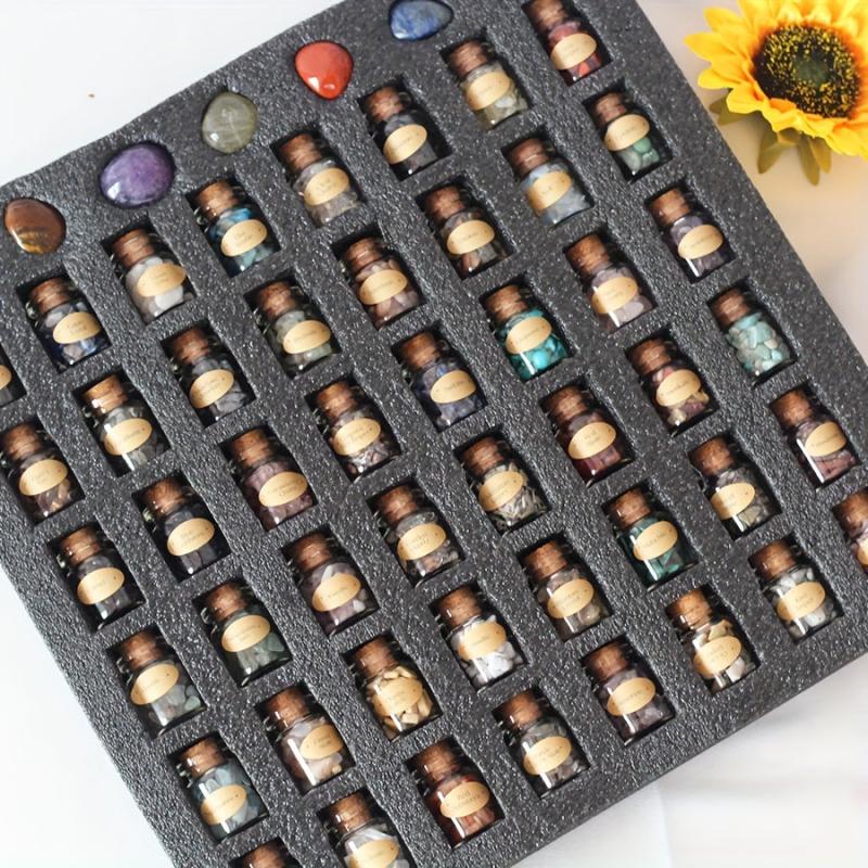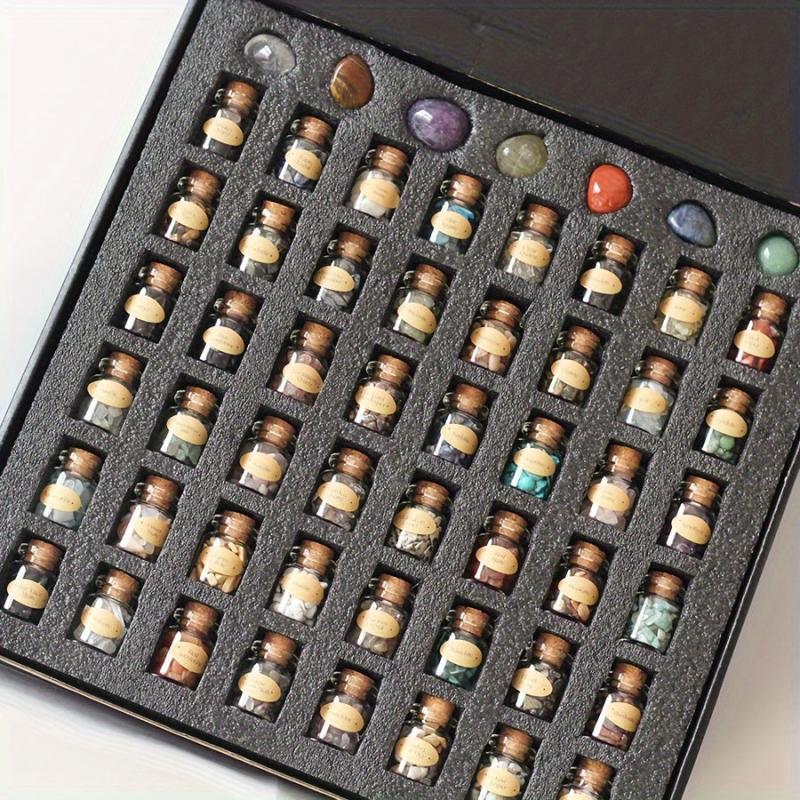 Discover the healing power of natural gemstones with this set of 55 tumbled stones in bottles. Perfect for crystal collection or healing practices.