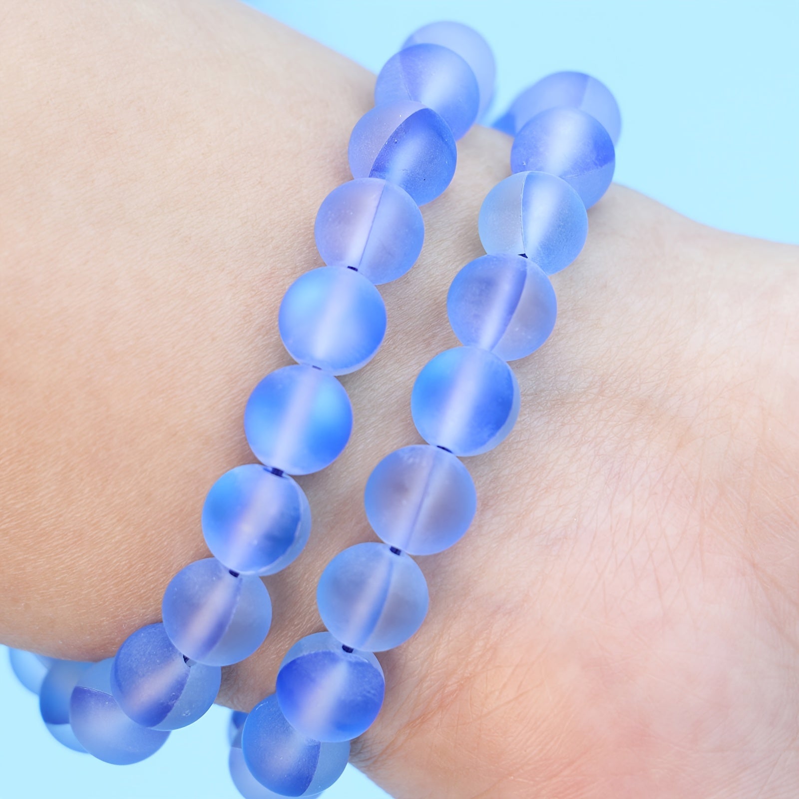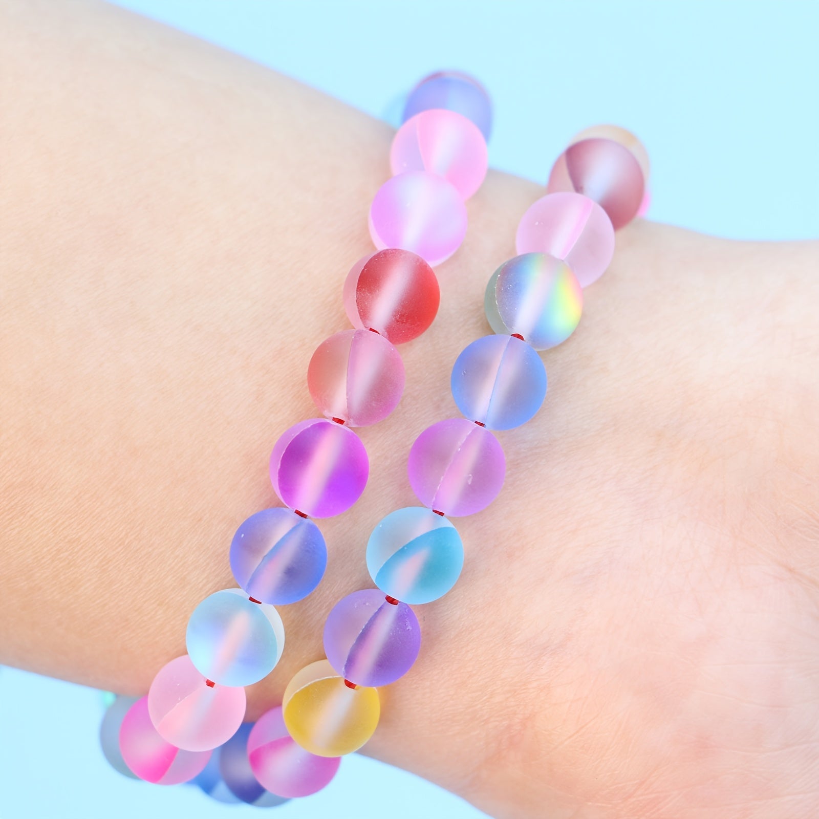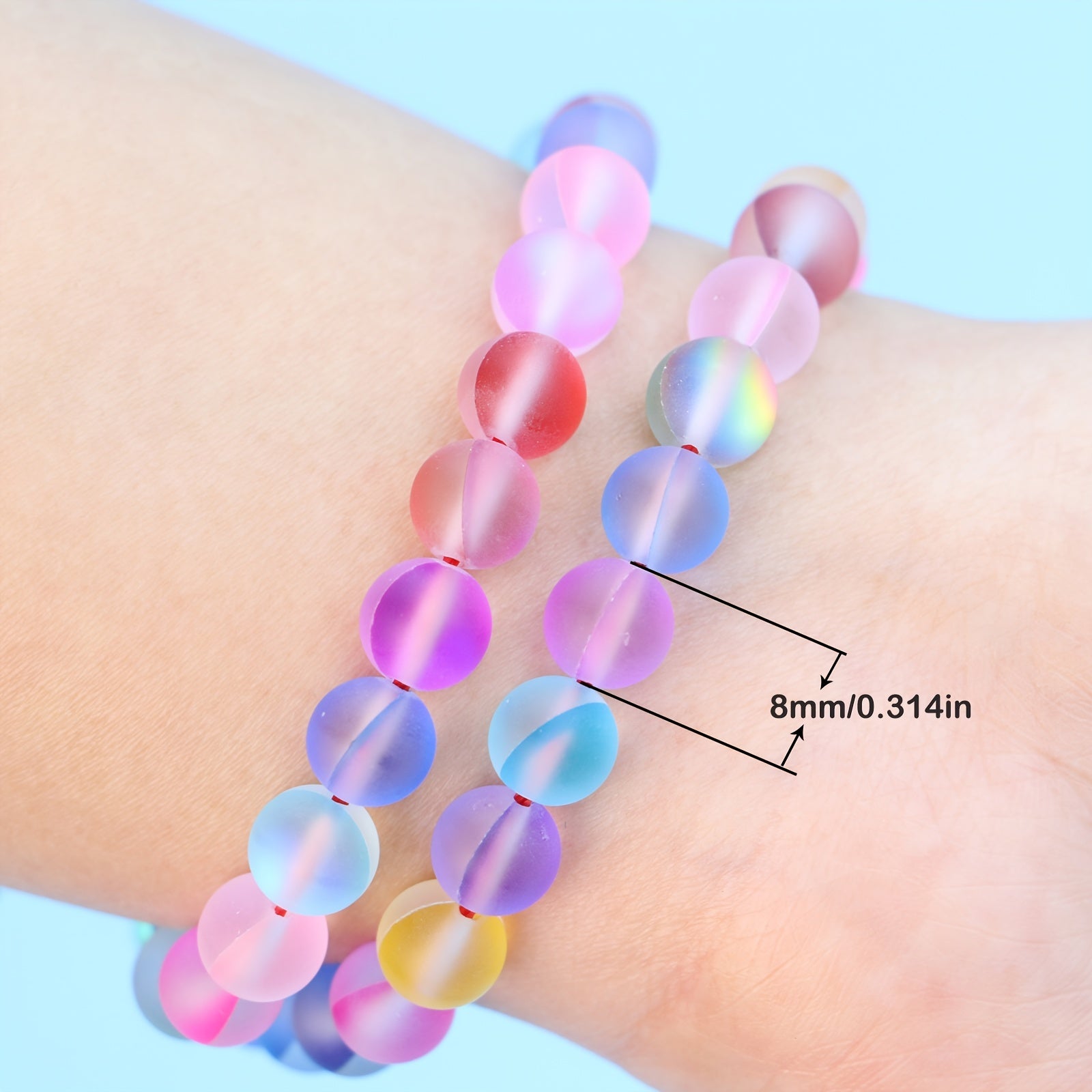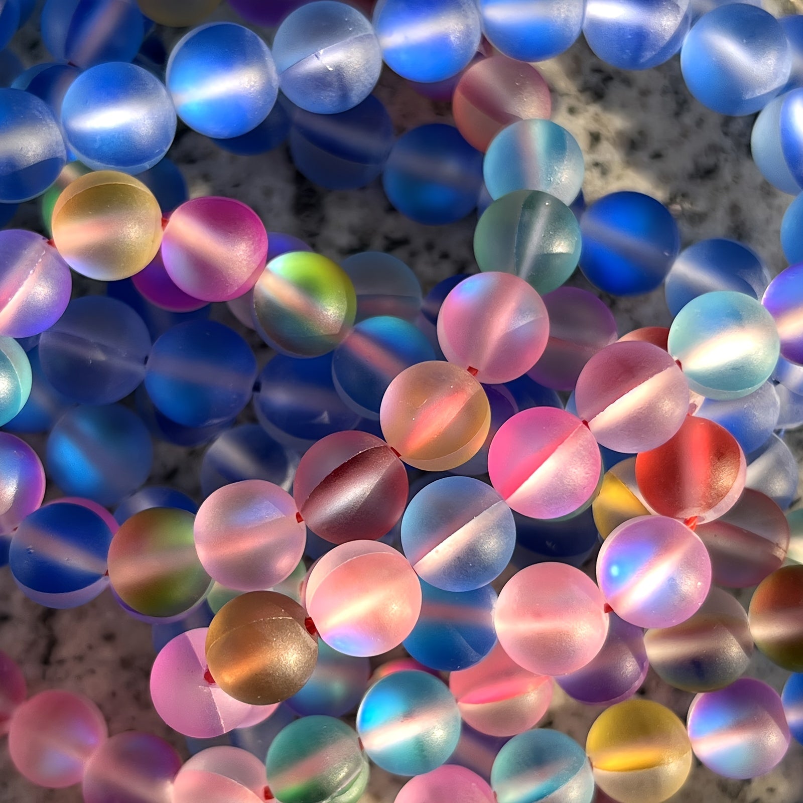 Create stunning jewelry with these 8mm frosted aurora crystal glass beads. The mixed glitter moonstone beads add a rainbow effect to your designs. Perfect for making bracelets, necklaces, and earrings.