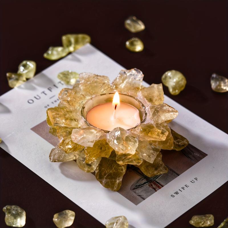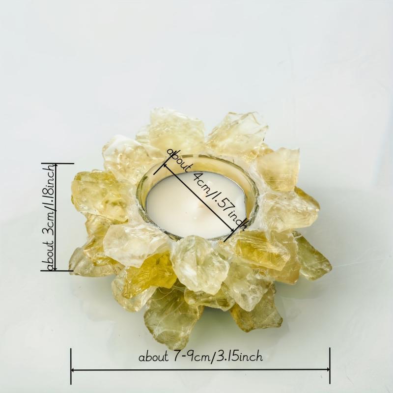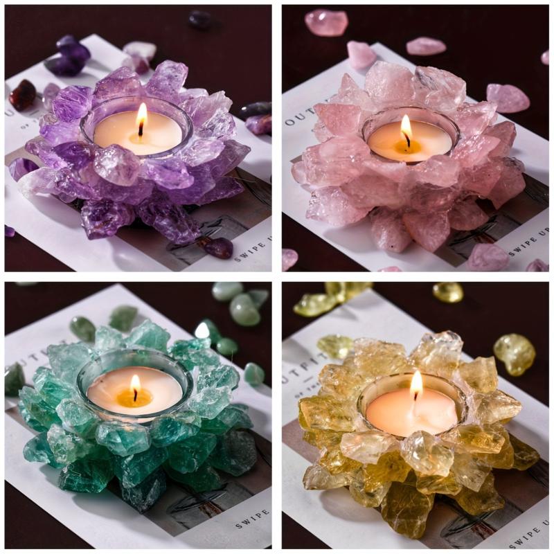 This stunning candle holder is made of citrine, rose quartz, fluorite, and amethyst crystals, creating a beautiful and harmonious decoration for your home or holiday setting.