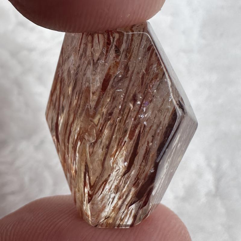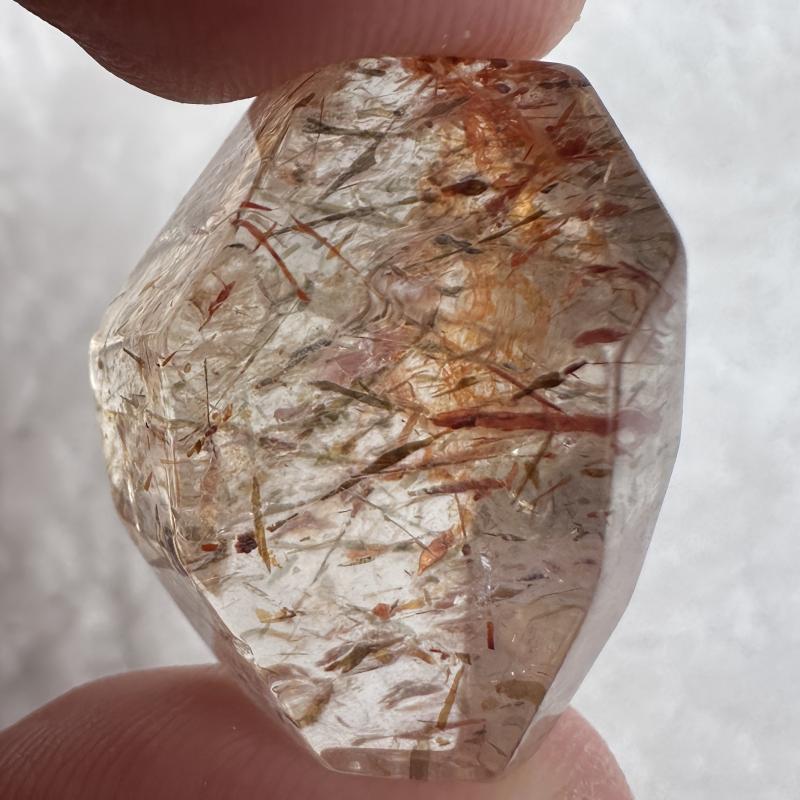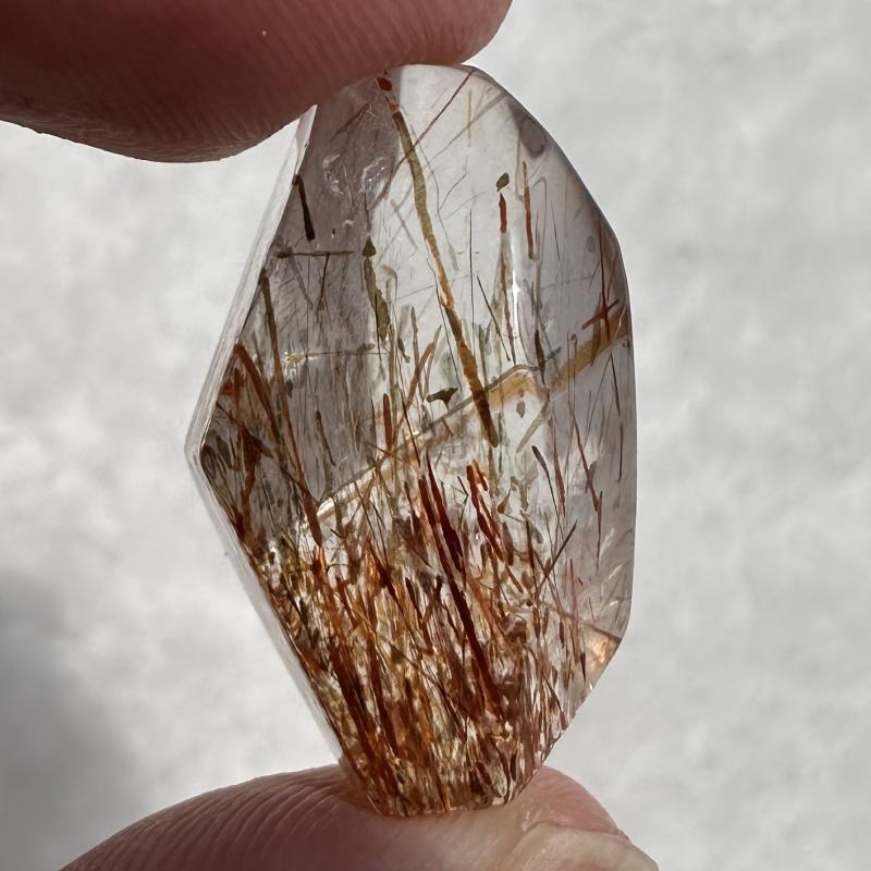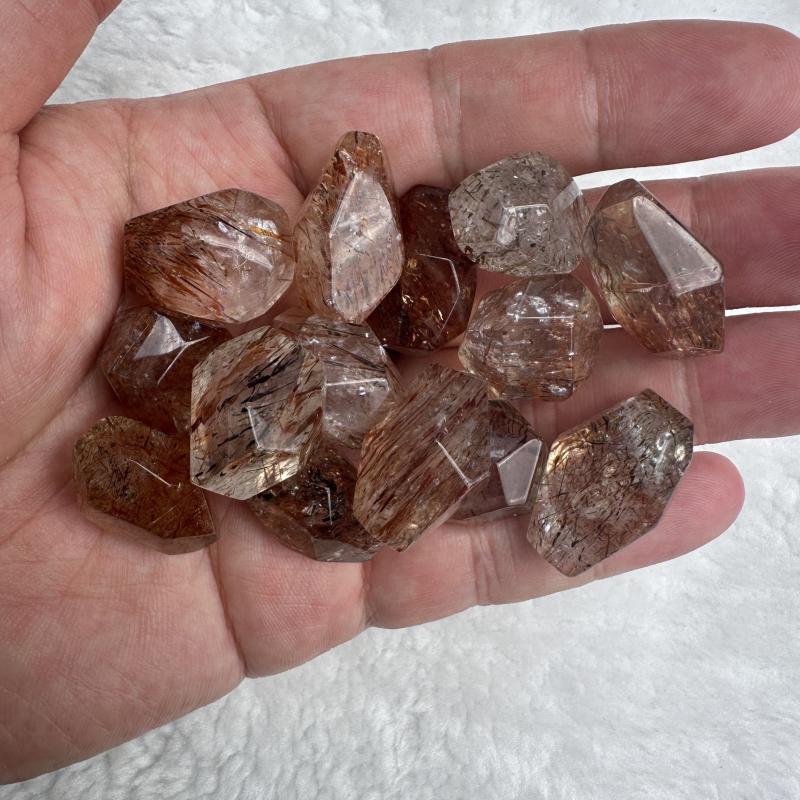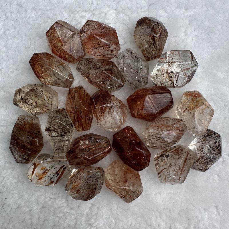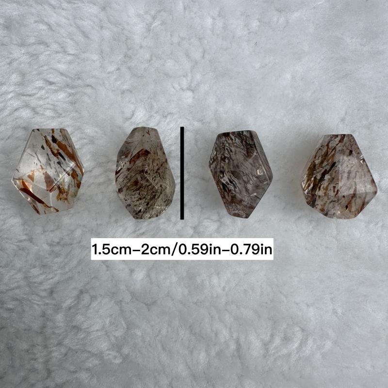 This faux gemstone features colorful rutile inclusions within clear rock crystal, perfect for crystal grids, collection, and gifting.