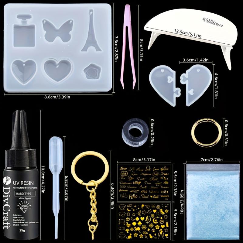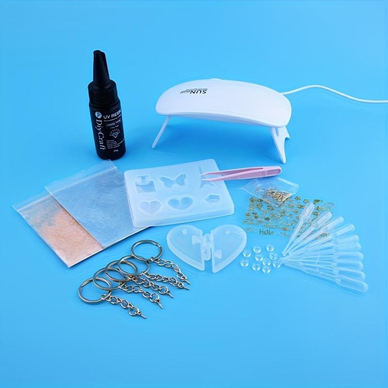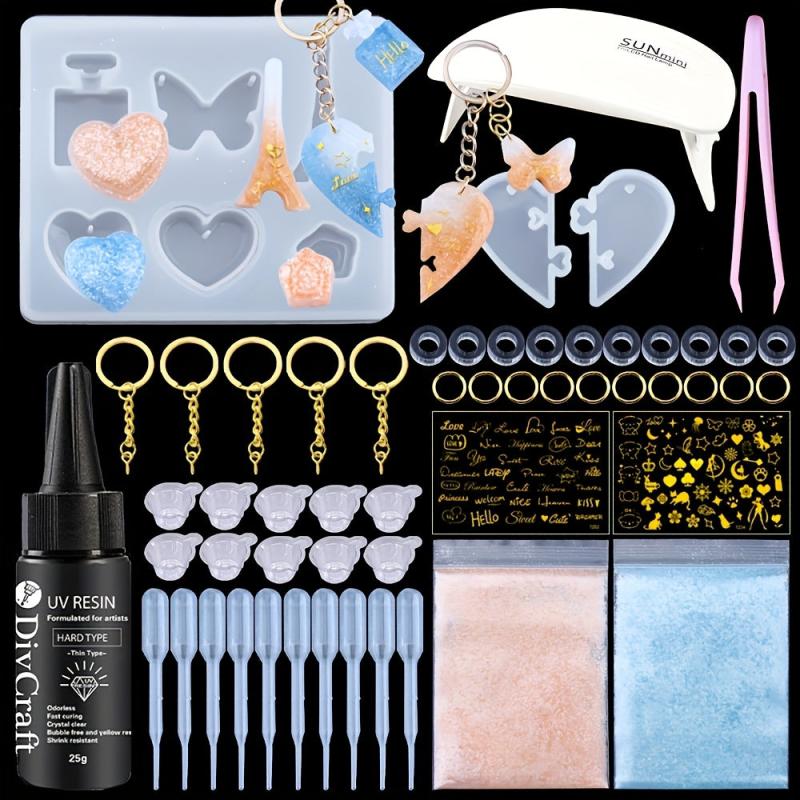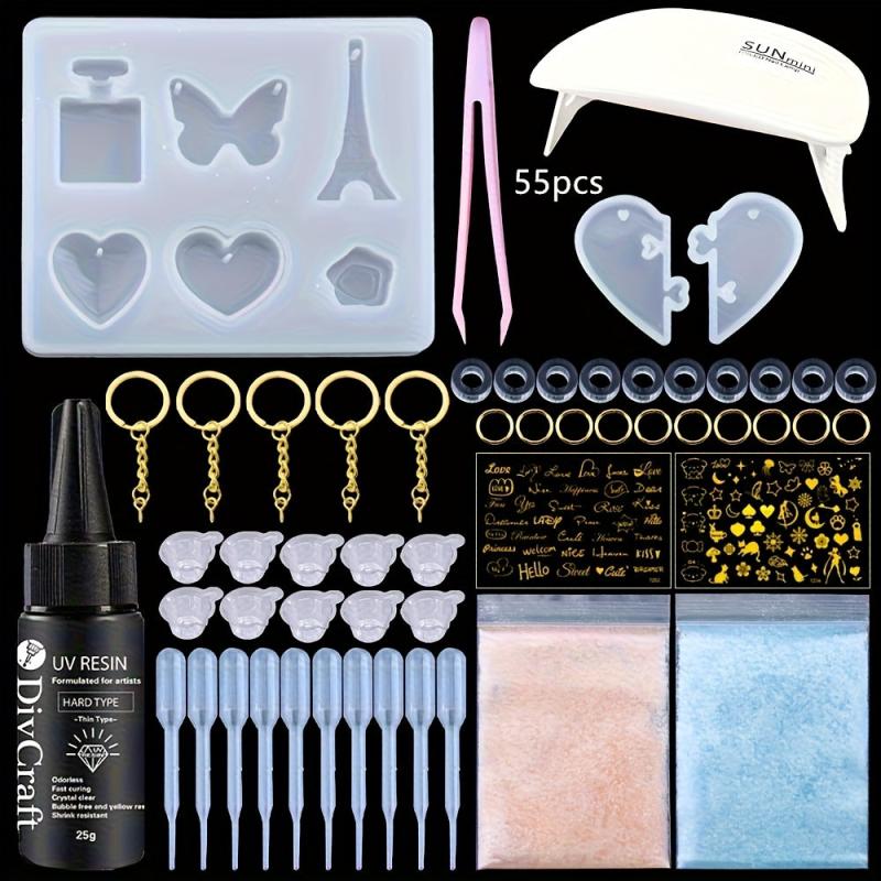 Create beautiful heart-shaped pendants with this 55-piece DIY UV resin jewelry mold kit. Includes a UV lamp for quick curing and 25g of glue for secure adhesion.