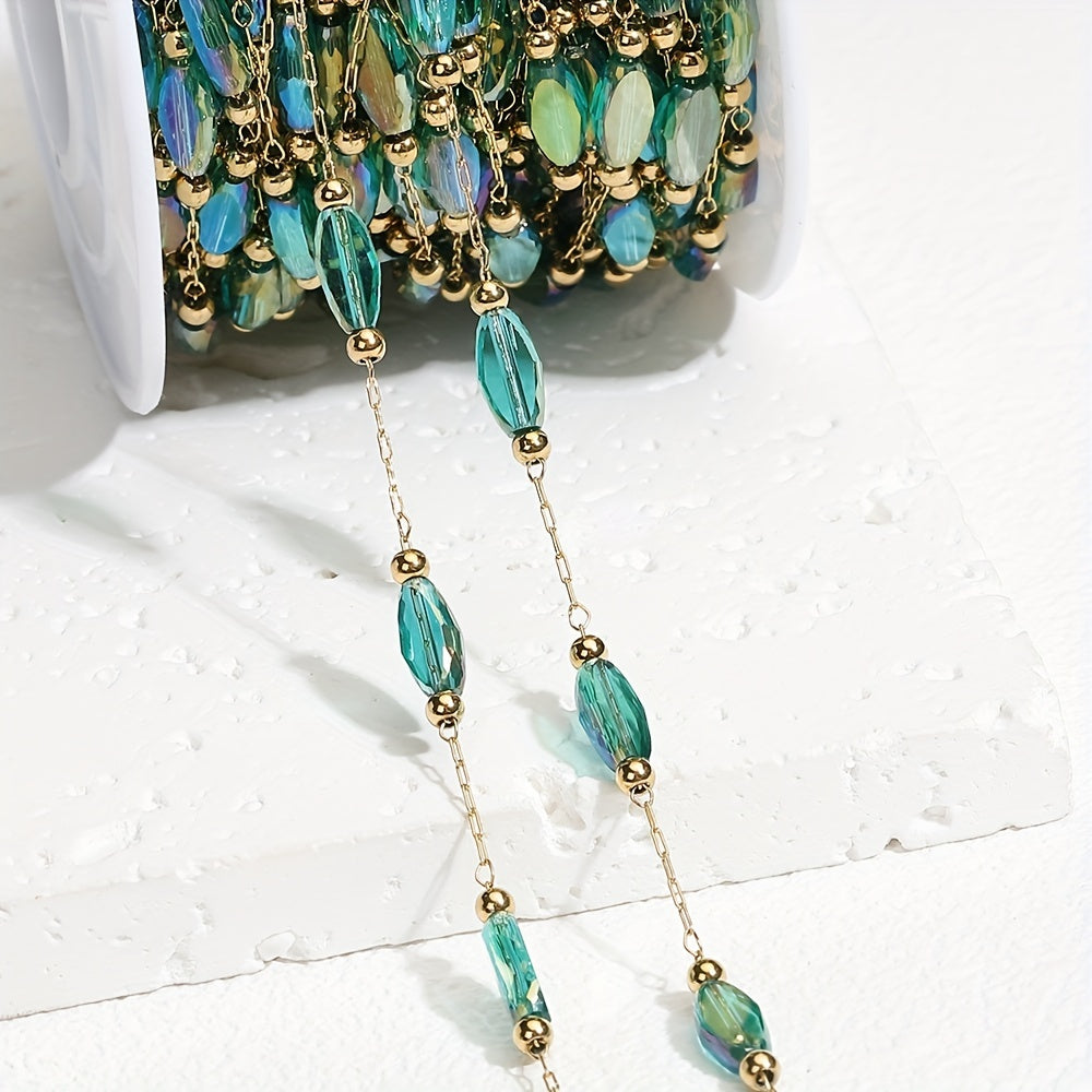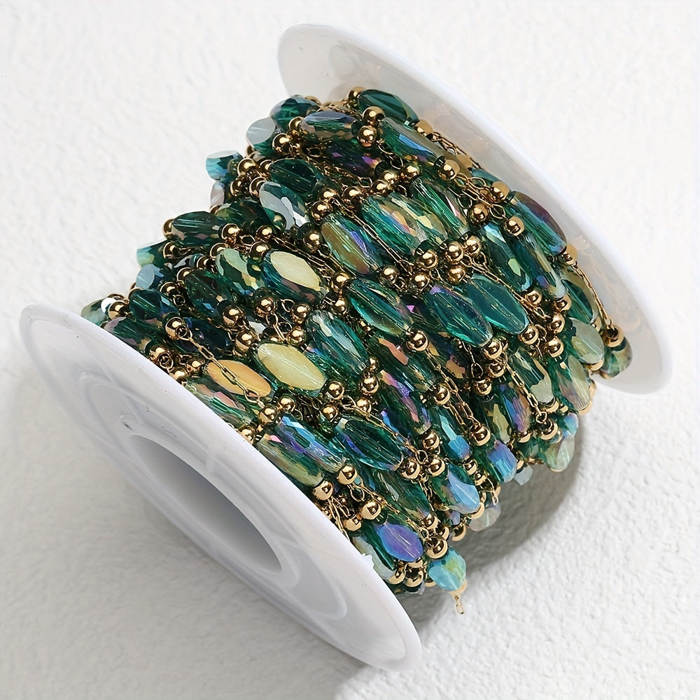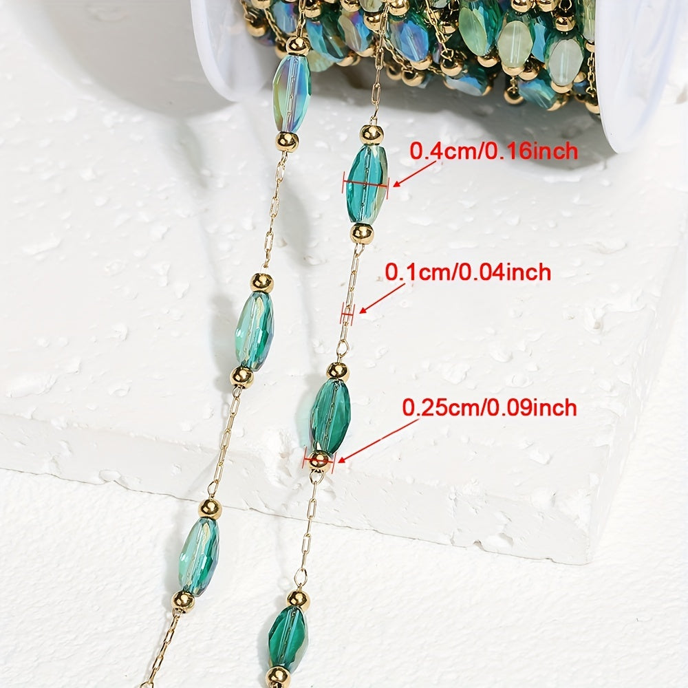 Elegant green beaded chain with artificial crystals, perfect for creating stunning jewelry pieces. Versatile craft chain suitable for various projects.