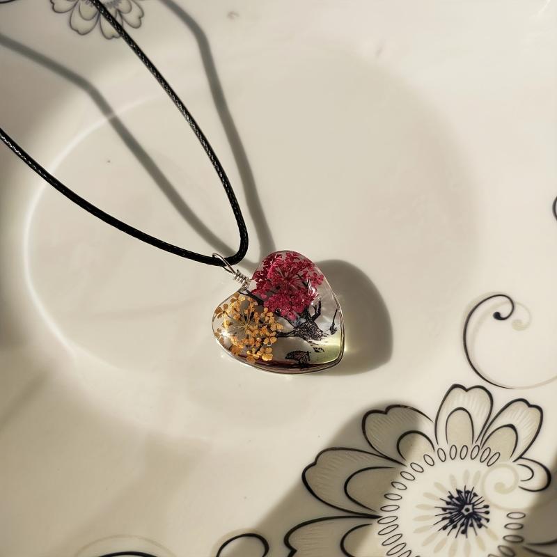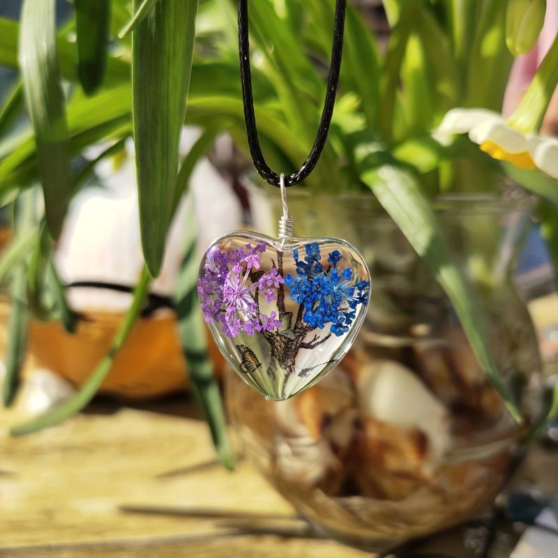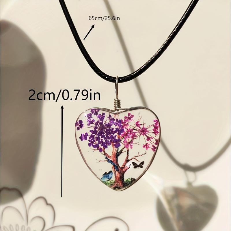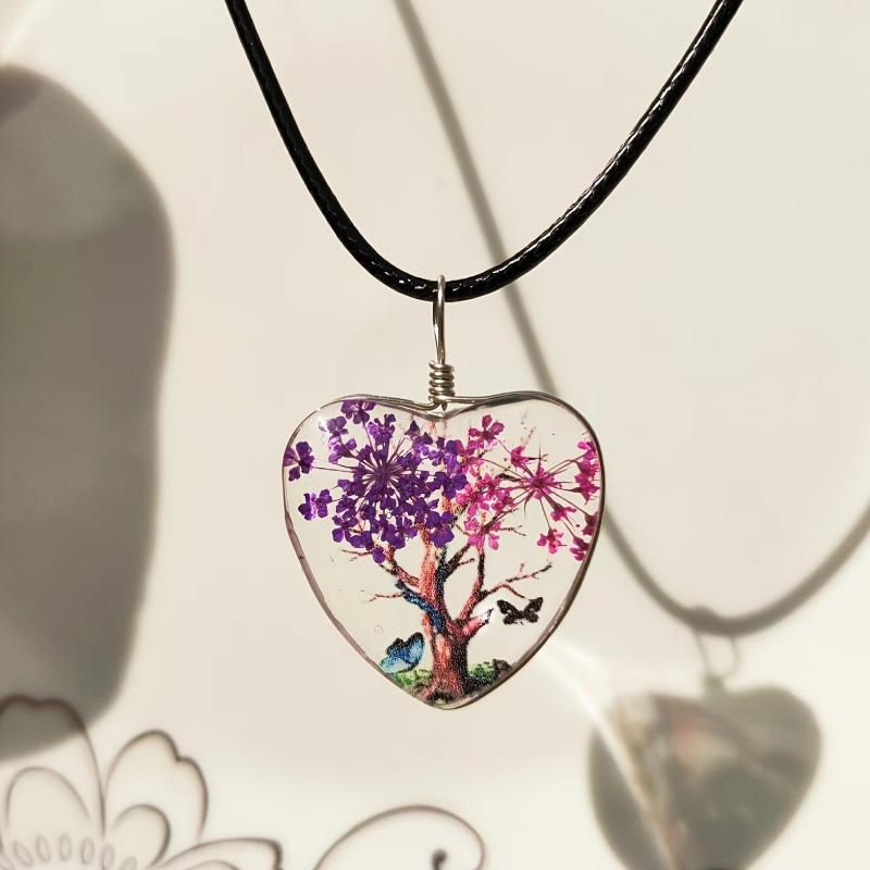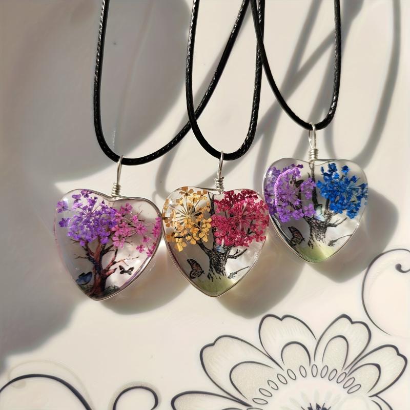 This set includes a beautiful heart-shaped glass pendant necklace featuring a Tree of Life and a Starflower design. The pendant is crafted with intricate details that symbolize love, life, and nature.