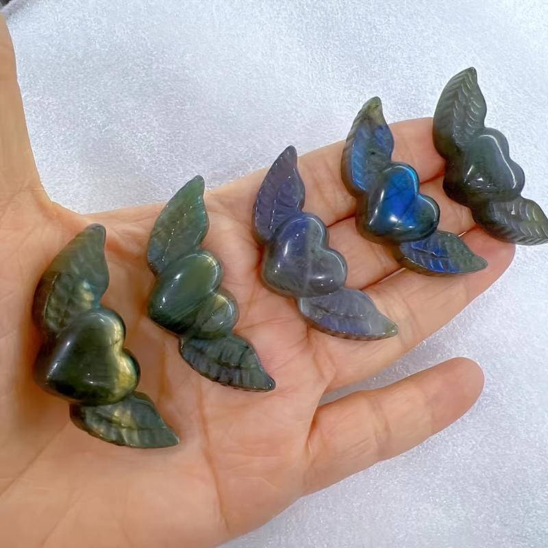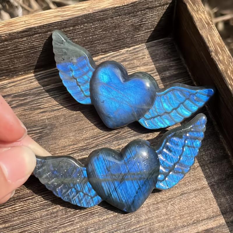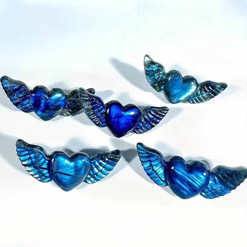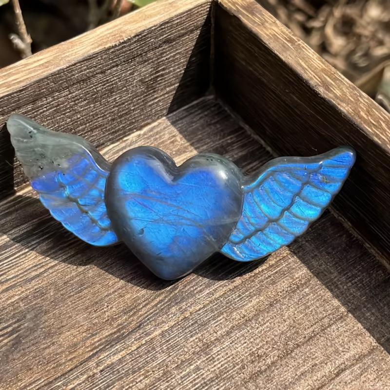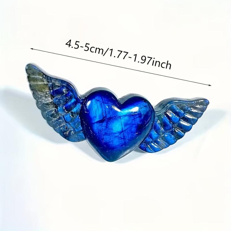 Bring a touch of mystical beauty to your space with this hand-carved Labradorite heart crystal adorned with angel wings. Display it as a unique home, office, or garden decor piece that showcases iridescent play of colors.