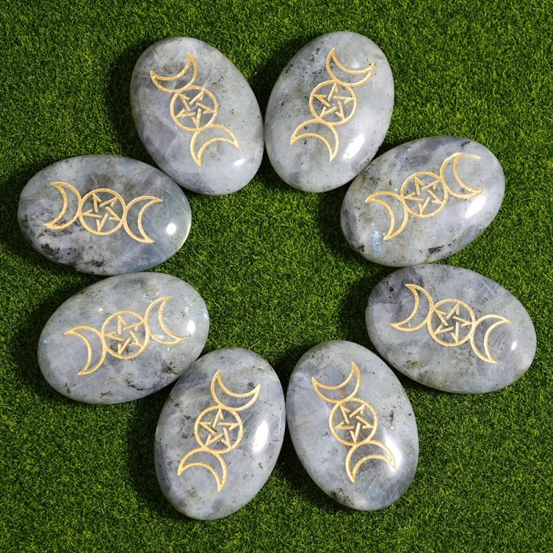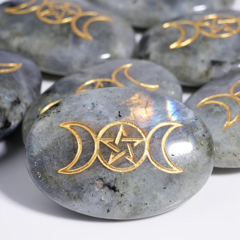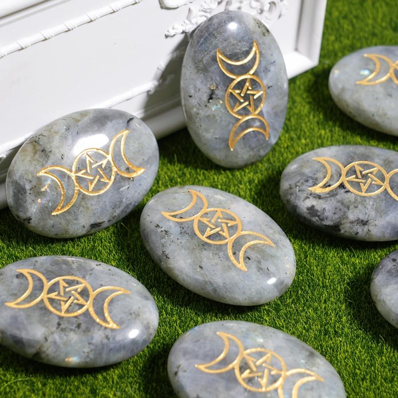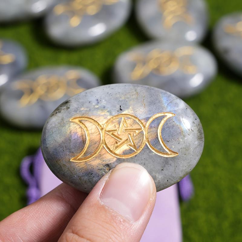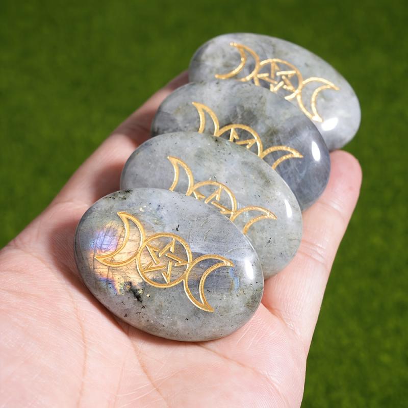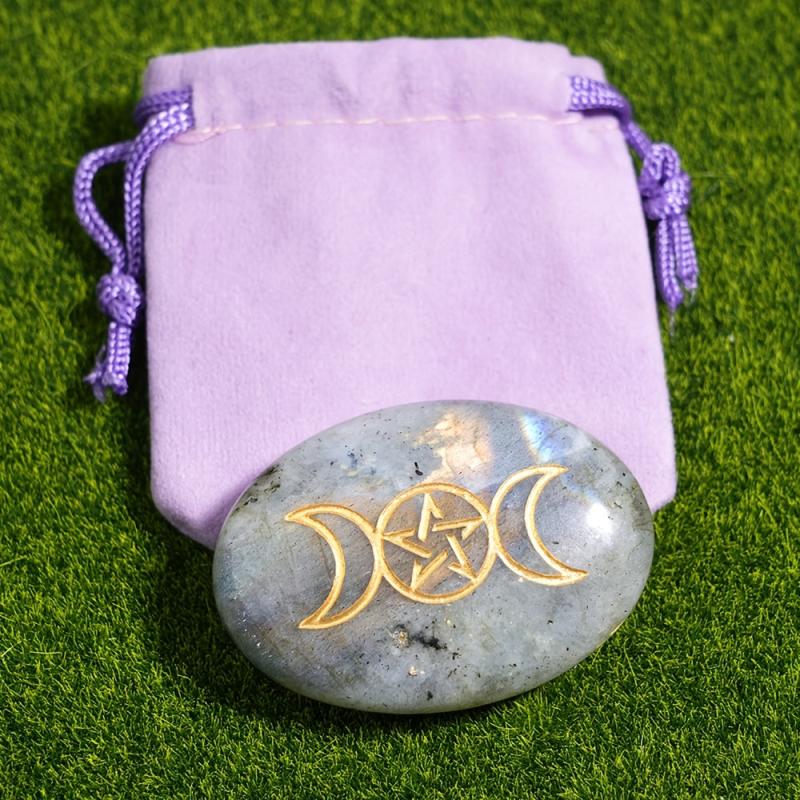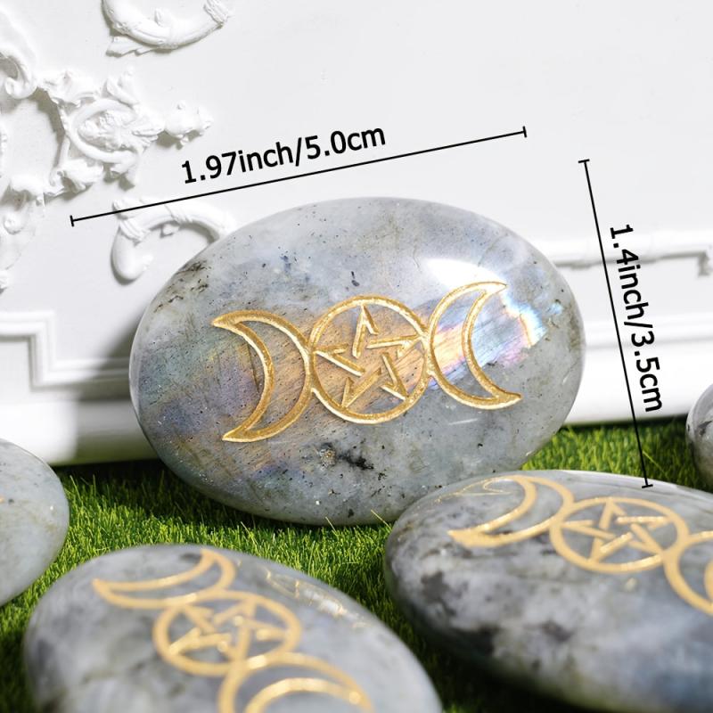 Carved from natural Labradorite, this moon rune palm stone is perfect for yoga practice or collection. The three-phase design includes a sparkling crescent.