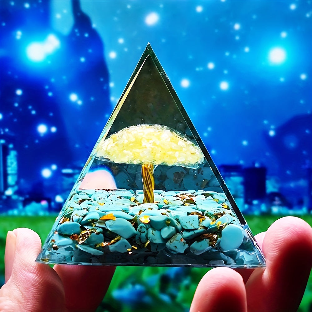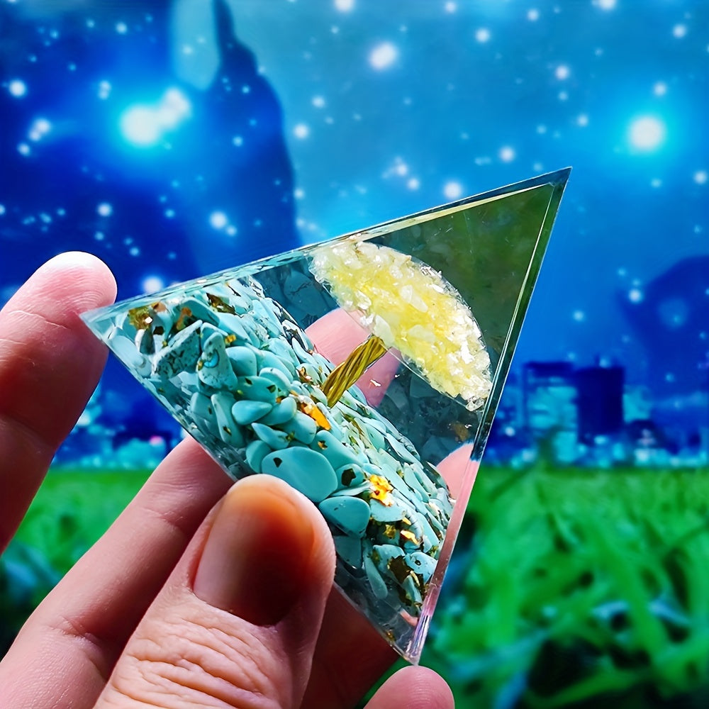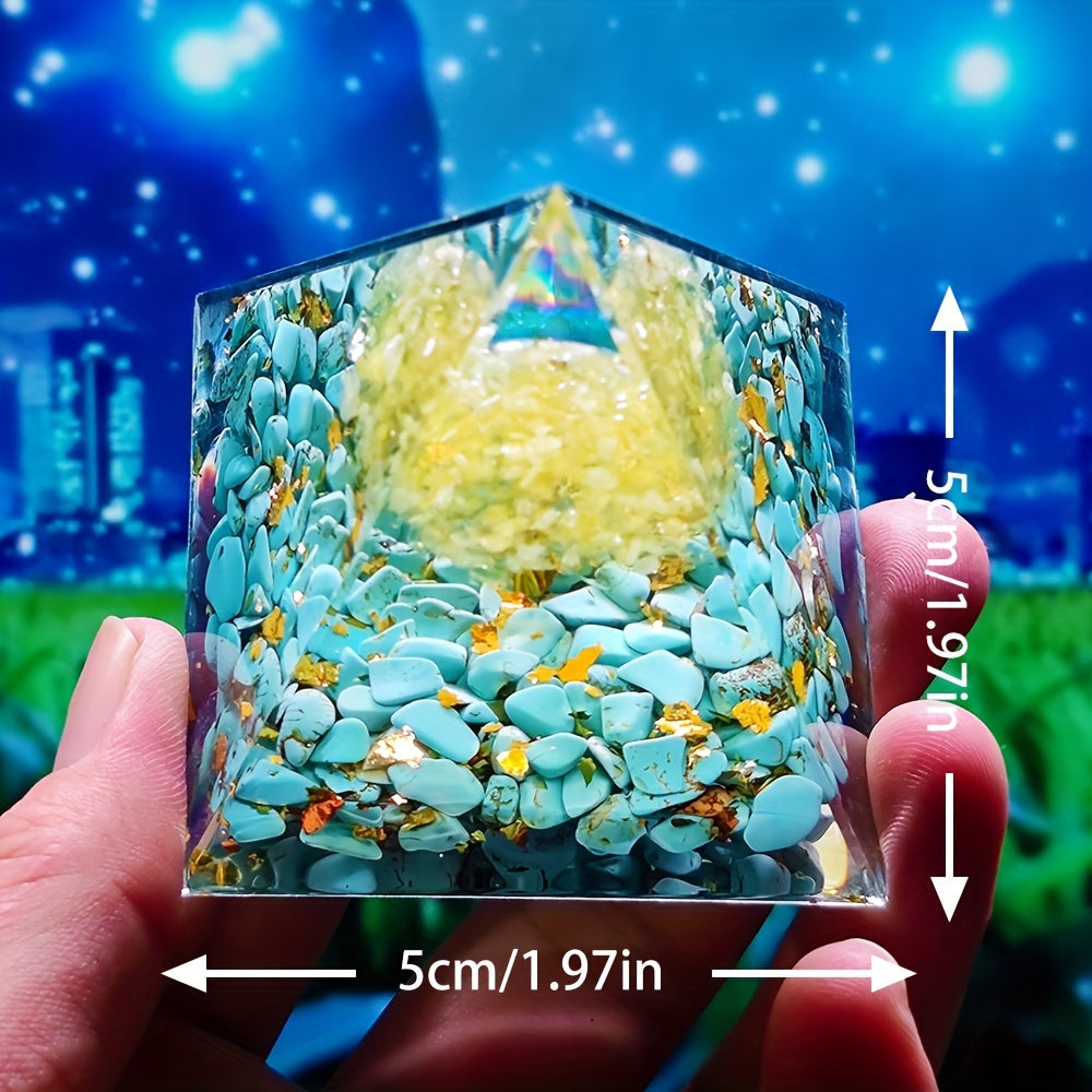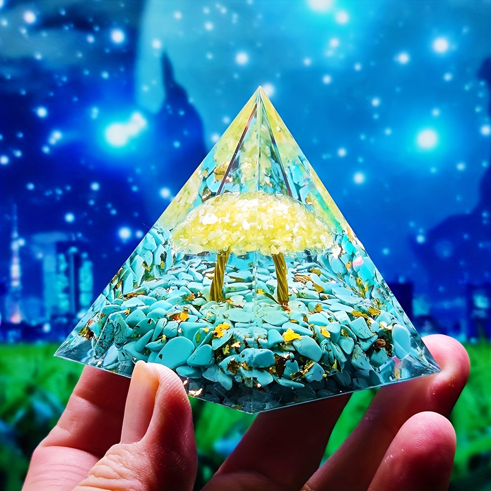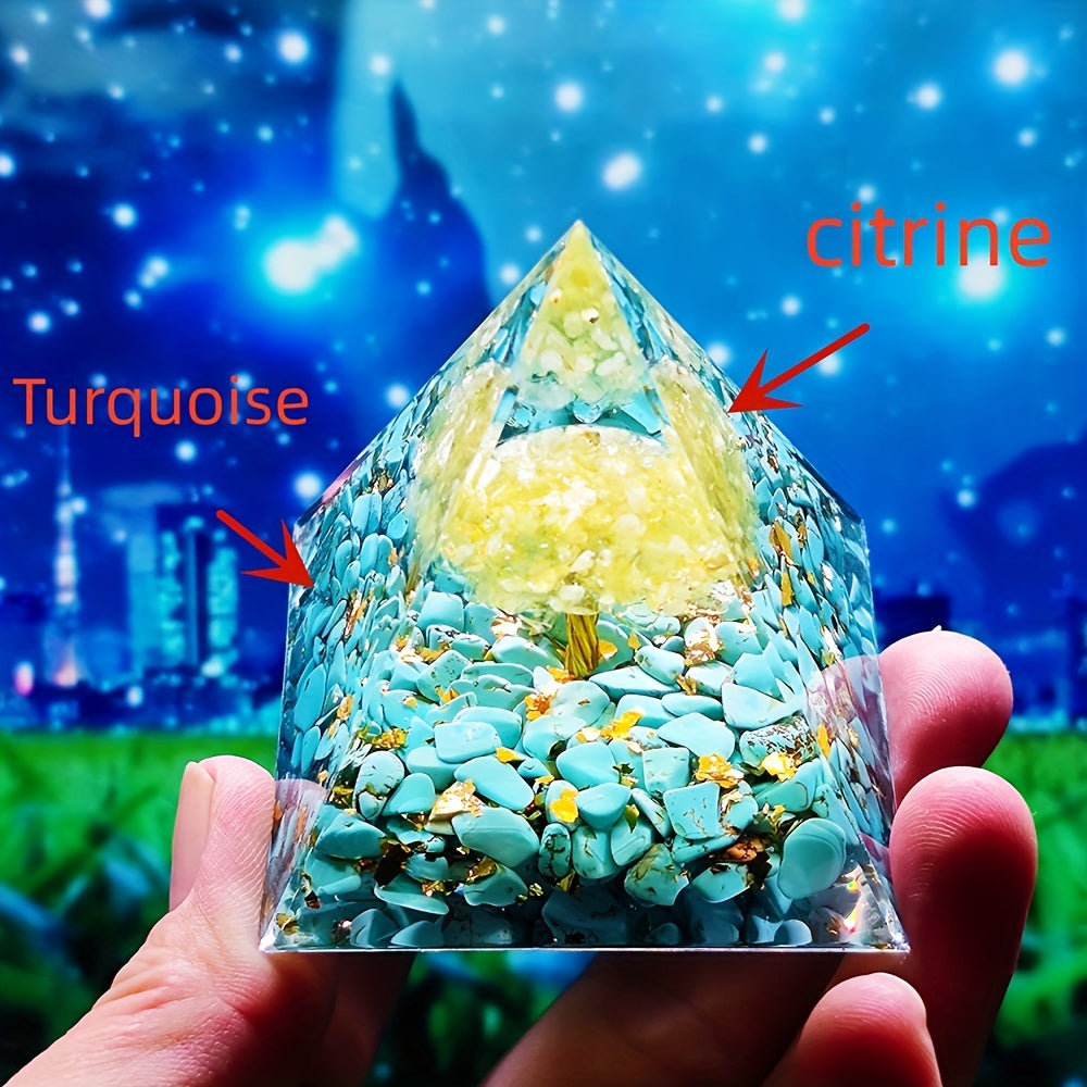 This orgone pyramid is made with natural citrine and is designed to help balance chakra energies while providing healing benefits.