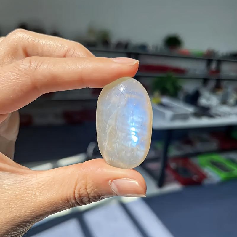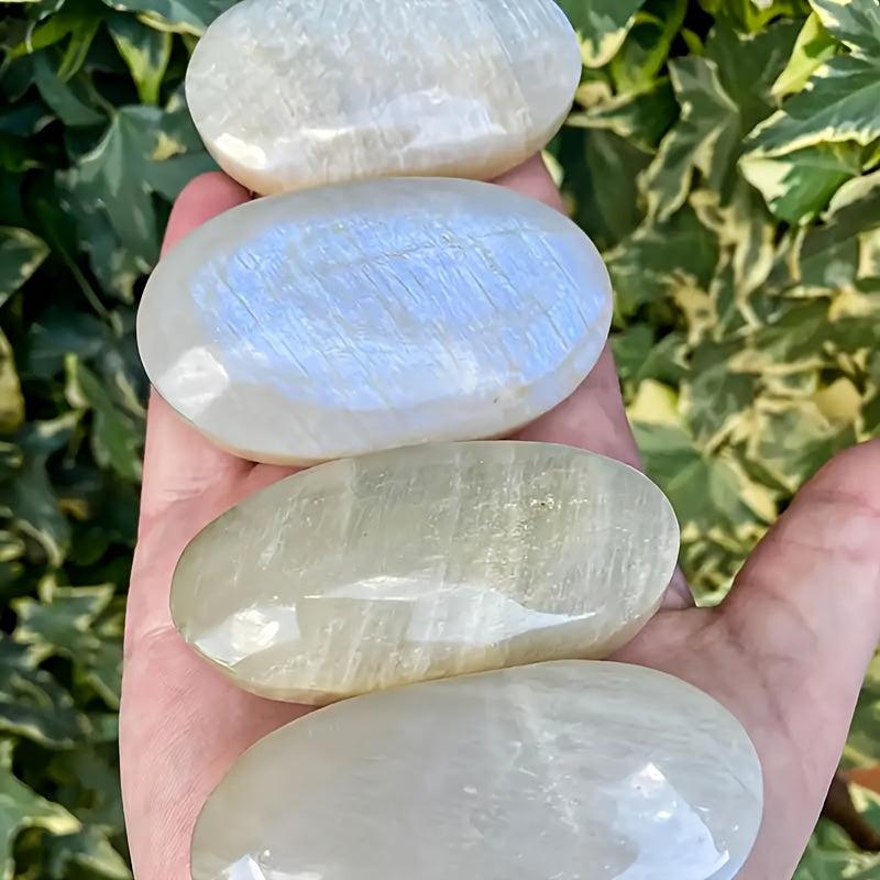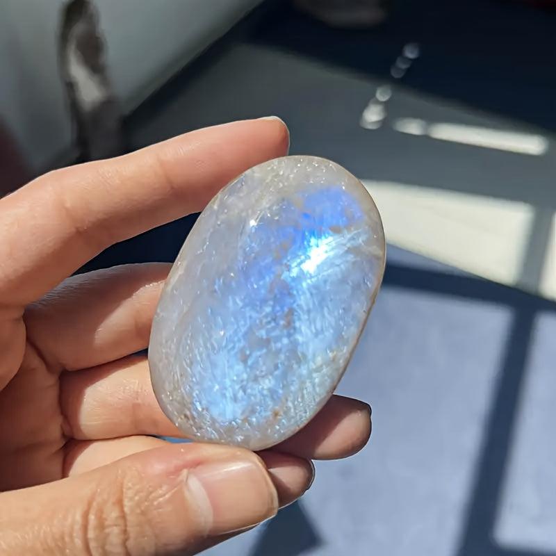Enhance your home decor with this natural moonstone palm crystal featuring a smooth polished surface and mesmerizing rainbow sparkle. Perfect for tabletop display or as a Christmas gift.