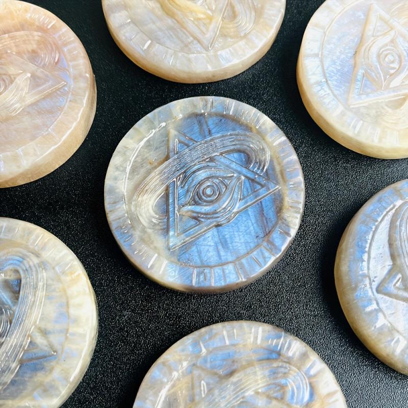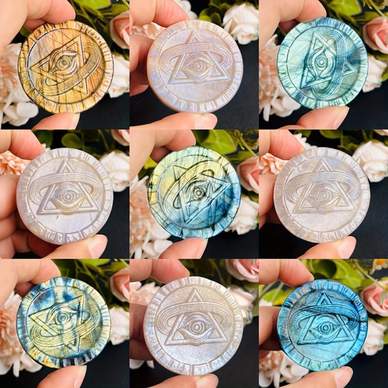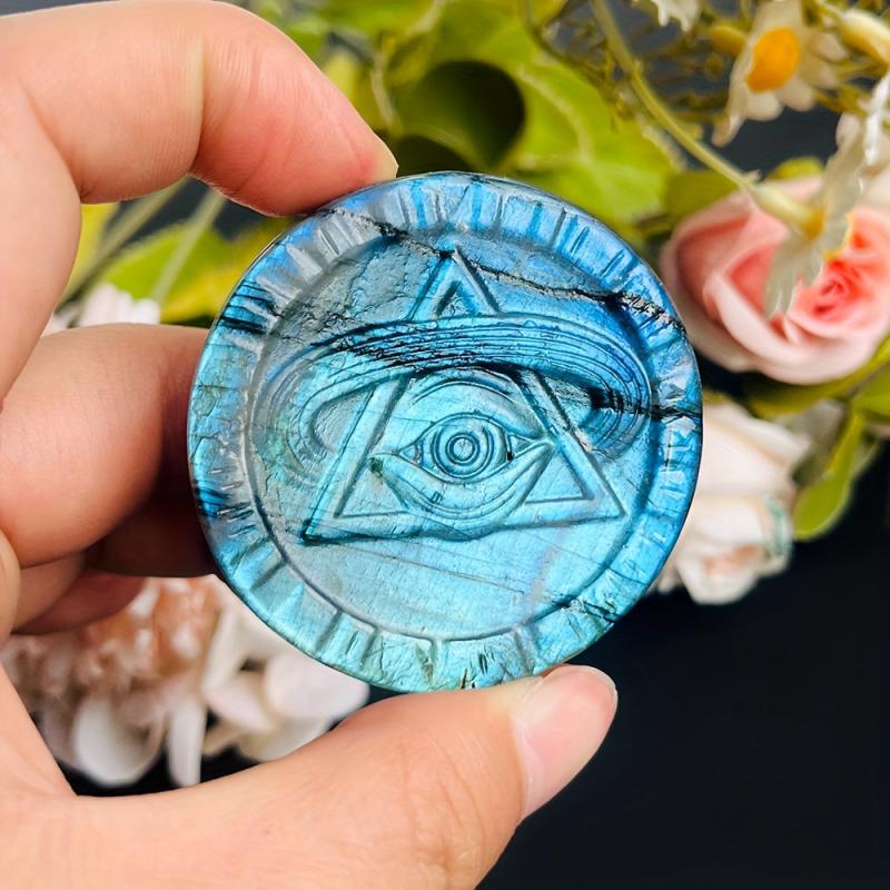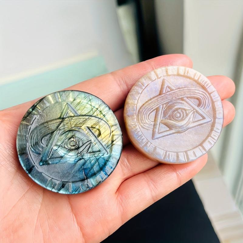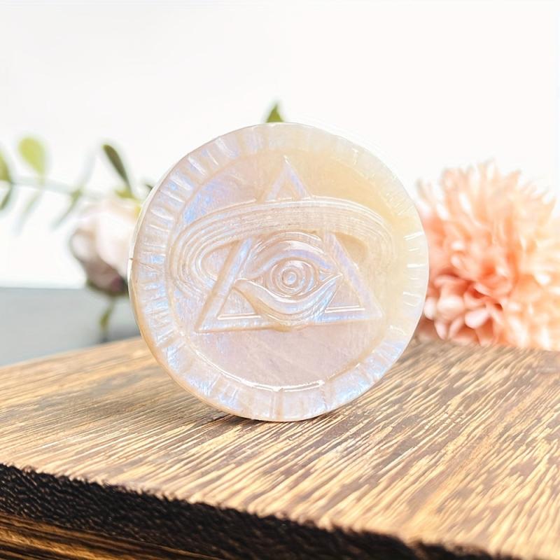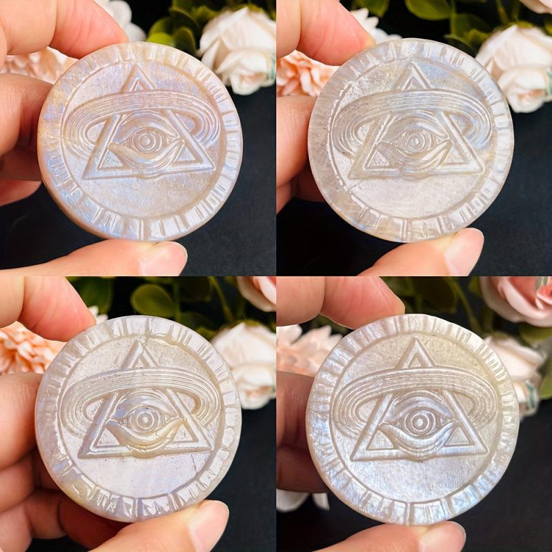 This mystical Moonstone eye carving features rainbow iridescence, symbolizing wisdom and insight. A unique and enchanting piece for spiritual seekers.