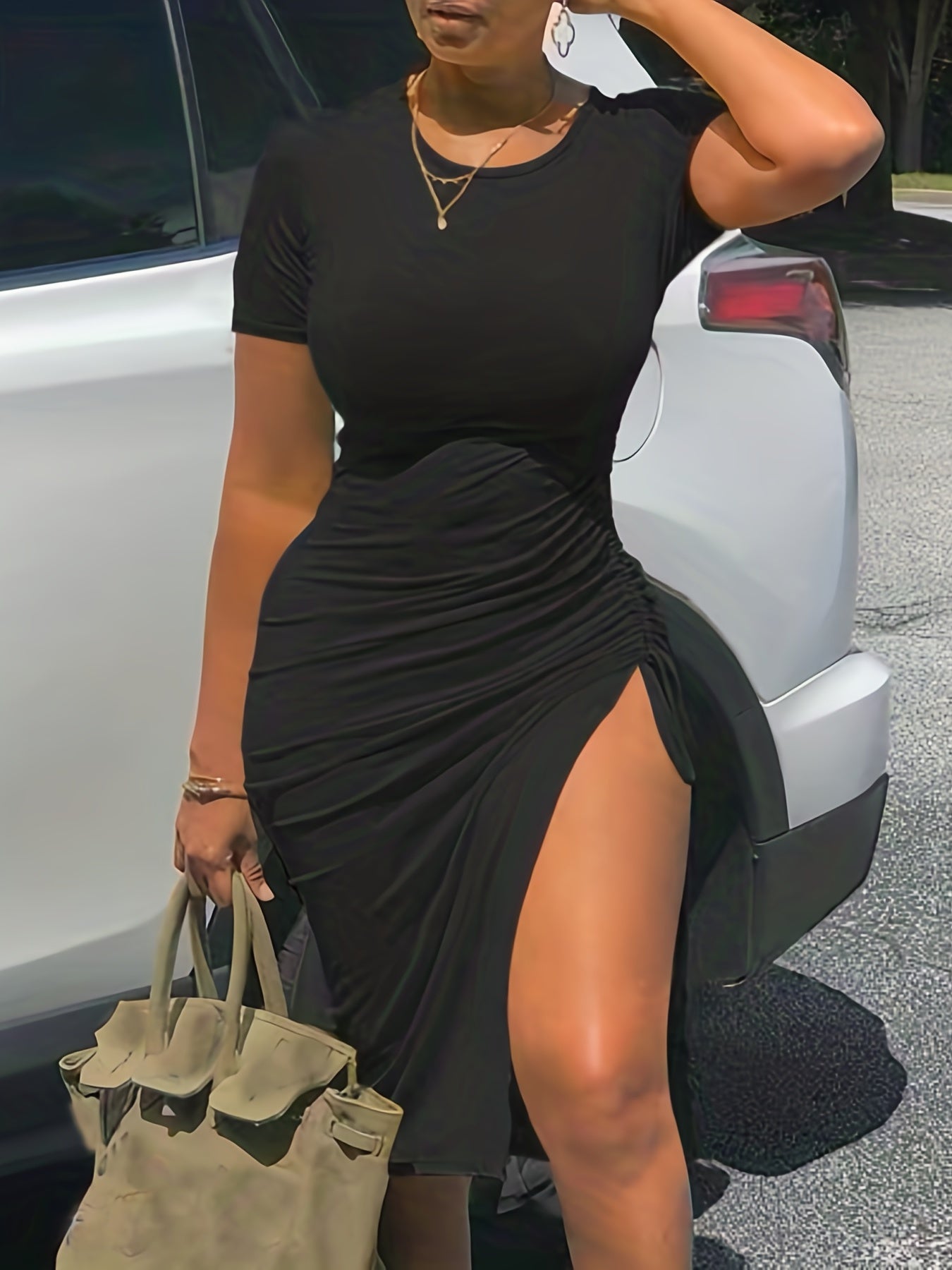 Ombre Ruched Dress Side Slit Short Sleeve Crew Neck Casual Dress
