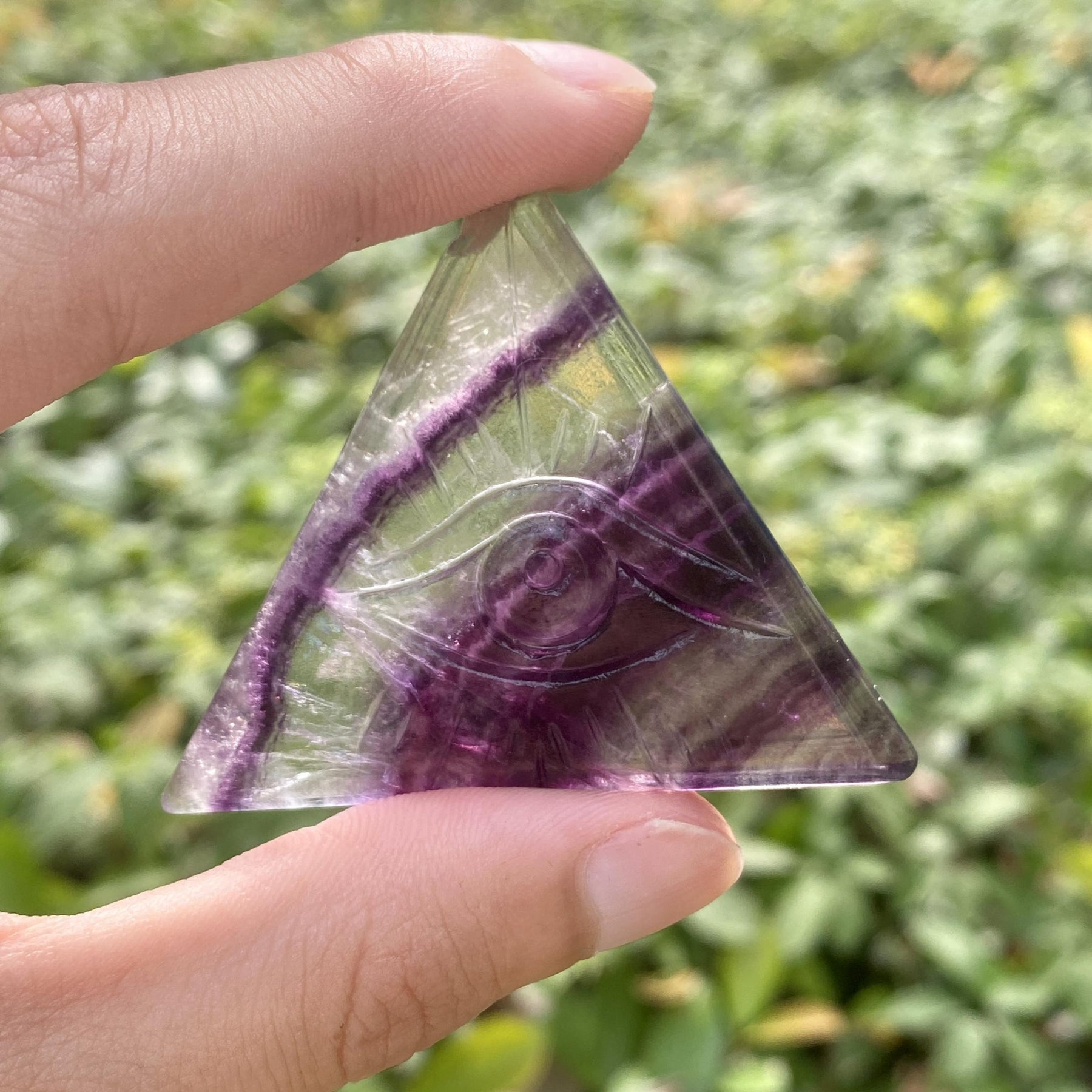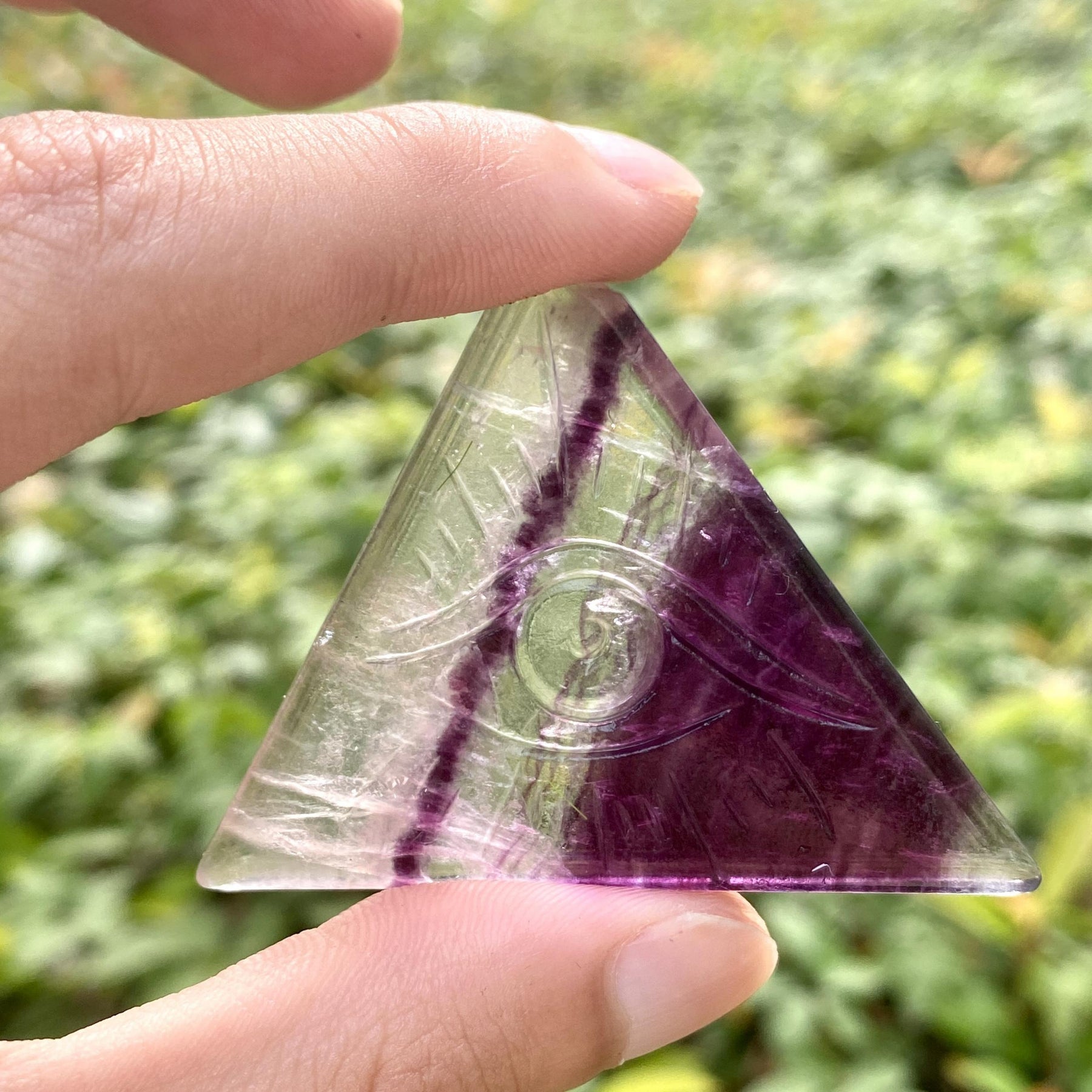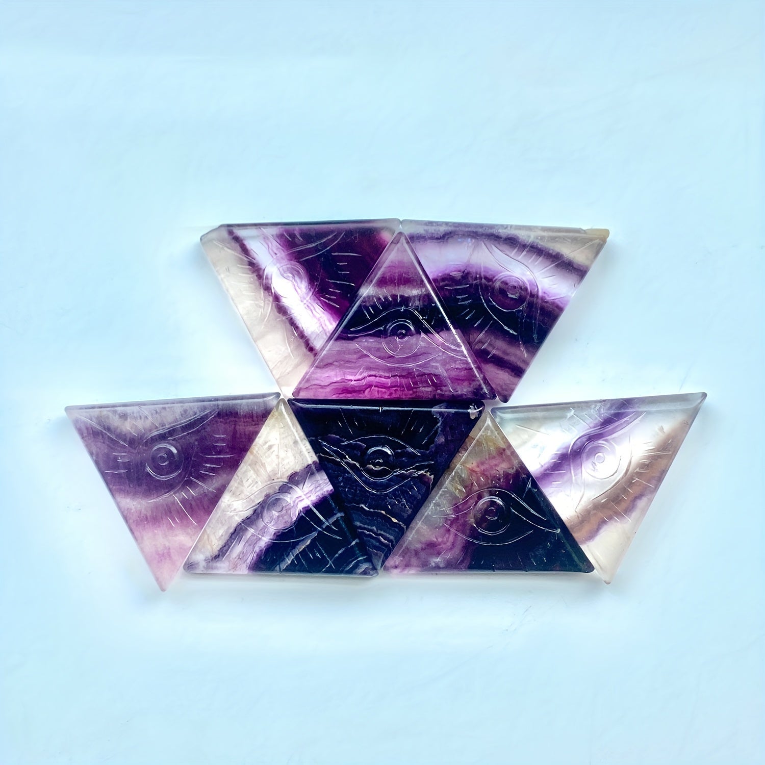 This natural rainbow fluorite triangle devil's eye carving is a stunning piece for desk decoration and healing. Its vibrant colors and unique design make it a wonderful addition to any space.