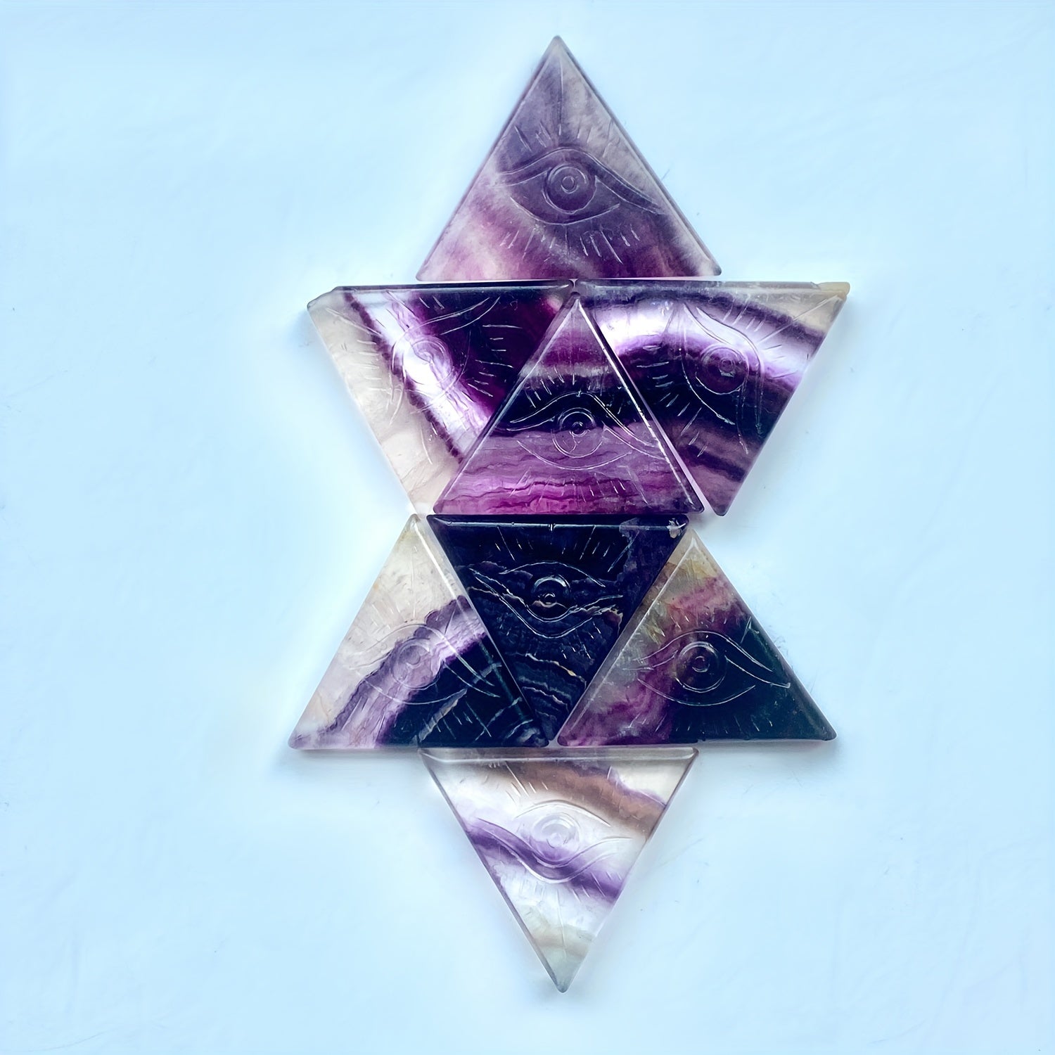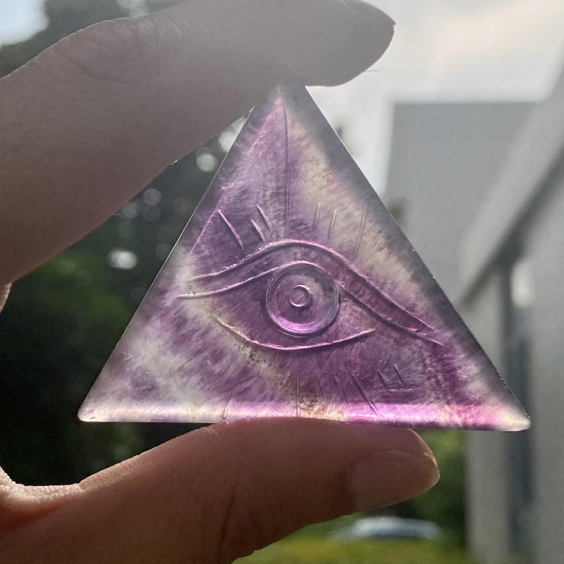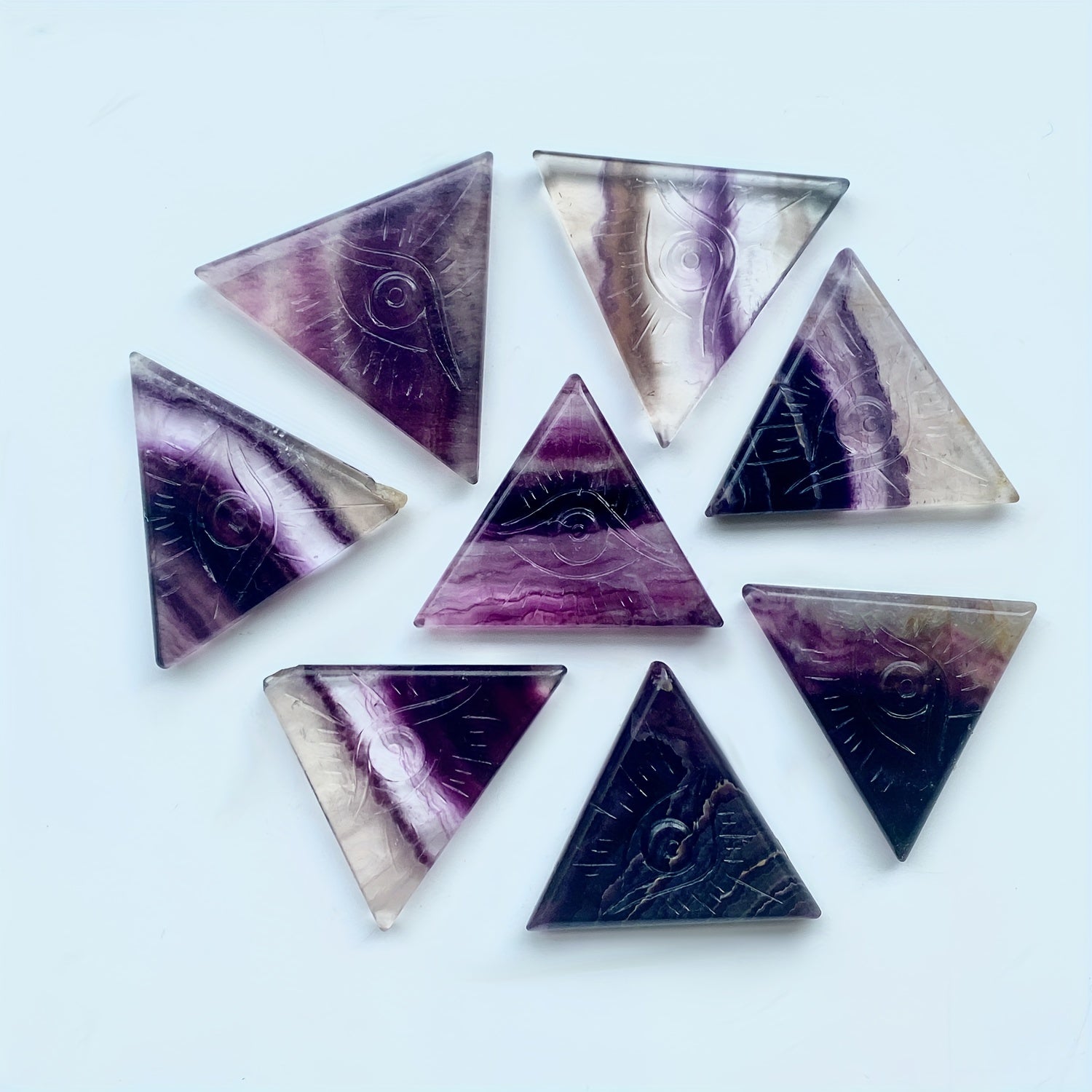 This natural rainbow fluorite triangle devil's eye carving is a stunning piece for desk decoration and healing. Its vibrant colors and unique design make it a wonderful addition to any space.