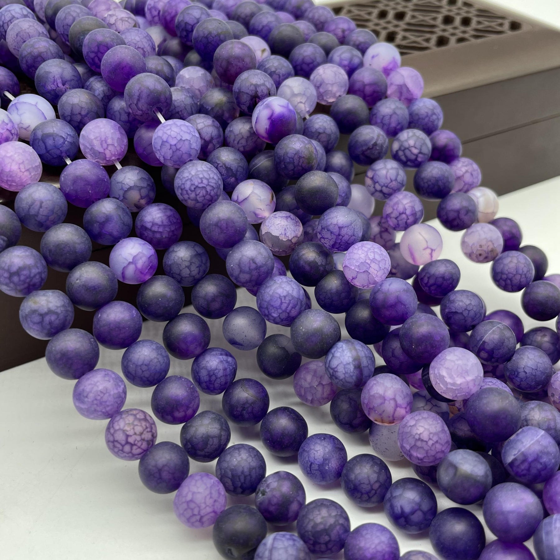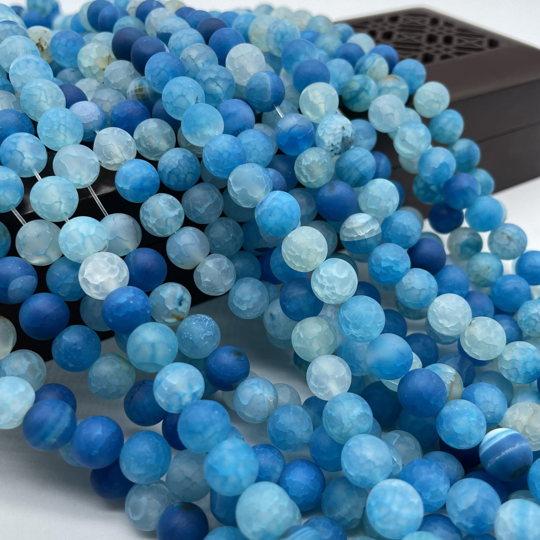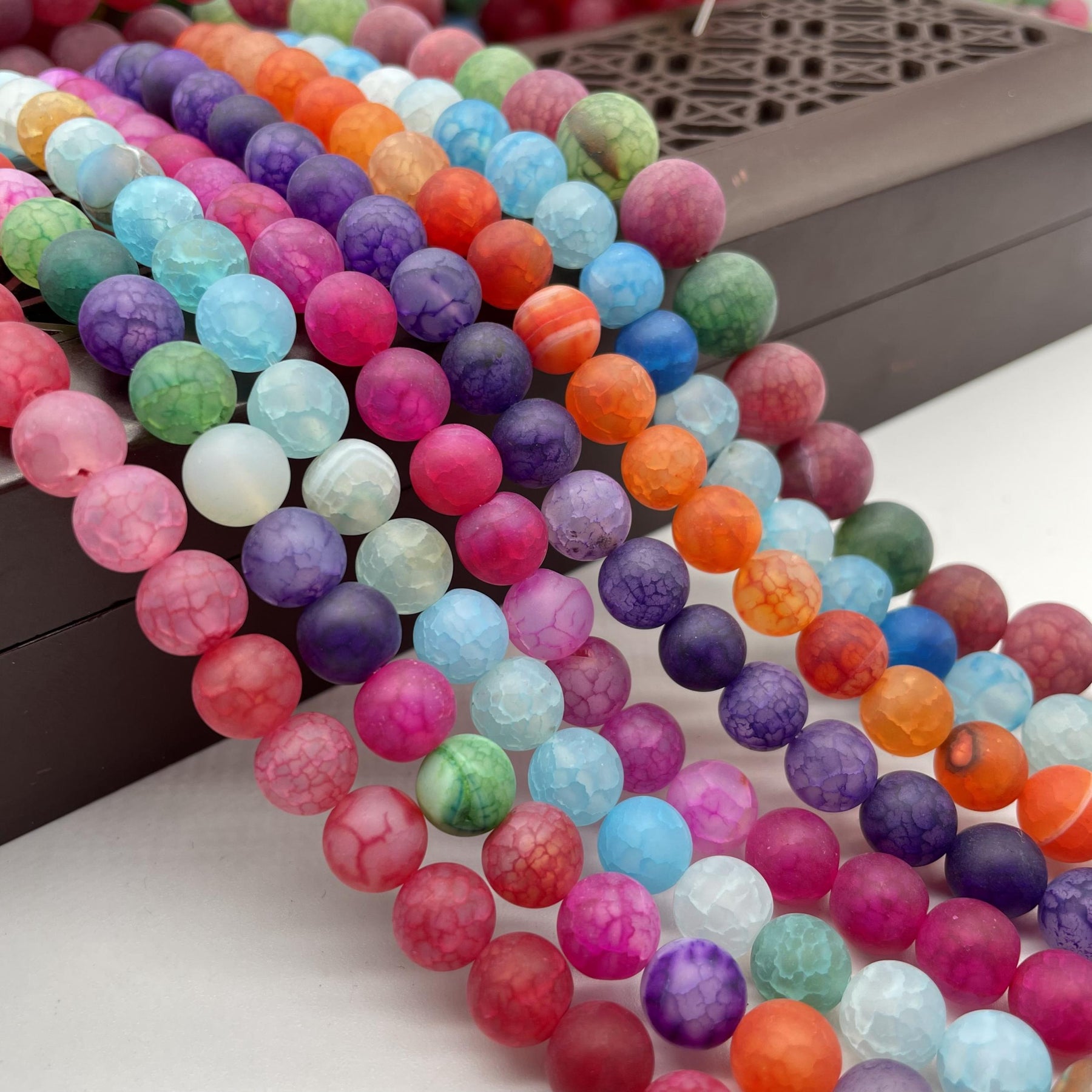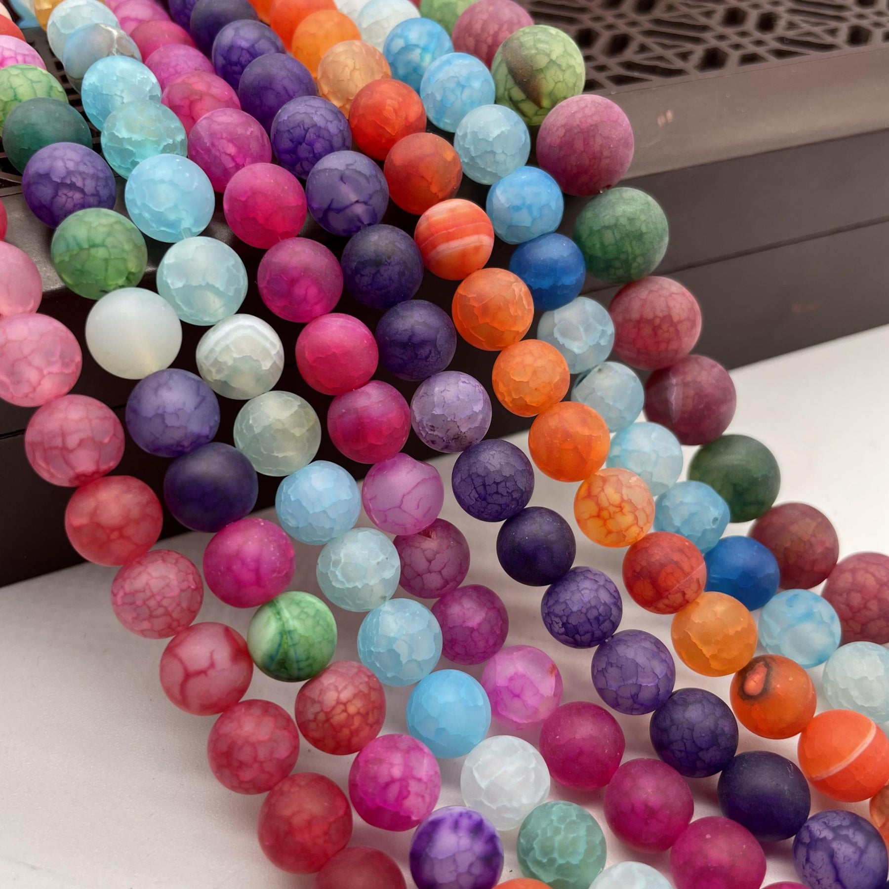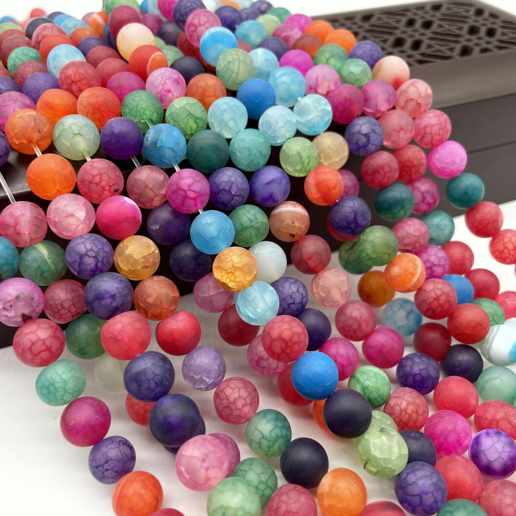 These frosted dragon scale agate round beads feature a beautiful mix of tourmaline colors. Each bead is unique and perfect for jewelry making projects.